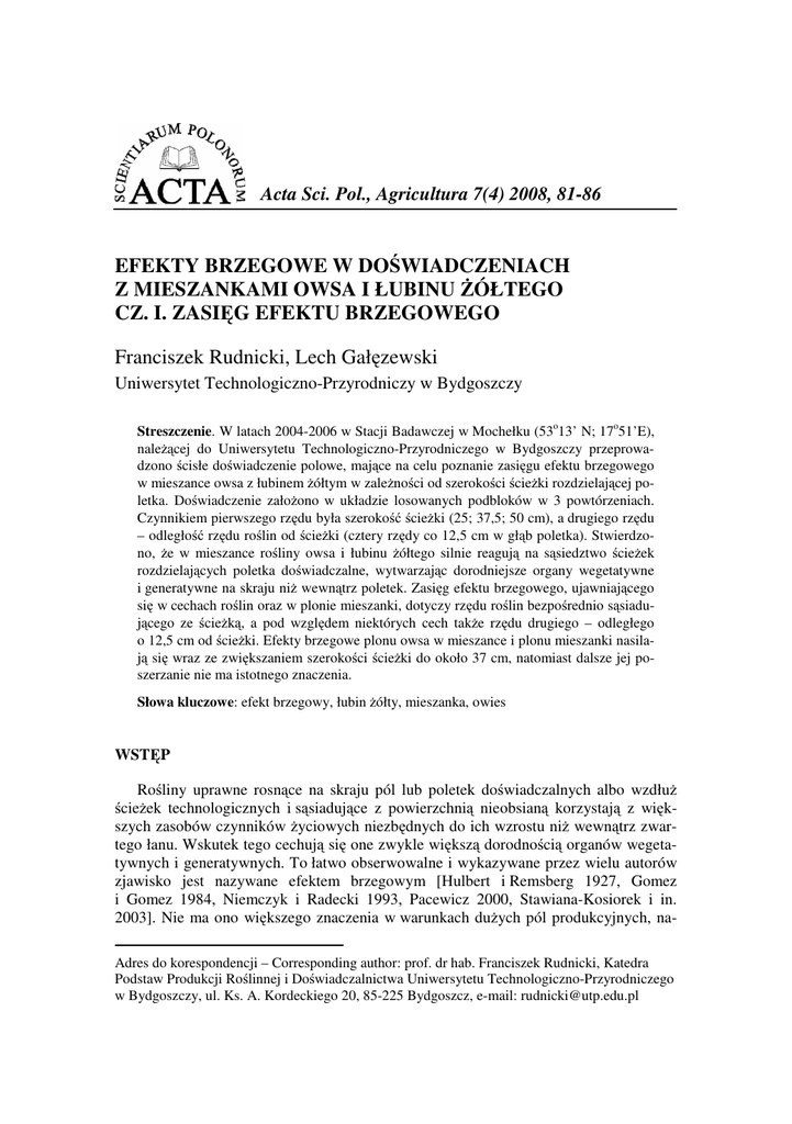 Acta Sci. Pol., Agricultura 7(4) 2008, 81-86 EFEKTY BRZEGOWE W DOĝWIADCZENIACH Z MIESZANKAMI OWSA I ŁUBINU ĩÓŁTEGO CZ. I. ZASIĉG EFEKTU BRZEGOWEGO Franciszek Rudnicki, Lech GałĊzewski Uniwersytet Technologiczno-Przyrodniczy w Bydgoszczy1 Streszczenie. W latach 2004-2006 w Stacji Badawczej w Mochełku (53o13’ N; 17o51’E), naleĪącej do Uniwersytetu Technologiczno-Przyrodniczego w Bydgoszczy przeprowadzono Ğcisłe doĞwiadczenie polowe, mające na celu poznanie zasiĊgu efektu brzegowego w mieszance owsa z łubinem Īółtym w zaleĪnoĞci od szerokoĞci ĞcieĪki rozdzielającej poletka. DoĞwiadczenie załoĪono w układzie losowanych podbloków w 3 powtórzeniach. Czynnikiem pierwszego rzĊdu była szerokoĞü ĞcieĪki (25; 37,5; 50 cm), a drugiego rzĊdu – odległoĞü rzĊdu roĞlin od ĞcieĪki (cztery rzĊdy co 12,5 cm w głąb poletka). Stwierdzono, Īe w mieszance roĞliny owsa i łubinu Īółtego silnie reagują na sąsiedztwo ĞcieĪek rozdzielających poletka doĞwiadczalne, wytwarzając dorodniejsze organy wegetatywne i generatywne na skraju niĪ wewnątrz poletek. ZasiĊg efektu brzegowego, ujawniającego siĊ w cechach roĞlin oraz w plonie mieszanki, dotyczy rzĊdu roĞlin bezpoĞrednio sąsiadującego ze ĞcieĪką, a pod wzglĊdem niektórych cech takĪe rzĊdu drugiego – odległego o 12,5 cm od ĞcieĪki. Efekty brzegowe plonu owsa w mieszance i plonu mieszanki nasilają siĊ wraz ze zwiĊkszaniem szerokoĞci ĞcieĪki do około 37 cm, natomiast dalsze jej poszerzanie nie ma istotnego znaczenia. Słowa kluczowe: efekt brzegowy, łubin Īółty, mieszanka, owies WSTĉP RoĞliny uprawne rosnące na skraju pól lub poletek doĞwiadczalnych albo wzdłuĪ ĞcieĪek technologicznych i sąsiadujące z powierzchnią nieobsianą korzystają z wiĊkszych zasobów czynników Īyciowych niezbĊdnych do ich wzrostu niĪ wewnątrz zwartego łanu. Wskutek tego cechują siĊ one zwykle wiĊkszą dorodnoĞcią organów wegetatywnych i generatywnych. To łatwo obserwowalne i wykazywane przez wielu autorów zjawisko jest nazywane efektem brzegowym [Hulbert i Remsberg 1927, Gomez i Gomez 1984, Niemczyk i Radecki 1993, Pacewicz 2000, Stawiana-Kosiorek i in. 2003]. Nie ma ono wiĊkszego znaczenia w warunkach duĪych pól produkcyjnych, naAdres do korespondencji – Corresponding author: prof. dr hab. Franciszek Rudnicki, Katedra Podstaw Produkcji RoĞlinnej i DoĞwiadczalnictwa Uniwersytetu Technologiczno-Przyrodniczego w Bydgoszczy, ul. Ks. A. Kordeckiego 20, 85-225 Bydgoszcz, e-mail: [email protected] 82 F. Rudnicki, L. GałĊzewski tomiast w doĞwiadczalnictwie rolniczym znacząco wpływa na dokładnoĞü oceny plonu i innych cech roĞlin zbieranych z poletek. W zasiewach jednogatunkowych nasilenie tego zjawiska pozostaje m.in. w związku z rodzajem roĞliny uprawnej, szerokoĞcią ĞcieĪki, gĊstoĞcią i kierunkiem siewu roĞlin wzglĊdem stron Ğwiata [Szmigiel 1998, Pacewicz 2000]. W zasiewach mieszanych te efekty mogą byü modyfikowane przez konkurencjĊ miĊdzygatunkową roĞlin stanowiących mieszankĊ i ujawniaü siĊ niejednakowo w cechach tych gatunków. W literaturze brak jest informacji o efekcie brzegowym w zasiewach mieszanych, dlatego podjĊto próbĊ oceny tego zjawiska w mieszankach owsa z łubinem Īółtym i jego znaczenia dla błĊdów oceny cech roĞlin na poletkach. Celem tej czĊĞci pracy było poznanie zasiĊgu efektu brzegowego w głąb poletek doĞwiadczalnych w zaleĪnoĞci od szerokoĞci ĞcieĪki rozdzielającej poletka. MATERIAŁ I METODY Materiał danych Ĩródłowych uzyskano z doĞwiadczenia polowego przeprowadzonego w latach 2004-2006 w Stacji Badawczej w Mochełku (53o13’ N; 17o51’E), naleĪącej do Uniwersytetu Technologiczno-Przyrodniczego w Bydgoszczy, na glebie kompleksu Īytniego dobrego. Czynnikami doĞwiadczalnymi, z trzema powtórzeniami, były: – szerokoĞü ĞcieĪki – 25; 37,5; 50 cm, – odległoĞü od ĞcieĪki – 1., 2., 3., 4. rząd roĞlin od ĞcieĪki w głąb poletka. MieszankĊ owsa z łubinem wysiewano w proporcji: 280 kiełkujących ziaren owsa (odmiana Hetman) i 75 nasion łubinu Īółtego (odmiana Lidar) na 1 m2. Poletka były usytuowane dłuĪszym bokiem w kierunku północ – południe. Siewu dokonywano w rozstawie co 12,5 cm. Przedplonem doĞwiadczenia był jĊczmieĔ jary. NawoĪenie stosowano przedsiewnie w dawkach: 60 kg N·ha-1, 30 kg P·ha-1, 66 kg K·ha-1. PielĊgnacja zasiewów obejmowała zwalczanie chwastów herbicydem Afalon 450 SC, stosowanym bezpoĞrednio po siewie w dawce 1 dm3·ha-1. Po pełnych wschodach roĞlin wyznaczono jednostki eksperymentalne. Odpowiednie szerokoĞci ĞcieĪek uzyskano poprzez usuniĊcie odpowiednio 2, 3, lub 4 rzĊdów wschodzących roĞlin mieszanki. JednostkĊ eksperymentalną stanowił rząd roĞlin o długoĞci 12 m (1,5 m2). Jednoznaczne przydzielenie roĞliny do danego rzĊdu uzyskano poprzez rozdzielenie rzĊdów sznurkami. W fazie 2-3 liĞci u owsa i około 10 dni póĨniej w przypadku łubinu wykonywano ocenĊ obsady roĞlin kaĪdego z gatunków poprzez zliczanie wszystkich roĞlin na całej długoĞci rzĊdów. Analogicznie dokonano oceny obsady roĞlin łubinu oraz wiech owsa przed ich zbiorem. W fazie koĔca wiechowania wykonano pomiar stopnia zazielenienia liĞci owsa przy uĪyciu N-testera firmy Hydro. W fazie dojrzałoĞci mlecznej owsa na 20 roĞlinach z kaĪdego poletka dokonywano nastĊpujących pomiarów cech: owsa – masy nadziemnej roĞliny, wysokoĞci najdłuĪszego ĨdĨbła, rozkrzewienia produkcyjnego, oraz łubinu – masy roĞliny, wysokoĞci pĊdu głównego, liczby rozgałĊzieĔ pierwszego rzĊdu, liczby strąków na roĞlinie i masy strąków na roĞlinie. Zbioru roĞlin dokonywano rĊcznie, w pełnej dojrzałoĞci obu komponentów mieszanki, Ğcinając je przy ziemi osobno z kaĪdego rzĊdu. Wszystkie roĞliny danego gatunku zebrane z długoĞci 12 m rzĊdu słuĪyły do oceny nastĊpujących cech: owies – plonu biomasy ro