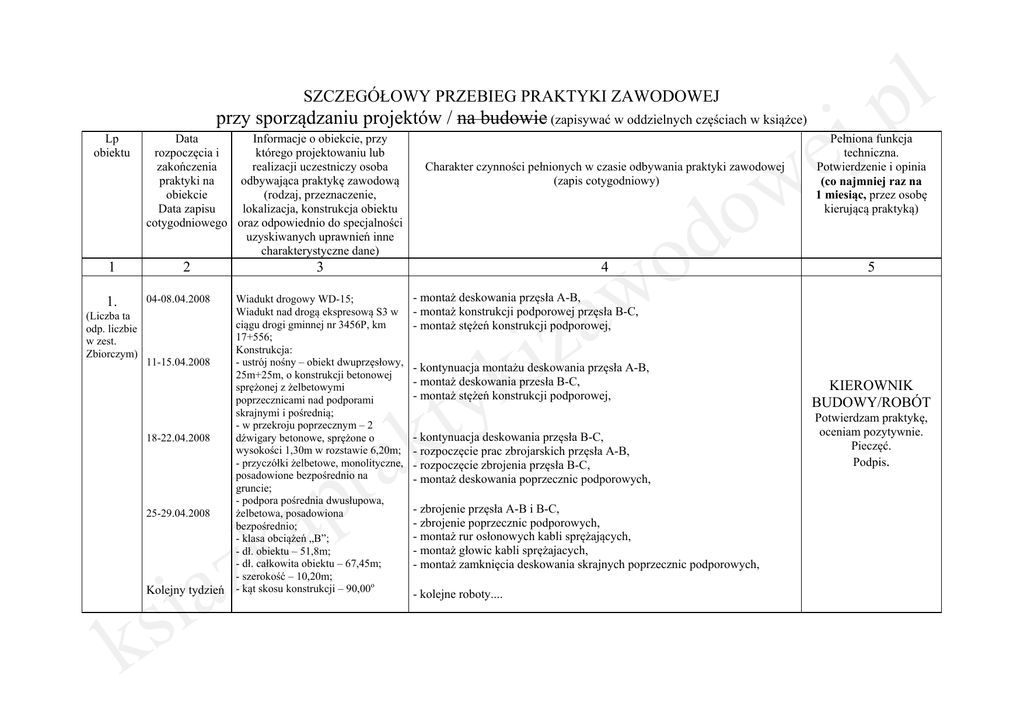 SZCZEGÓŁOWY PRZEBIEG PRAKTYKI ZAWODOWEJ Lp obiektu Data Informacje o obiekcie, przy rozpoczęcia i którego projektowaniu lub zakończenia realizacji uczestniczy osoba praktyki na odbywająca praktykę zawodową obiekcie (rodzaj, przeznaczenie, Data zapisu lokalizacja, konstrukcja obiektu cotygodniowego oraz odpowiednio do specjalności uzyskiwanych uprawnień inne charakterystyczne dane) 1 2 04-08.04.2008 1. (Liczba ta odp. liczbie w zest. Zbiorczym) 11-15.04.2008 18-22.04.2008 25-29.04.2008 3 Wiadukt drogowy WD-15; Wiadukt nad drogą ekspresową S3 w ciągu drogi gminnej nr 3456P, km 17+556; Konstrukcja: - ustrój nośny – obiekt dwuprzęsłowy, 25m+25m, o konstrukcji betonowej sprężonej z żelbetowymi poprzecznicami nad podporami skrajnymi i pośrednią; - w przekroju poprzecznym – 2 dźwigary betonowe, sprężone o wysokości 1,30m w rozstawie 6,20m; - przyczółki żelbetowe, monolityczne, posadowione bezpośrednio na gruncie; - podpora pośrednia dwusłupowa, żelbetowa, posadowiona bezpośrednio; - klasa obciążeń „B”; - dł. obiektu – 51,8m; - dł. całkowita obiektu – 67,45m; - szerokość – 10,20m; - kąt skosu konstrukcji – 90,00o s k 4 d o w a - montaż deskowania przęsła A-B, - montaż konstrukcji podporowej przęsła B-C, - montaż stężeń konstrukcji podporowej, z i k - kontynuacja montażu deskowania przęsła A-B, - montaż deskowania przesła B-C, - montaż stężeń konstrukcji podporowej, y t k a r p a k z ia Kolejny tydzień Pełniona funkcja techniczna. Potwierdzenie i opinia (co najmniej raz na 1 miesiąc, przez osobę kierującą praktyką) w o Charakter czynności pełnionych w czasie odbywania praktyki zawodowej (zapis cotygodniowy) - kontynuacja deskowania przęsła B-C, - rozpoczęcie prac zbrojarskich przęsła A-B, - rozpoczęcie zbrojenia przęsła B-C, - montaż deskowania poprzecznic podporowych, - zbrojenie przęsła A-B i B-C, - zbrojenie poprzecznic podporowych, - montaż rur osłonowych kabli sprężających, - montaż głowic kabli sprężajacych, - montaż zamknięcia deskowania skrajnych poprzecznic podporowych, - kolejne roboty.... l .p j e przy sporządzaniu projektów / na budowie (zapisywać w oddzielnych częściach w książce) 5 KIEROWNIK BUDOWY/ROBÓT Potwierdzam praktykę, oceniam pozytywnie. Pieczęć. Podpis.