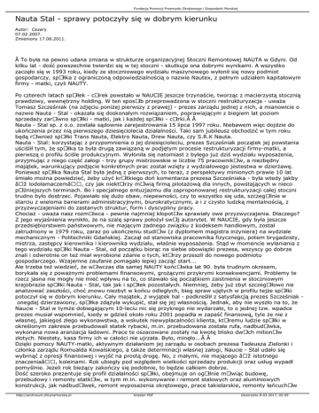 Fundacja Promocji Przemysłu Okrętowego i Gospodarki Morskiej Nauta Stal - sprawy potoczyły się w dobrym kierunku Autor: Cezary 07.02.2007. Zmieniony 17.06.2011.  To była na pewno udana zmiana w strukturze organizacyjnej Stoczni Remontowej NAUTA w Gdyni. Od kilku lat - dość powszechnie twierdzi się w tej stoczni - skutkuje ona dobrymi wynikami. A wszystko zaczęło się w 1993 roku, kiedy ze stoczniowego wydziału maszynowego wyłonił się nowy podmiot gospodarczy, spÃłłka z ograniczoną odpowiedzialnością o nazwie Nautex, z pełnym udziałem kapitałowym firmy - matki, czyli NAUTY. Po czterech latach spÃłłek - cÃłrek powstało w NAUCIE jeszcze trzynaście, tworząc z macierzystą stocznią prawdziwy, wewnętrzny holding. W ten sposÃłb przeprowadzona w stoczni restrukturyzacja - uważa Tomasz Szcześniak (na zdjęciu poniżej pierwszy z prawej) - prezes zarządu jednej z nich, a mianowicie o nazwie Nauta - Stal - okazała się doskonałym rozwiązaniem, poprawiającym z biegiem lat poziom sprzedaży zarÃłwno spÃłłki - matki, jak i każdej spÃłłki - cÃłrki.  Nauta - Stal sp. z o.o. została sądownie zarejestrowania 15 lipca 1997 roku. Niebawem więc dojdzie do ukończenia przez nią pierwszego dziesięciolecia działalności. Taki sam jubileusz obchodzić w tym roku będą rÃłwnież spÃłłki Trans Nauta, Elektro Nauta, Drew Nauta, czy S.R.K Nauta. Nauta - Stal: korzystając z przypomnienia o jej dziesięcioleciu, prezes Szcześniak początek jej powstania uściślił tym, że spÃłłka ta była drugą zawiązaną w podjętym procesie restrukturyzacji firmy-matki, a pierwszą o profilu ściśle produkcyjnym. Wyłoniła się natomiast z byłego już dziś wydziału wyposażenia, przyjmując z niego część załogi - trzy grupy mistrzowskie w liczbie 75 pracownikÃłw, a niezbędny majątek, warunkujący podjęcie konkretnych prac został wzięty z wydziałowego jestestwa w dzierżawę. Ponieważ spÃłłka Nauta Stal była jedną z pierwszych, to teraz, z perspektywy minionych prawie 10 lat śmiało można powiedzieć, żeby użyć krÃłtkiego doń komentarza prezesa Szcześniaka - była wtedy jakby „lodołamaczem―, czy jak niektÃłrzy mÃłwią firmą pilotażową dla innych, powstających w nieco pÃłźniejszych terminach. Bo i specjalnego entuzjazmu dla zaproponowanej restrukturyzacji całej stoczni trudno było dostrzec. Pojawiało się dużo obaw, niepewności, czy to wszystko się uda, szczegÃłlnie w starciu z wieloma barierami administracyjnymi, biurokratycznymi, a i z czysto ludzką mentalnością, z przyzwyczajeniami do zastanych struktur, form i dyscypliny pracy. Chociaż - uważa nasz rozmÃłwca - pewnie najmniej kłopotÃłw sprawiały owe przyzwyczajenia. Dlaczego? Z jego wyjaśnienia wynikło, że na szalę sprawy położył swÃłj autorytet. W NAUCIE, gdy była jeszcze przedsiębiorstwem państwowym, nie mającym żadnego związku z kodeksem handlowym, został zatrudniony w 1979 roku, zaraz po ukończeniu studiÃłw (z dyplomem magistra inżyniera) na wydziale mechanicznym - Politechniki Gdańskiej. Zaczął od stanowiska pracownika fizycznego, potem brygadzisty, mistrza, zastępcy kierownika i kierownika wydziału, właśnie wyposażenia. Stąd w momencie wyłaniania z tego wydziału spÃłłki Nauta - Stal, od początku biorąc na siebie obowiązki prezesa, wszyscy go dobrze znali i odwrotnie on też miał wyrobione zdanie o tych, ktÃłrzy przeszli do nowego podmiotu gospodarczego. Wzajemne zaufanie pomagało lepiej zacząć start... Ale trzeba też wiedzieć, że wÃłwczas dla samej NAUTY końcÃłwka lat 90. była trudnym okresem, borykała się z poważnymi problemami finansowymi, grożącymi przykrymi konsekwencjami. Problemy te rzecz jasna nie mogły nie mieć wpływu na to, co stawało się początkiem zaistnienia w stoczniowym krajobrazie spÃłłki Nauta - Stal, tak jak i spÃłłek pozostałych. Niemniej, żeby już zbyt szczegÃłłowo nie analizować zaszłości, choć znowu niezbyt w końcu odległych, bieg spraw ujętych w profilu tejże spÃłłki potoczył się w dobrym kierunku. Cały majątek, z wyjątek hal - podkreślił z satysfakcją prezes Szcześniak onegdaj dzierżawiony, spÃłłka zdążyła wykupić, stał się jej własnością. Jednak, aby nie wyszło na to, że Naucie - Stal w tymże dobiegającym 10-leciu nic się przykrego nie wydarzało, to o jednej tzw. wpadce prezes musiał wspomnieć, kiedy w gdzieś około roku 2001 popadła w zapaść finansową, tyle że nie z własnej, jakiegoś złego wykonawstwa, a wskutek niewypłacalności klienta, ktÃłremu ludzie spÃłłki w określonym zakresie przebudowali statek rybacki, m.in. przebudowana została rufa, nadbudÃłwka, wykonana nowa aranżacja ładowni. Prace te oszacowane zostały na kwotę blisko dwÃłch milionÃłw złotych. Niestety, kasa firmy ich w całości nie ujrzała. Było, minęło...  Dzięki pomocy NAUTY-matki, aktywnym działaniom jej zarządu w osobach prezesa Tadeusza Zielonki i członka zarządu Romualda Kowalskiego, a także determinacji własnej załogi, Naucie - Stal udało się wybrnąć z opresji finansowej i wyjść na prostą drogę. No, z małymi, nie mającego „istotnego znaczenia―, koleinami. Rok ubiegły pod względem wielkości sprzedaży produkcji oraz usług wypadł pomyślnie. Jeżeli rok bieżący zakończy się podobnie, to będzie całkiem dobrze. Dość szeroko prezentuje się profil działalności spÃłłki, obejmuje on ogÃłlnie mÃłwiąc budowę, przebudowy i remonty statkÃłw, w tym m.in. wykonywanie i remont stalowych oraz aluminiowych konstrukcji, jak nadbudÃłwek, remont wyposażenia okrętowego, prace takielarskie, remonty łańcuchÃłw http://archiwum.oficynamorska.pl Kreator PDF Utworzono 8-03-2017, 05:09 Fundacja Promocji Przemysłu Okrętowego i Gospodarki Morskiej kotwicznych, pokryw lukowych. Jako samodzielny podmiot spÃłłka ma dużą swobodę w pozyskiwaniu klientÃłw, j