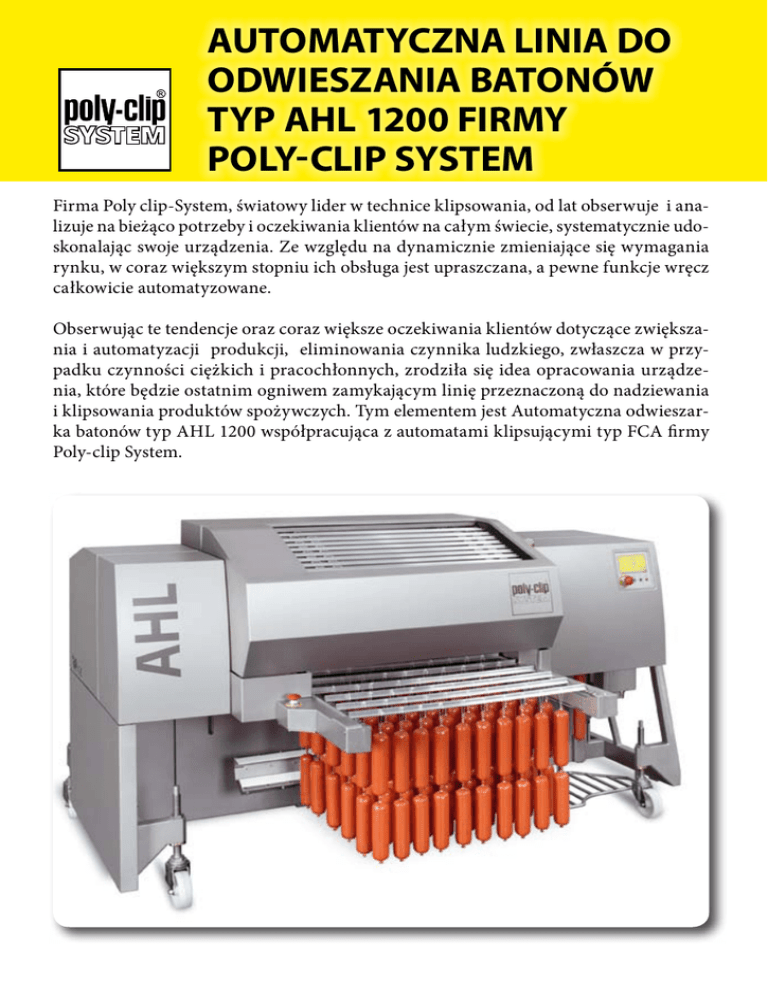 Automatyczna linia do odwieszania batonów typ ahl 1200 firmy poly-clip system Firma Poly clip-System, światowy lider w technice klipsowania, od lat obserwuje i analizuje na bieżąco potrzeby i oczekiwania klientów na całym świecie, systematycznie udoskonalając swoje urządzenia. Ze względu na dynamicznie zmieniające się wymagania rynku, w coraz większym stopniu ich obsługa jest upraszczana, a pewne funkcje wręcz całkowicie automatyzowane. Obserwując te tendencje oraz coraz większe oczekiwania klientów dotyczące zwiększania i automatyzacji produkcji, eliminowania czynnika ludzkiego, zwłaszcza w przypadku czynności ciężkich i pracochłonnych, zrodziła się idea opracowania urządzenia, które będzie ostatnim ogniwem zamykającym linię przeznaczoną do nadziewania i klipsowania produktów spożywczych. Tym elementem jest Automatyczna odwieszarka batonów typ AHL 1200 współpracująca z automatami klipsującymi typ FCA firmy Poly-clip System. Głównym celem tego urządzenia jest automatyczny odbiór zaklipsowanych batonów oraz ich odwieszenie na kije wędzarnicze, tak aby rola operatora sprowadzała się tylko do odebrania kija z ułożonymi batonami z bufora odwieszarki (pojemność 8 kijów) i założenia go na wózek wędzarniczy. Dzięki zastosowaniu odwieszarki AHL 1200 sprzęgniętej z klipsownicą FCA możemy faktycznie mówić o pracy ciągłej linii i wyeliminowaniu przerw w pracy klispownicy, potrzebnych do tej pory na ręczny odbiór i zakładanie batonów na kije wędzarnicze przez operatora, wprost ze stołu. Ta zaleta powoduje, że możliwe jest zwiększenie wydajności produkcji przy jednoczesnym zmniejszeniu czasu przerw w całym cyklu produkcyjnym linii. Czynniki te mają znaczący wpływa na optymalizację kosztów i wydajności procesu produkcji, co jest zwłaszcza odczuwalne przy dużej skali powtarzalnej, mono produkcji. Ten sposób pracy podnosi również standardy higieniczne procesu klipsowania. Nie jest już potrzebny stół używany do gromadzenia batonów, na którym produkt miał czasami styczność z wodą, resztkami produktu etc. Ograniczono również do minimum bezpośredni kontakt operatora z batonami zaklipsowanego produktu. Odwieszarka AHL 1200, zwłaszcza w przypadku długich i ciężkich batonów, wymiernie uproszcza, ułatwia i przyspiesza pracę operatora linii. Do linii odwieszającej mogą być wykorzystywane wszystkie metalowe kije wędzarnicze o długości maksymalnej do 1200mm oraz średnicy 33mm. Pojedyncze batony odwieszanych wędlin mogą mieć wagę do 3,5kg, a łańcuchy kiełbas długość do 880mm. Odwieszarka AHL 1200 posiada magazyn kijów ładowanych od frontu urządzenia co zapewnia ciągłość pracy linii. Jej szybkość pracy dostosowana jest do tempa klipsownicy i może osiągnąć prędkość do 100 taktów/min w zależności od wielkości batonu. Istnieje możliwość umieszczenia na jednym kiju od 6 do 38 sztuk batonów w zależności o ich kalibru, co ustawiane jest w programie na sterowniku urządzenia. Urządzenie jest łatwe w obsłudze i konserwacji. Jego ustawienie lub zmianę pozycji ułatwiają cztery koła manewrowe z blokadą i regulacją wysokości. Zapraszamy do zapoznania się ze szczegółową ofertą i kontakt z jednym z naszych regionalnych przedstawicieli. Zapraszamy do współpracy! innowacyjny • niezawodny • wiodący PROMAR Przedsiębiorstwo Produkcyjno Handlowe Sp. z o.o. 05-092 Łomianki, ul. 11-Listopada 96 tel. +48 22 768 64 00 do 09, fax: +48 22 768 64 10 [email protected], www. promar.pl