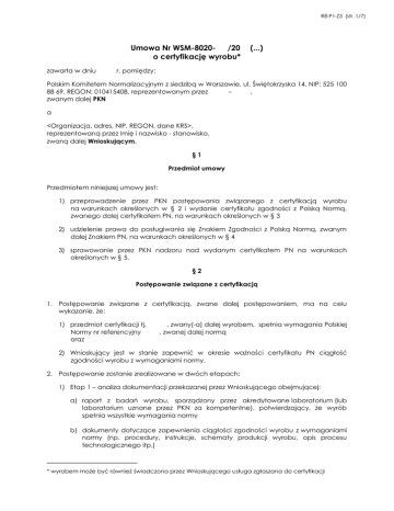 R8-P1-Z3 (str. 1/7) Umowa Nr WSM-8020/20 o certyfikację wyrobu* zawarta w dniu (...) r. pomiędzy: Polskim Komitetem Normalizacyjnym z siedzibą w Warszawie, ul. Świętokrzyska 14, NIP: 525 100 88 69, REGON: 010415408, reprezentowanym przez – , zwanym dalej PKN a <Organizacja, adres, NIP, REGON, dane KRS>, reprezentowaną przez Imię i nazwisko - stanowisko, zwaną dalej Wnioskującym. §1 Przedmiot umowy Przedmiotem niniejszej umowy jest: 1) przeprowadzenie przez PKN postępowania związanego z certyfikacją wyrobu na warunkach określonych w § 2 i wydanie certyfikatu zgodności z Polską Normą, zwanego dalej certyfikatem PN, na warunkach określonych w § 3 2) udzielenie prawa do posługiwania się Znakiem Zgodności z Polską Normą, zwanym dalej Znakiem PN, na warunkach określonych w § 4 3) sprawowanie przez PKN nadzoru nad wydanym certyfikatem PN na warunkach określonych w § 5. §2 Postępowanie związane z certyfikacją 1. Postępowanie związane z certyfikacją, zwane dalej postępowaniem, ma na celu wykazanie, że: 1) przedmiot certyfikacji tj. Normy nr referencyjny oraz , zwany(-a) dalej wyrobem, spełnia wymagania Polskiej , zwanej dalej normą 2) Wnioskujący jest w stanie zapewnić w okresie ważności certyfikatu PN ciągłość zgodności wyrobu z wymaganiami normy. 2. Postępowanie zostanie zrealizowane w dwóch etapach: 1) Etap 1 – analiza dokumentacji przekazanej przez Wnioskującego obejmującej: a) raport z badań wyrobu, sporządzony przez akredytowane laboratorium (lub laboratorium uznane przez PKN za kompetentne), potwierdzający, że wyrób spełnia wszystkie wymagania normy b) dokumenty dotyczące zapewnienia ciągłości zgodności wyrobu z wymaganiami normy (np. procedury, instrukcje, schematy produkcji wyrobu, opis procesu technologicznego itp.) _________________________ * wyrobem może być również świadczona przez Wnioskującego usługa zgłaszana do certyfikacji R8-P1-Z3 (str. 2/7) c) kopie ważnych certyfikatów wdrożonych Systemów i stosowanych dobrych praktyk1, jeśli Wnioskujący je posiada d) wszystkie inne dokumenty uznane przez Wnioskującego za istotne dla procesu certyfikacji, w tym informacje o reklamacjach dotyczących wyrobu. 2) Etap 2 – badanie auditowe przeprowadzone przez PKN u Wnioskującego, z zastrzeżeniem ust. 4. 3. Postępowanie zostanie przeprowadzone w następujących terminach: 1) Etap 1 – w terminie 14 dni roboczych od daty otrzymania kompletnej dokumentacji potwierdzającej zgodność wyrobu z wymaganiami normy oraz zdolność Wnioskującego do ciągłego zapewnienia zgodności wyrobu z wymaganiami normy z zastrzeżeniem, że Wnioskujący dostarczy dokumentację w terminie 7 dni od podpisania niniejszej umowy, 2) Etap 2 - w terminie uzgodnionym przez Strony, jednak nie później niż 30 dni roboczych od zakończenia Etapu 1, na podstawie planu auditu, udostępnionego Wnioskującemu co najmniej 5 dni roboczych przed planowanym terminem badania auditowego. 4. PKN zastrzega sobie prawo do odstąpienia od przeprowadzenia Etapu 2 postępowania związanego z certyfikacją, jeżeli Wnioskujący: 1) podlega regularnym auditom, prowadzonym przez akredytowaną jednostkę certyfikującą, obejmującym swoim zakresem proces produkcji wyrobu i/lub wprowadzania go do obrotu oraz 2) dostarczy do PKN stosowny raport z ostatniego auditu przeprowadzonego przez tę jednostkę w terminie uzgodnionym przez Strony jednak nie później niż 7 dni roboczych od podpisania niniejszej umowy. 5. W terminie 14 dni roboczych od przeprowadzenia Etapu 2, PKN przekaże Wnioskującemu Raport z postępowania związanego z certyfikacją. 6. W przypadku stwierdzenia niezgodności, uniemożliwiających przyznanie certyfikatu PN, zostaną one przedstawione i opisane w Raporcie. 7. Wnioskujący w terminie uzgodnionym przez Strony podejmie działania korygujące i przedstawi PKN dowody potwierdzające usunięcie niezgodności, o których mowa w ust. 6. 8. W przypadku stwierdzenia przez zespół auditujący niezgodności, w odniesieniu do której weryfikacja skuteczności wdrożenia korekcji i/lub działań korygujących możliwa jest tylko poprzez dodatkową ocenę u Wnioskującego, PKN przeprowadzi: a) audit dodatkowy ograniczony, jedynie w odniesieniu do działań związanych z usunięciem takiej niezgodności - Wnioskujący pokryje wówczas każdorazowo koszty związane z delegacją zespołu auditującego (przejazdy i hotele), lub b) audit dodatkowy pełny, którego koszt Wnioskujący pokryje zgodnie z odrębnym aneksem do niniejszej umowy. Przykładowo: ISO 9001, Wewnętrzne Systemy Kontroli (WSK), Zakładowa Kontrola Produkcji (ZKP), ISO 14001, PN-N-18001, OHSAS 18001, ISO 22000, HACCP, GHP, GMP, IFS, BRC itp. 1 R8-P1-Z3 (str. 3/7) 9. W przypadku nieusunięcia przez Wnioskującego niezgodności, o których mowa w ust. 6, stosownie do zasad określonych w ust. 7, PKN odmawia przyznania certyfikatu. §3 Certyfikat PN 1. Certyfikat PN zostanie przyznany Wnioskującemu po spełnieniu następujących warunków: 1) przeprowadzone zostały wszystkie badania przewidziane w normie przez laboratorium akredytowane lub inne uznane przez PKN za kompetentne 2) wyniki wszystkich badań z wymaganiami normy są pozytywne i potwierdzają zgodność wyrobu 3) PKN potwierdził, że proces realizacji wyrobu i/lub wprowadzania go do obrotu lub udostępniania na rynku gwarantują zachowanie ciągłości zgodności z wymaganiami normy 4) nie stwierdzono w Raporcie z auditu niezgodności lub zostały usunięte stosownie do zapisów § 2 ust. 7 5) Wnioskujący wniósł opłaty w wysokości określonej w § 7 ust. 1. 2. Certyfikat PN zostanie wydany i przesłany do Wnioskującego w ciągu 3 dni od jego przyznania. 3. Wydany przez PKN certyfikat PN jest ważny przez trzy lata od jego przyznania i może być odnowiony na kolejne trzy lata, po podpisaniu odrębnej umowy. 4. PKN dokonuje rejestracji certyfikatu PN i jego upublicznienia poprzez umieszczenie odpowiedniej informac
