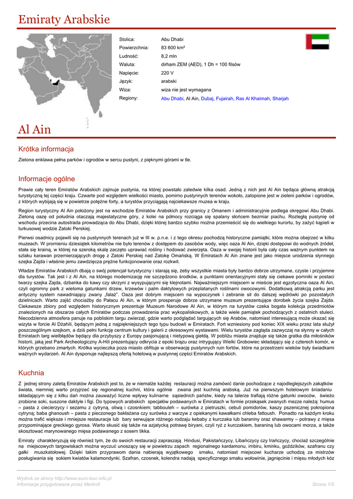 Emiraty Arabskie Stolica: Abu Dhabi Powierzchnia: 83 600 km² Ludność: 8,2 mln Waluta: dirham ZEM (AED), 1 Dh = 100 filsów Napięcie: 220 V Język: arabski Wiza: wiza nie jest wymagana Regiony: Abu Dhabi, Al Ain, Dubaj, Fujairah, Ras Al Khaimah, Sharjah Al Ain Krótka informacja Zielona enklawa pełna parków i ogrodów w sercu pustyni, z pięknymi górami w tle. Informacje ogólne Prawie cały teren Emiratów Arabskich zajmuje pustynia, na której powstało zaledwie kilka osad. Jedną z nich jest Al Ain będąca główną atrakcją turystyczną tej części kraju. Czwarte pod względem wielkości miasto, pomimo pustynnych terenów wokoło, zatopione jest w zieleni parków i ogrodów, z których wybijają się w powietrze potężne forty, a turystów przyciągają najciekawsze muzea w kraju. Region turystyczny Al Ain położony jest na wschodzie Emiratów Arabskich przy granicy z Omanem i administracyjnie podlega okręgowi Abu Dhabi. Zieloną oazę od południa otaczają majestatyczne góry, z kolei na północy rozciąga się spalany słońcem bezmiar piachu. Rozległą pustynię od wschodu przecina autostrada prowadząca do Abu Dhabi, dzięki której bardzo szybko można przemieścić się do wielkiego kurortu, by zażyć kąpieli w turkusowej wodzie Zatoki Perskiej. Pierwsi osadnicy pojawili się na pustynnych terenach już w III w. p.n.e. i z tego okresu pochodzą historyczne pamiątki, które można obejrzeć w kilku muzeach. W promieniu dziesiątek kilometrów nie było terenów z dostępem do zasobów wody, więc oaza Al Ain, dzięki dostępowi do wodnych źródeł, stała się krainą, w której na szeroką skalę zaczęto uprawiać rośliny i hodować zwierzęta. Oaza w swojej historii była cały czas ważnym punktem na szlaku karawan przemierzających drogę z Zatoki Perskiej nad Zatokę Omańską. W Emiratach Al Ain znane jest jako miejsce urodzenia słynnego szejka Zajda i właśnie jemu zawdzięcza prężne funkcjonowanie oraz rozkwit. Władze Emiratów Arabskich dbają o swój potencjał turystyczny i starają się, żeby wszystkie miasta były bardzo dobrze utrzymane, czyste i przyjemne dla turystów. Tak jest i z Al Ain, na którego modernizację nie szczędzono środków, a punktami orientacyjnymi stały się ciekawe pomniki w postaci twarzy szejka Zajda, dzbanka do kawy czy skrzyni z wysypującymi się klejnotami. Najważniejszym miejscem w mieście jest egzotyczna oaza Al Ain, czyli ogromny park z wieloma gatunkami drzew, krzewów i palm daktylowych przeplatanych roślinami owocowymi. Dodatkową atrakcją parku jest antyczny system nawadniający zwany „falaż”. Oaza jest dobrym miejscem na wypoczynek i zebranie sił do dalszej wędrówki po pozostałych dzielnicach. Warto zajść chociażby do Pałacu Al Ain, w którym prosperuje dobrze utrzymane muzeum prezentujące dorobek życia szejka Zajda. Ciekawsze zbiory pod względem historycznym prezentuje Muzeum Narodowe Al Ain, w którym na turystów czeka bogata kolekcja przedmiotów znalezionych na obszarze całych Emiratów podczas prowadzenia prac wykopaliskowych, a także wiele pamiątek pochodzących z ostatnich stuleci. Niecodzienna atmosfera panuje na pobliskim targu zwierząt, gdzie warto podglądać targujących się Arabów, natomiast interesującą może okazać się wizyta w forcie Al Dżahili, będącym jedną z najpiękniejszych tego typu budowli w Emiratach. Fort wzniesiony pod koniec XIX wieku przez lata służył poszczególnym szejkom, a dziś pełni funkcję centrum kultury i galerii z okresowymi wystawami. Wielu turystów zagląda zazwyczaj na słynny w całych Emiratach targ wielbłądów będący dla przybyszy z Europy pasjonującą i nietypową giełdą. W pobliżu miasta znajduje się także gratka dla miłośników historii, jaką jest Park Archeologiczny A-Hili prezentujący odkrycia z epoki brązu oraz intrygujący Wielki Grobowiec składający się z czterech komór, w których grzebano zmarłych. Krótka wycieczka poza miasto obfituje w obserwację pustynnych ruin fortów, które na przestrzeni wieków były świadkami ważnych wydarzeń. Al Ain dysponuje najlepszą ofertą hotelową w pustynnej części Emiratów Arabskich. Kuchnia Z jednej strony zaletą Emiratów Arabskich jest to, że w niemalże każdej restauracji można zamówić danie pochodzące z najodleglejszych zakątków świata, niemniej warto przyjrzeć się regionalnej kuchni, która ogólnie zwana jest kuchnią arabską. Już na pierwszym hotelowym śniadaniu składającym się z kilku dań można zauważyć liczne wpływy kulinarne sąsiednich państw, kiedy na talerze trafiają różne gatunki owoców, świeżo zrobione soki, suszone daktyle i figi. Do typowych arabskich specjałów podawanych w Emiratach w formie przekąsek zwanych mezze należą: humus – pasta z ciecierzycy i sezamu z cytryną, oliwą i czosnkiem; tabbouleh – surówka z pietruszki, cebuli pomidorów, kaszy pszenicznej pokropiona cytryną; baba ghanoush – pasta z pieczonego bakłażana czy surówka z warzyw z opiekanymi kawałkami chleba fattoush. Ponadto na każdym kroku można trafić większe i mniejsze restauracje lub bary serwujące różnego rodzaju kebaby z kurczaka lub baraniny oraz shawarmy – potrawy z mięsa przypominające greckiego gyrosa. Warto skusić się także na azjatycką potrawę biryani, czyli ryż z kurczakiem, baraniną lub owocami morza, a także skosztować marynowanego mięsa podawanego z sosem tikka. Emiraty charakteryzują się również tym, że do swoich restauracji zapraszają Hindusi, Pakistańczycy, Libańczycy czy Irańczycy, chociaż szczególnie na miejscowych targowiskach można wyczuć unoszący się w powietrzu zapach regionalnego kardamonu, imbiru, kminku, goździków, szafranu czy gałki muszkatołowej. Dzięki takim przyprawom dania nabierają wyjątkowego smaku, natomiast miejscowi kucharze uchodzą za mistrzów posługiwania się sokiem kwiatów kalamondynki. Szafran, czosnek, kolendra nadają specy