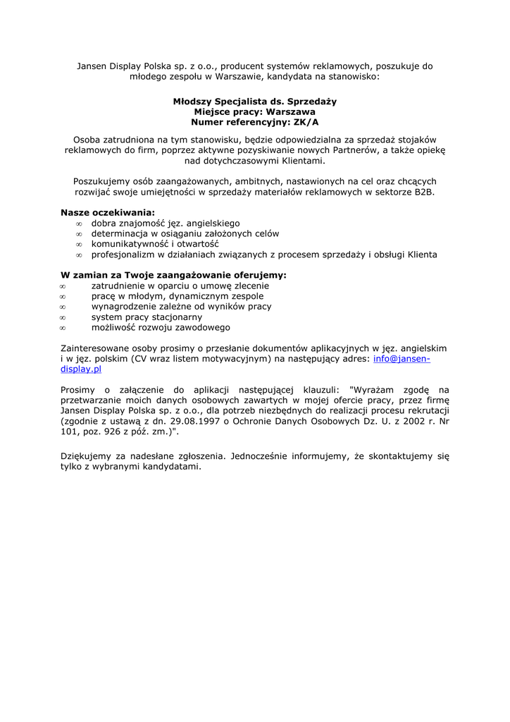 Jansen Display Polska sp. z o.o., producent systemów reklamowych, poszukuje do młodego zespołu w Warszawie, kandydata na stanowisko: Młodszy Specjalista ds. Sprzedaży Miejsce pracy: Warszawa Numer referencyjny: ZK/A Osoba zatrudniona na tym stanowisku, będzie odpowiedzialna za sprzedaż stojaków reklamowych do firm, poprzez aktywne pozyskiwanie nowych Partnerów, a także opiekę nad dotychczasowymi Klientami. Poszukujemy osób zaangażowanych, ambitnych, nastawionych na cel oraz chcących rozwijać swoje umiejętności w sprzedaży materiałów reklamowych w sektorze B2B. Nasze oczekiwania: • dobra znajomość jęz. angielskiego • determinacja w osiąganiu założonych celów • komunikatywność i otwartość • profesjonalizm w działaniach związanych z procesem sprzedaży i obsługi Klienta W zamian za Twoje zaangażowanie oferujemy: • zatrudnienie w oparciu o umowę zlecenie • pracę w młodym, dynamicznym zespole • wynagrodzenie zależne od wyników pracy • system pracy stacjonarny • możliwość rozwoju zawodowego Zainteresowane osoby prosimy o przesłanie dokumentów aplikacyjnych w jęz. angielskim i w jęz. polskim (CV wraz listem motywacyjnym) na następujący adres: [email protected] Prosimy o załączenie do aplikacji następującej klauzuli: "Wyrażam zgodę na przetwarzanie moich danych osobowych zawartych w mojej ofercie pracy, przez firmę Jansen Display Polska sp. z o.o., dla potrzeb niezbędnych do realizacji procesu rekrutacji (zgodnie z ustawą z dn. 29.08.1997 o Ochronie Danych Osobowych Dz. U. z 2002 r. Nr 101, poz. 926 z póź. zm.)". Dziękujemy za nadesłane zgłoszenia. Jednocześnie informujemy, że skontaktujemy się tylko z wybranymi kandydatami.