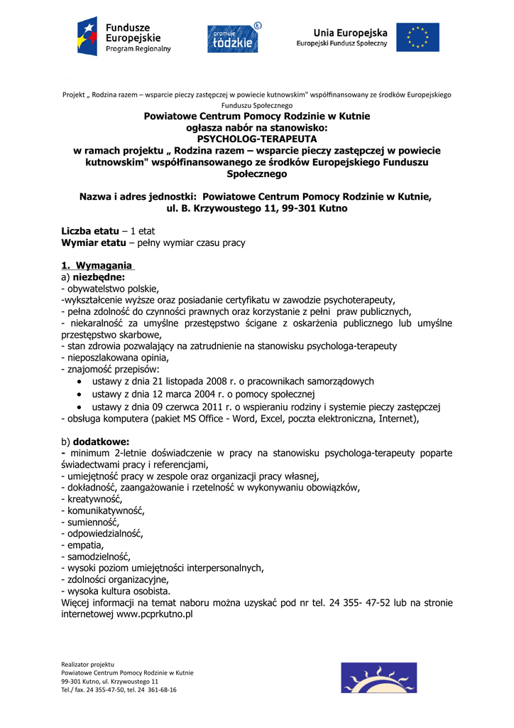 Projekt „ Rodzina razem – wsparcie pieczy zastępczej w powiecie kutnowskim" współfinansowany ze środków Europejskiego Funduszu Społecznego Powiatowe Centrum Pomocy Rodzinie w Kutnie ogłasza nabór na stanowisko: PSYCHOLOG-TERAPEUTA w ramach projektu „ Rodzina razem – wsparcie pieczy zastępczej w powiecie kutnowskim" współfinansowanego ze środków Europejskiego Funduszu Społecznego Nazwa i adres jednostki: Powiatowe Centrum Pomocy Rodzinie w Kutnie, ul. B. Krzywoustego 11, 99-301 Kutno Liczba etatu – 1 etat Wymiar etatu – pełny wymiar czasu pracy 1. Wymagania a) niezbędne: - obywatelstwo polskie, -wykształcenie wyższe oraz posiadanie certyfikatu w zawodzie psychoterapeuty, - pełna zdolność do czynności prawnych oraz korzystanie z pełni praw publicznych, - niekaralność za umyślne przestępstwo ścigane z oskarżenia publicznego lub umyślne przestępstwo skarbowe, - stan zdrowia pozwalający na zatrudnienie na stanowisku psychologa-terapeuty - nieposzlakowana opinia, - znajomość przepisów: ustawy z dnia 21 listopada 2008 r. o pracownikach samorządowych ustawy z dnia 12 marca 2004 r. o pomocy społecznej ustawy z dnia 09 czerwca 2011 r. o wspieraniu rodziny i systemie pieczy zastępczej - obsługa komputera (pakiet MS Office - Word, Excel, poczta elektroniczna, Internet), b) dodatkowe: - minimum 2-letnie doświadczenie w pracy na stanowisku psychologa-terapeuty poparte świadectwami pracy i referencjami, - umiejętność pracy w zespole oraz organizacji pracy własnej, - dokładność, zaangażowanie i rzetelność w wykonywaniu obowiązków, - kreatywność, - komunikatywność, - sumienność, - odpowiedzialność, - empatia, - samodzielność, - wysoki poziom umiejętności interpersonalnych, - zdolności organizacyjne, - wysoka kultura osobista. Więcej informacji na temat naboru można uzyskać pod nr tel. 24 355- 47-52 lub na stronie internetowej www.pcprkutno.pl Realizator projektu Powiatowe Centrum Pomocy Rodzinie w Kutnie 99-301 Kutno, ul. Krzywoustego 11 Tel./ fax. 24 355-47-50, tel. 24 361-68-16