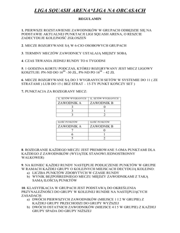 LIGA SQUASH ARENA*LIGA NA OBCASACH REGULAMIN 1. PIERWSZE ROZSTAWIENIE ZAWODNIKÓW W GRUPACH ODBĘDZIE SIĘ NA PODSTAWIE AKTUALNEJ PUNKTACJI LIGI SQUASH ARENA, O RESZCIE ZADECYDUJE KOLEJNOŚĆ ZGŁOSZEŃ 2. MECZE ROZGRYWANE SĄ W 6-CIO OSOBOWYCH GRUPACH 3. TERMINY MECZÓW ZAWODNICY USTALAJĄ MIĘDZY SOBĄ 4. CZAS TRWANIA JEDNEJ RUNDY TO 6 TYGODNI 5. 1 GODZINA KORTU PODCZAS, KTÓREJ ROZGRYWANY JEST MECZ LIGOWY KOSZTUJE: PN-ND DO 1600 –30 ZŁ, PN-ND PO 1600 – 42 ZŁ 6. MECZE ROZGRYWANE SĄ DO 3 WYGRANYCH SETÓW W SYSTEMIE DO 11 ( ZE STRATAMI ) LUB DO 15 ( BEZ STRAT – 15-TY PUNKT KOŃCZY SET ) 7. PUNKTACJA ZA ROZEGRANY MECZ: IL. SETÓW WYGRANYCH IL. SETÓW WYGRANYCH ZAWODNIK A 3 3 3 ZAWODNIK B 0 1 2 ILOŚĆ PUNKTÓW ILOŚĆ PUNKTÓW ZAWODNIK A 7 6 5 ZAWODNIK B 0 1 2 8. ROZEGRANIE KAŻDEGO MECZU JEST PREMIOWANE 5-OMA PUNKTAMI DLA KAŻDEGO Z ZAWODNIKÓW (WYJĄTEK STANOWI JEDNOSTRONNY WALKOWER) 9. NA KONIEC KAŻDEJ RUNDY NASTĘPUJE PODLICZENIE PUNKTÓW W GRUPIE W RAMACH KAŻDEJ GRUPY O KOLEJNYCH MIEJSCACH DECYDUJĄ KOLEJNO: a) LICZBA PUNKTÓW ZDOBYTYCH W CZASIE RUNDY b) WYNIK BEZPOŚREDNIEGO MECZU MIĘDZY ZAWODNIKAMI Z TAKĄ SAMĄ ILOŚCIĄ PUNKTÓW 10. KLASYFIKACJA W GRUPACH JEST PODSTAWĄ DO OKREŚLENIA PRZYNALEŻNOŚCI DO GRUPY W KOLEJNEJ RUNDIE NA NASTĘPUJĄCYCH ZASADACH: a) DWÓCH PIERWSZYCH ZAWODNIKÓW (MIEJSCE 1 I 2 W GRUPIE) Z KAŻDEJ GRUPY PRZECHODZI DO GRUPY WYŻSZEJ b) DWÓCH OSTATNICH ZAWODNIKÓW (MIEJSCE 4 I 5 W GRUPIE) Z KAŻDEJ GRUPY SPADA DO GRUPY NIŻSZEJ 11. NA KONIEC RUNDY PO AKTUALIZACJI PUNKTOWEJ W GRUPACH, ODBĘDZIE SIĘ TURNIEJ, KTÓRY WYŁONI MISTRZA MIESIĄCA LIGII SQUASH ARENA. TURNIEJ BĘDZIE ZGŁASZANY DO PFS W KATEGORII C. 12. W CZASIE TRWANIA RUNDY KAŻDY Z ZAWODNIKÓW MUSI ROZEGRAĆ CO NAJMNIEJ 2 MECZE (ZDOBYĆ CO NAJMNIEJ 10 PKT – 5 PKT PREMII ZA ROZEGRANIE MECZU X2 MECZE). NIE SPEŁNIENIE TEGO WARUNKU OZNACZA PRZENIESIENIE DO NIŻSZEJ GRUPY ROZGRYWEK LUB WYKLUCZENIE Z LIGI. 13. W PRZYPADKU GDY NIE JEST MOŻLIWE USTALENIE KOLEJNOŚCI ZAWODNIKÓW W GRUPIE Z POWODU NIEROZEGRANIA WYSTARCZAJĄCEJ LICZBY MECZÓW PRZEZ WIĘKSZOŚĆ ZAWODNIKÓW PRZEDSTAWICIEL SQUASH ARENA MOŻE ZADECYDOWAĆ O LIKWIDACJI GRUPY LUB O PRZENIESIENIU ZAWODNIKÓW DO NIŻSZEJ GRUPY. 14. JEŻELI ZOSTANIE UDOWODNIONE (DECYDUJE PRZEDSTAWICIEL SQUASH ARENA PO KONSULTACJI ZE STRONAMI), ŻE JEDEN Z ZAWODNIKÓW UCHYLAŁ SIĘ OD ROZEGRANIA MECZU CO NAJMNIEJ TRZYKROTNIE, MOŻE ZOSTAĆ PRZYZNANY JEDNOSTRONNY WALKOWER. ZAWODNIK ZGŁASZAJĄCY WALKOWERA (A) OTRZYMUJE 5 PUNKTÓW, A PRZECIWNIK (B) 0. W TAKIM PRZYPADKU NIE MA DODATKOWYCH 5 PKT PREMIOWANYCH. WPIS PUNKTACJI W TABELCE W PRZYPADKU WALKOWERA WYGLĄDA NASTĘPUJĄCO: ZAWODNIK A W5 ZAWODNIK B W0 15. W OKRESIE LETNIM (LIPIEC-SIERPIEŃ) ROZGRYWKI LIGOWE SĄ ZAWIESZONE 16. W PRZYPADKU REZYGNACJI Z ROZGRYWEK PRZEZ KTÓREGOŚ Z ZAWODNIKÓW BĄDŹ INNYCH WYPADKÓW LOSOWYCH, PRZEDSTAWICIEL SQUASH ARENA MOŻE ZADECYDOWAĆ O ZMIANACH W SKŁADZIE OSOBOWYM POSZCZEGÓLNYCH GRUP 17. ZAPISY DO ROZGRYWEK, A TAKŻE WSZELKIE SPORY I REKLAMACJE PRZYJMUJE I ROZSTRZYGA PRZEDSTAWICIEL SQUASH ARENA 18. REGULAMIN ORAZ GRUPY I WYNIKI ROZGRYWEK BĘDĄ DOSTĘPNE NA STRONIE WWW.SQUASH-ARENA.PL