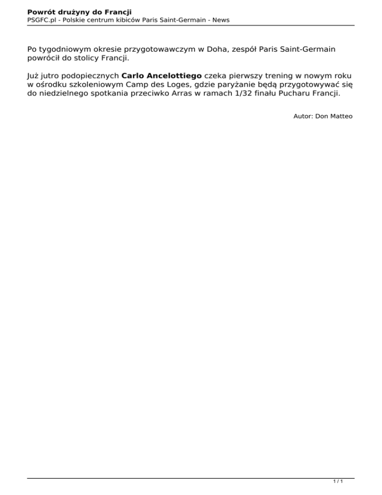 Powrót drużyny do Francji PSGFC.pl - Polskie centrum kibiców Paris Saint-Germain - News Po tygodniowym okresie przygotowawczym w Doha, zespół Paris Saint-Germain powrócił do stolicy Francji. Już jutro podopiecznych Carlo Ancelottiego czeka pierwszy trening w nowym roku w ośrodku szkoleniowym Camp des Loges, gdzie paryżanie będą przygotowywać się do niedzielnego spotkania przeciwko Arras w ramach 1/32 finału Pucharu Francji. Autor: Don Matteo 1/1 Powered by TCPDF (www.tcpdf.org)