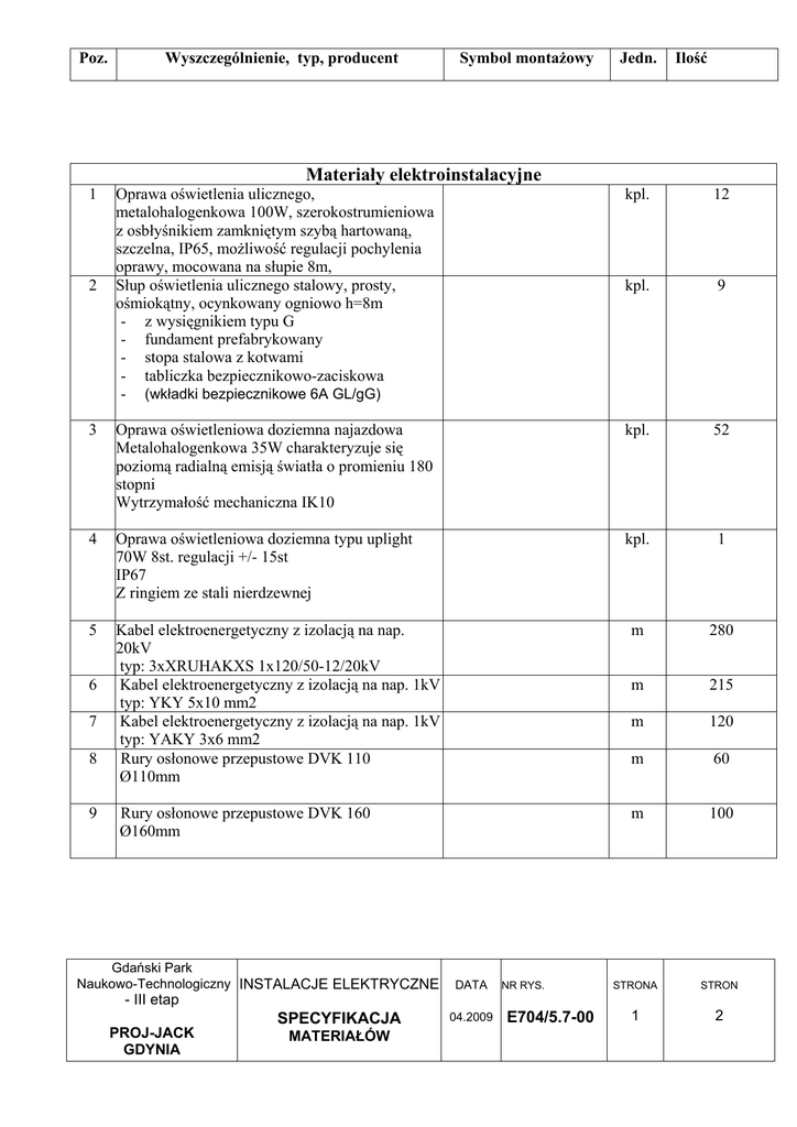 Poz. Wyszczególnienie, typ, producent Symbol montaŜowy Jedn. Ilość Materiały elektroinstalacyjne 1 Oprawa oświetlenia ulicznego, metalohalogenkowa 100W, szerokostrumieniowa z osbłyśnikiem zamkniętym szybą hartowaną, szczelna, IP65, moŜliwość regulacji pochylenia oprawy, mocowana na słupie 8m, Słup oświetlenia ulicznego stalowy, prosty, ośmiokątny, ocynkowany ogniowo h=8m - z wysięgnikiem typu G - fundament prefabrykowany - stopa stalowa z kotwami - tabliczka bezpiecznikowo-zaciskowa - (wkładki bezpiecznikowe 6A GL/gG) kpl. 12 kpl. 9 3 Oprawa oświetleniowa doziemna najazdowa Metalohalogenkowa 35W charakteryzuje się poziomą radialną emisją światła o promieniu 180 stopni Wytrzymałość mechaniczna IK10 kpl. 52 4 Oprawa oświetleniowa doziemna typu uplight 70W 8st. regulacji +/- 15st IP67 Z ringiem ze stali nierdzewnej kpl. 1 5 Kabel elektroenergetyczny z izolacją na nap. 20kV typ: 3xXRUHAKXS 1x120/50-12/20kV Kabel elektroenergetyczny z izolacją na nap. 1kV typ: YKY 5x10 mm2 Kabel elektroenergetyczny z izolacją na nap. 1kV typ: YAKY 3x6 mm2 Rury osłonowe przepustowe DVK 110 Ø110mm m 280 m 215 m 120 m 60 m 100 STRONA STRON 1 2 2 6 7 8 9 Rury osłonowe przepustowe DVK 160 Ø160mm Gdański Park Naukowo-Technologiczny INSTALACJE ELEKTRYCZNE DATA NR RYS. - III etap SPECYFIKACJA PROJ-JACK GDYNIA MATERIAŁÓW 04.2009 E704/5.7-00 Poz. Wyszczególnienie, typ, producent Symbol montaŜowy Jedn. Ilość 10 Studnia kablowa (wym. 2360x1340x1910mm) -studnia magistralna -przelotowa - Przeznaczona do kanalizacji o 3 otworach w warstwie i do 18 otworów w ciągu.-wykonana z dwóch elementów Ŝelbetowych z betonu klasy C 20/25 -zwieńczenie z ramą obetonowaną 1000x600. -CięŜar studni 3820 kg. kpl 2 11 Taśma stalowa, ocynkowana PFe 25x4 m. 340 12 Oznaczniki do kabli i przewodów elektroenergetycznych 13 m 215 m 100 15 Folia ochronna do kabli energetycznych - kolor niebieski - grubość 0,5 Folia ochronna do kabli energetycznych - kolor czerwony - grubość 0,5 Podsypka kablowa Ŝwirowa wg. potrzeb 16 Materiały pomocnicze wg. potrzeb STRONA STRON 2 2 14 Gdański Park Naukowo-Technologiczny INSTALACJE ELEKTRYCZNE wg. potrzeb DATA NR RYS. - III etap SPECYFIKACJA PROJ-JACK GDYNIA MATERIAŁÓW 04.2009 E704/5.7-00