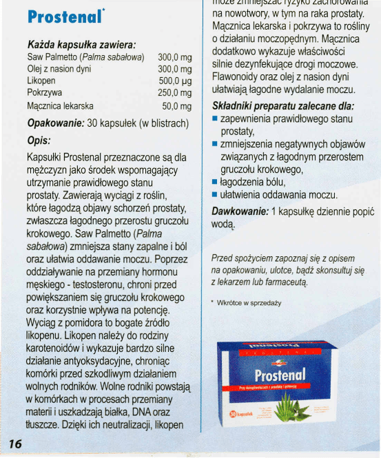 IIIULI;:; LIIlIIlt'J:::tLd •..•lyLyr.U Każda kapsułka zawiera: Saw Palmetto (Palma sabalowa) Olej z nasion dyni Likopen Pokrzywa Mącznica lekarska 300,0 mg 300,0 mg 500,0 ~g 250,0 mg 50,0 mg Opakowanie: 30 kapsułek (w blistrach) Opis: Kapsułki Prostenal przeznaczone są dla mężczyzn jako środek wspomagający utrzymanie prawidłowego stanu prostaty. Zawierają wyciągi z roślin, które łagodzą objawy schorzeń prostaty, zwłaszcza łagodnego przerostu gruczołu krokowego. Saw Palmetto (Palma sabalowa) zmniejsza stany zapalne i ból oraz ułatwia oddawanie moczu. Poprzez oddziaływanie na przemiany hormonu męskiego - testosteronu, chroni przed powiększaniem się gruczołu krokowego oraz korzystnie wpływa na potencję. Wyciąg z pomidora to bogate żródło likopenu. Likopen należy do rodziny karotenoidów i wykazuje bardzo silne działanie antyoksydacyjne, chroniąc komórki przed szkodliwym działaniem wolnych rodników. Wolne rodniki powstają w komórl<ach w procesach przemiany materii i uszkadzają białka, DNA oraz tłuszcze. Dzięki ich neutralizacji, likopen LdL;IIUIUWdllld na nowotwory, w tym na raka prostaty. Mącznica lekarska i pokrzywa to rośliny o działaniu moczopędnym. Mącznica dodatkowo wykazuje właściwości silnie dezynfekujące drogi moczowe. Flawonoidy oraz olej z nasion dyni ułatwiają łagodne wydalanie moczu. Składniki preparatu załecane dła: • zapewnienia prawidłowego stanu prostaty, • zmniejszenia negatywnych objawów związanych z łagodnym przerostem gruczołu krokowego, • łagodzenia bólu, • ułatwienia oddawania moczu. Dawkowanie: 1 kapsułkę dziennie popić wodą. Przed spożyciem zapoznaj się z opisem na opakowaniu, ulotce, bądż skonsultuj się z lekarzem lub fannaceutą.