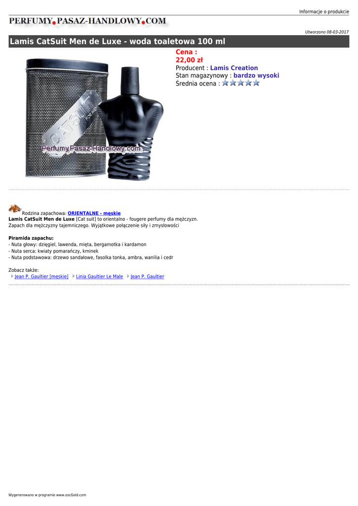 Informacje o produkcie Utworzono 08-03-2017 Lamis CatSuit Men de Luxe - woda toaletowa 100 ml Cena : 22,00 zł Producent : Lamis Creation Stan magazynowy : bardzo wysoki Średnia ocena : Rodzina zapachowa: ORIENTALNE - męskie Lamis CatSuit Men de Luxe [Cat suit] to orientalno - fougere perfumy dla mężczyzn. Zapach dla mężczyzny tajemniczego. Wyjątkowe połączenie siły i zmysłowości Piramida zapachu: - Nuta głowy: dzięgiel, lawenda, mięta, bergamotka i kardamon - Nuta serca: kwiaty pomarańczy, kminek - Nuta podstawowa: drzewo sandałowe, fasolka tonka, ambra, wanilia i cedr Zobacz także: Jean P. Gaultier [męskie] Linia Gaultier Le Male Wygenerowano w programie www.oscGold.com Jean P. Gaultier