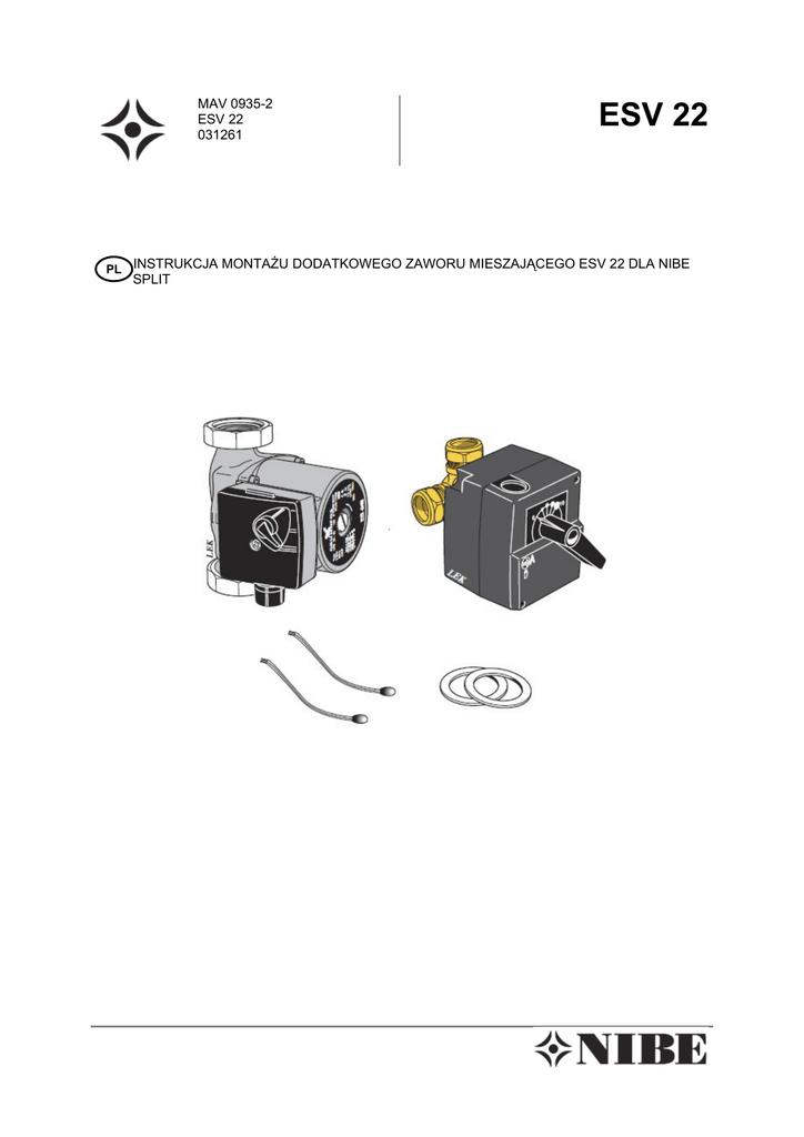 MAV 0935-2 ESV 22 031261 ESV 22 PL INSTRUKCJA MONTAŻU DODATKOWEGO ZAWORU MIESZAJĄCEGO ESV 22 DLA NIBE SPLIT INSTRUKCJA MONTAŻU ESV 22 Informacje ogólne Zawartość To wyposażenie dodatkowe jest używane podczas montowania NIBE ACVM 270 w domach, z dwoma różnymi systemami grzewczymi, które wymagają różnych temperatur w rurociągach zasilających, na przykład w przypadkach, kiedy dom ma zarówno system grzejnikowy i ogrzewanie podłogowe. W następującym tekście system grzewczy 1 obejmuje system, który wymaga większej temperatury i który jest podłączony do normalnego rurociągu zasilającego i odpowiedniego rurociągu powrotnego. System grzewczy 2 obejmuje system grzewczy, który pracuje w niższych temperaturach. 1x 4x 2x 1x 2x 4x 1x 2x 1x 2x 2x 1x Pompa obiegowa z 3 kablami Opaski kablowe Pasta do rury grzewczej Taśma izolacyjna Uszczelka płaska Nasuwka okrągła Złącze o 3 prędkościach do pompy obiegowej, EP21-GP20 Nakrętka M zaworu kulowego Zawór trójdrogowy Taśma aluminiowa (kawałki) Czujnik temperatury, EP21-BT2 (przepływomierz), EP21-BT3 (czujnik rurociągu powrotnego) Silnik sterujący, EP21-QN25 Przepływ wody w dwu systemach nie powinien przekroczyć 2050 l/godz. (0,57 /s) UWAGA To wyposażenie dodatkowe wymaga również ACK 22. ESV 22 2 Przyłącza rurowe ACVM 270 Wykres charakterystyki pompy Zamontować w następujący sposób: Najpierw opróżnić bojler/system grzewczy, jeśli jest Ciśnienie, napełniony wodą. Ustawić pompę czynnika grzewczego (EP21GP20) w odpowiednim miejscu na zewnątrz ACVM 270. Zawór mieszający (EP21-QN25) jest umieszczony na rurociągu zasilającym za ACVM 270, przed pierwszym grzejnikiem w systemie grzewczym 1. Rurociąg powrotny z systemu grzewczego 2 jest podłączony do zaworu mieszającego (EP21-QN25) i do rurociągu powrotnego z systemu grzewczego 1, patrz ilustracja. Przepływomierz (EP21-BT2) jest zamontowany na rurze za pompą czynnika grzewczego (EP21GP20). Czujnik rurociągu powrotnego (EP21-BT3) jest zamontowany na rurze dodatkowego systemu grzewczego 2. flow - przepływ W celu uzyskania prawidłowych pomiarów temperatury w czasie montowania czujnika musi być użyta pasta przewodząca ciepło a rura musi zostać zaizolowana. UWAGA Niepoprawne zamontowanie może mieć wpływ na prawidłowe działanie. Zawór obejściowy, (EP21-QN25) Przyłącza, O 22 mm Powrotny ESV 22 3 Schemat ogólny ACVM 270 z dodatkowym zaworem mieszającym ESV 22 Overflow valve – zawór przelewowy Required safety equipment – wymagane urządzenia bezpieczeństwa Wyjaśnienia BT1 EP21-BT2 EP21-BT3 CM1 4 Czujnik temperatury zewnętrznej CP1 Czujnik temperatury, rurociąg zasilający EP21-GP20 2 EP21-QN25 Czujnik temperatury, rurociąg powrotny 2 Naczynie przeponowe ESV 22 Zbiornik buforowy UKV Dodatkowa pompa obiegowa Zawór mieszający Czujnik użyty jako przepływomierz (EP21-BT2) jest podłączony do zacisku AA22:X4:7 i AA22:X4:8 w dolnej listwie zaciskowej karty miernika natężenia prądu. Czujnik rurociągu powrotnego (EP21-BT3) jest podłączony do zacisku AA22:X4:5 i AA22:X4:6 na tej samej karcie. 3. Siłownik zaworu (EP21-QN25) podłączyć następująco: Kabel brązowy (sygnał 230 V) do zacisku sprężynującego X6:7b, Kabel biały (sygnał 230 V) do zacisku sprężynującego X6:8a, Kabel niebieski (zero) do zacisku sprężynującego X6:6b, 4. Pompę obiegową (EP21-GP20) podłączyć następująco: Kabel niebieski (zero) do zacisku sprężynującego – X6:6a, Kabel żółto/zielony (kabel uziemienia) do zacisku sprężynującego – X6:5a, Kabel brązowy (faza) do zacisku sprężynującego – X6:4a. - Połączenia elektryczne ACVM UWAGA Wszystkie połączenia elektryczne muszą być wykonane przez uprawnionego elektryka. Instalacja elektryczna i okablowanie muszą być wykonane zgodnie z obowiązującymi warunkami. ACVM 270 nie może być podłączony do prądu podczas montowania ESV 22 . Schemat obwodu elektrycznego znajduje się na końcu tej instrukcji montażu. Z ESV 22 Podłączenie Elektryczne Electrical connection –przyłącze elektryczne 1. Wyposażenie dodatkowe ACK 22 jest zamontowane zgodnie z dostarczoną instrukcją montażu. 2. Do karty miernika natężenia prądu (EBVAA22) czujniki są podłączone podwójnymi kablami (na przykład EKXX lub LiYY) w następujący sposób, patrz obrazek poniżej. Montowanie czujnika temperatury Użyć dołączonych nasuwek okrągłych do połączenia 2 kabli i czujników BT2 i BT3. Czujniki temperatury należy zamontować używając opasek kablowych, pasty przewodzącej i taśmy aluminiowej. A następnie zaizolować taśmą izolacyjną. UWAGA Czujnik i kable komunikacyjne nie mogą być umieszczone obok kabli z zasilaniem elektrycznym. ESV 22 5 Ustawienia programu ACVM 270 W menu 8.1.1 wybrać „Service” (obsługa) aby uzyskać dostęp do menu 9.0 i podmenu. Następnie wybrać „Heating” (grzanie), "Heating + Cooling" (grzanie + chłodzenie) lub "Cooling" (chłodzenie) w menu 9.3.4, “Heating system 2” (system grzewczy 2). Zostanie udostępnione menu 3.0 i jego podmenu. W podmenu współczynnik krzywej 2, przesunięcie krzywej grzania 2 i poziomy min. i maks. dla temperatury rurociągu zasilającego 2 są ustawiane tak samo jak system grzewczy 1 w menu 2.0. Patrz „Instrukcja Montażu I konserwacji” dla NIBE SPLIT. 6 ESV 22 Schemat połączeń ESV 22 ESV 22 7 8 ESV 22 Relay board Brown Płytka przekaźnika brązowy Blue Cooling/heating (option) Circulation pump 2-way valve heating Pompa obiegowa Zawór dwudrogowy ogrzewanie chłodzenie White 2-way valve HW Cooling Shunt valve ESV 22 niebieski Chłodzenie ogrzewanie (opcja) biały Zawór dwudrogowy, gorąca woda Zawór mieszający 9 Heating system 2 (option) EBV control card System ogrzewania 2 Immersion heater Grzałka zanurzeniowa Karta sterowania EBV Low priority alarm High priority alarm EXT. temp. adj. Load monitor Alarm o wysokim priorytecie Miernik natężenia Outdoor temp. sensor Supply Condenser out 