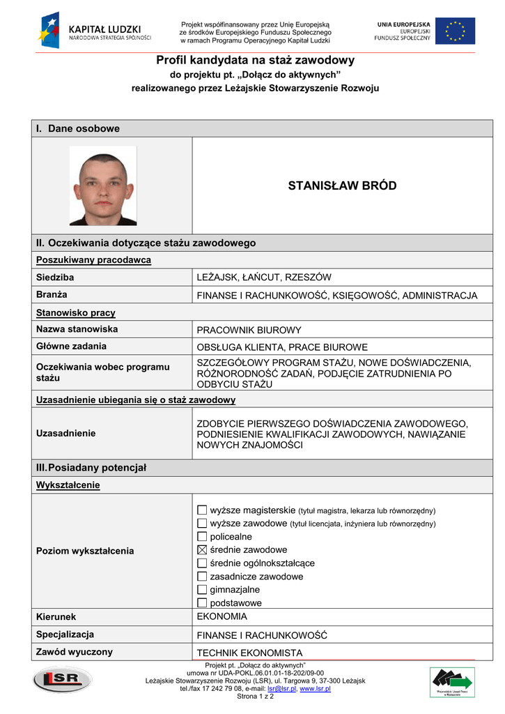 Profil kandydata na staż zawodowy STANISŁAW BRÓD