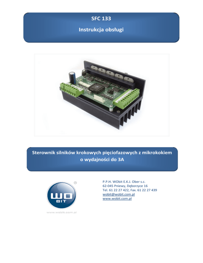 SFC 133 Instrukcja obsługi Sterownik silników krokowych pięciofazowych z mikrokokiem o wydajności do 3A P.P.H. WObit E.K.J. Ober s.c. 62-045 Pniewy, Dęborzyce 16 Tel. 61 22 27 422, Fax. 61 22 27 439 [email protected] www.wobit.com.pl Zawartość 1. Opis sterownika ............................................................................................................................... 3 1.2 Układ zworek V1 V2....................................................................................................................... 4 2.Wskazówki montażowe i uwagi dot. bezpieczeństwa ......................................................................... 8 3. Podłączenie silnika SECM .................................................................................................................... 9 Dziękujemy za wybór naszego produktu! Niniejsza instrukcja ułatwi Państwu prawidłowa obsługę i poprawna eksploatacje opisywanego urządzenia. Informacje zawarte w niniejszej instrukcji przygotowane zostały z najwyższa uwaga przez naszych specjalistów i służą jako opis produktu. Na podstawie przedstawionych informacji nie należy wnioskować o określonych cechach lub przydatności produktu do konkretnego zastosowania. Informacje te nie zwalniają użytkownika z obowiązku poddania produktu własnej ocenie i sprawdzenia jego właściwości. Zastrzegamy sobie możliwość zmiany parametrów produktów bez powiadomienia. Prosimy o uważne przeczytanie instrukcji i stosowanie się do zawartych w niej zaleceń. Prosimy o zwrócenie szczególnej uwagi na następujące znaki: UWAGA! Niedostosowanie się do instrukcji może spowodować uszkodzenie urządzenia albo utrudnić posługiwanie się sprzętem lub oprogramowaniem. www.wobit.com.pl Instrukcja obsługi -SFC133 – 03.11.2014 – v.1.2 str. 2 1. Opis sterownika Miniaturowy sterownik SFC133 przeznaczony jest do współpracy z pięciofazowym silnikiem krokowym z uzwojeniem bipolarnym (10przewodowym). Umożliwia on sterowanie z pełnym krokiem lub krokiem podzielonym na 2, 4 lub 8 części, wymuszając stałą wartość prądu w uzwojeniu silnika, niezależnie od wartości napięcia zasilania. Każdy impuls taktujący powoduje obrót silnika o jeden krok, pół kroku, ¼ lub 1/8 kroku w zależności od wyboru zworkami JP1 i JP2, lub sygnałami wejściowymi M1 i M2 (maks. 4000 kroków na obrót dla silnika 0,72°). Prąd znamionowy silnika ustalają fabrycznie wlutowane miniaturowe rezystory wstawione w odpowiednie miejsca od strony elementów (standardowo ustawiona jest wartość prądu 2 A). O trybie obniżonego poboru prądu (do 50% ustawionej wartości) decyduje zanik impulsów zegarowych (automatyczna redukcja po 0,5 sek). Sterownik jest zabezpieczony termicznym wyłącznikiem, który po przekroczeniu temperatury 85°C blokuje sygnał CLK. Czerwona dioda sygnalizuje obecność napięcia zasilania. Sterownik SFC133 standardowo posiada pasywne chłodzenie w postaci radiatora (R) i przeznaczony jest do mocowania na szynie monterskiej lub z wentylatorem (W) wymuszającym chłodzenie w miniaturowym radiatorze. Do zabudowy w urządzeniu przewidziano też wersję (B) bez radiatora, zamontowaną na profilu L aluminiowym (grubość 3mm), wymagającą odebrania nadmiaru ciepła przez zewnętrzną powierzchnię chłodzącą (np. ściana obudowy urządzenia). Standardowo sterownik posiada kątowe listwy rozłączne typu Combicon, a optoizolowane wejścia sterujące M1, M2, generator wyprowadzone są na miniaturowe złącze. Umożliwia to błyskawiczne podłączenie sterownika do komputera lub innych urządzeń. Wejścia nie podłączone są traktowane tak, jakby na tym wejściu był stan wysoki –H („1” logiczna). Stan „0” opisany w tabeli oznacza wymuszenie przepływu prądu przez transoptor. Ponieważ podczas hamowania energia silnika musi zostać odebrana przez układ zasilający, należy go wyposażyć w kondensator o pojemności co najmniej 4700 uF/ 50V ( na płytce sterownika znajduje się już kondensator o pojemności 1000 uF/ 50V). Uwaga: wzrost napięcia zasilania powyżej 48 V doprowadzić może do uszkodzenia układu scalonego sterownika. Ustawienie prądu znamionowego odbywa się przez zmianę rezystorów fabrycznych montowanych powierzchniowo według tabeli. Zalecane jest splecenie parami ze sobą przewodów prowadzących do silnika w celu zmniejszenia generowanych zakłóceń EMI. www.wobit.com.pl Instrukcja obsługi -SFC133 – 03.11.2014 – v.1.2 str. 3 Własności: - mikroprocesor, scalone stopnie mocy - miniaturowe wymiary: 150x80x40 (80) mm - chroniony temperaturowo - ochrona nadnapięciowa, przeciwzwarciowa - jedno napięcie zasilania, maks. 48 V - wysoki prąd znamionowy 3 A - praca pełno, półkrokowa, ¼, 1/8 kroku - przeznaczony dla silników 5-fazowych bipolarnych - optoizolacja sygnałów we/wy - nastawiane wartości prądu znamionowego - automatyczna redukcja prądu - wskaźnik LED dla zasilania - zasilanie, sygnały do silnika 3 sterujące na listwach rozłącznych typu Combicon - dwie programowalne częstotliwości jazdy - funkcja miękkiego startu - opcjonalne łącze szeregowe RS485 Napięcie pracy Maksymalny prąd fazowy Nastawienie prądu Rodzaj pracy Podział krokowy dla silnika 0,72° Częstotliwość kroku Redukcja prądu Sygnały wejściowe szybkie (DIR, CLK, LUZ) Prąd sygnałów wejściowych Wskaźnik LED czerwony Zakres temperatur pracy Przyłączanie silnika Podłączanie sygnałów Sposób mocowania W B 18…36 VDC 3A Przez rezystor stały Bipolarny PWM 500/ 1000/ 2000/ 4000 kroków na obrót (1, ½, ¼, 1/8) 0 do 20 kHz Automatyczna na 50% Optoizolowane 6N137 przystosowane dla 5 V Dla 5V, maks. 20 mA Obecność zasilania 0 do 40°C Listwa zaciskowa rozłączna Listwa zaciskowa rozłączna Uchwyt szyny monterskiej Otwory pod śruby M3 1.2 Układ zworek V1 V2 Wyłączony wewnętrzny generator Wywołanie pierwszej zaprogramowanej częstotliwości www.wobit.com.pl Instrukcja obsł