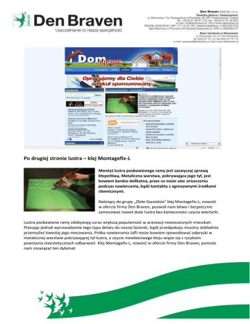Po drugiej stronie lustra – klej Montagefix-L Montaż lustra pozbawionego ramy jest zazwyczaj sprawą kłopotliwą. Metaliczna warstwa, pokrywająca jego tył, jest bowiem bardzo delikatna, przez co może ulec zniszczeniu podczas nawiercania, bądź kontaktu z agresywnymi środkami chemicznymi. Należący do grupy „Złote Gwoździe" klej Montagefix-L, nowośd w ofercie firmy Den Braven, pozwoli nam łatwo i bezpiecznie zamocowad nawet duże lustra bez konieczności użycia wiertarki. Lustra pozbawione ramy zdobywają coraz większą popularnośd w aranżacji nowoczesnych mieszkao. Planując jednak wprowadzenie tego typu detalu do naszej łazienki, bądź przedpokoju musimy dokładnie przemyśled kwestię jego mocowania. Próba nawiercenia tafli może bowiem spowodowad odpryski w metalicznej warstwie pokrywającej tył lustra, a użycie niewłaściwego kleju wiąże się z ryzykiem powstania nieestetycznych odbarwieo. Klej Montagefix-L, nowośd w ofercie firmy Den Braven, pomoże nam rozwiązad ten dylemat. Bezproblemowe mocowanie Montagefix-L firmy Den Braven jest jednoskładnikowym, trwale elastycznym klejem wykonanym na bazie MS POLIMERU (modyfikowanych silanów), stworzonym specjalnie z myślą o bezpiecznym i bezproblemowym montażu luster o różnych rozmiarach. Po utwardzeniu tworzy on bardzo silne wiązanie o znikomym skurczu. Dzięki temu, łączenie takie nie powoduje powstawania naprężeo, mogących byd przyczyną wyginania się szklanej tafli, zwiększając tym samym ryzyko pęknięcia. Dzięki unikalnemu składowi jest on całkowicie neutralny chemicznie, przez co doskonale nadaje się do montażu luster łazienkowych i pokojowych (w tym wykooczonych ochronną powłoką epoksydową) o grubości do 8 mm, bez ryzyka powstania odbarwieo w warstwie pokrywającej tył tafli. Montagefix-L firmy Den Braven charakteryzuje się doskonałą przyczepnością do różnego rodzaju podłoży, zarówno porowatych jak i gładkich. Dzięki temu, bez względu na to czy mamy do czynienia z betonem, tynkiem, gipsem, płytą g-k, ceramiką budowlaną, kamieniem, szkłem, stalą, metalem, drewnem, PCW czy podobnymi materiałami (poza PE, PP i teflonem), będziemy mied pewnośd, że mocowanie wykonane przy pomocy Montagefix-L będzie trwałe i pewne.Oczywiście przydatnośd kleju Montagefix-L nie ogranicza się tylko i wyłącznie do montażu luster. Jego unikalne właściwości sprawdzą się również doskonale podczas klejenia mozaiki lustrzanej, płytek lustrzanych, elementów glazurowanych, szkliwionych, emaliowanych, płytek izolacyjnych, czy w koocu paneli dekoracyjnych. Marka „Złote Gwoździe", do której należy Montagefix-L, jest propozycją firmy Den Braven skierowaną do osób poszukujących alternatywy dla tradycyjnych, mocno inwazyjnych metod łączenia, takich jak gwoździe, śruby, nity itp. Rodzinę tę tworzą wyspecjalizowane kleje przeznaczone do spajania różnego rodzaju powierzchni, dzięki czemu możemy dobrad odpowiedni klej do konkretnych prac budowlanych, remontowych czy naprawczych. Dlatego też, logo „Złote Gwoździe" znajdujące się na Montagefix-L potwierdza jego bardzo wysoką jakośd oraz najwyższą skutecznośd. Klej Den Braven Montagefix-L, cena hurtowa brutto - 17,99 pln www.denbraven.pl Firma Den Braven East Sp. z o.o. z siedzibą w Wysogotowie koło Poznania została założona w 1991 roku jako wschodnioeuropejski oddział Grupy Den Braven. Holding Den Braven Sealants jest liderem technologii uszczelnieo w Europie, a marka Zwaluw (Jaskółka z j. holenderskiego) jest rozpoznawalna na całym świecie. Terenem działania Den Braven East jest nie tylko Polska, ale i inne kraje Europy Wschodniej i Azji (Rosja, Litwa, Łotwa, Estonia, Ukraina, Białoruś, Azerbejdżan i Kazachstan). Od 2000 r. dysponuje również oddziałem w Moskwie. Den Braven East oferuje szeroki wybór produktów chemii budowlanej obejmujący: silikony, piany poliuretanowe, masy uszczelniające, takie jak akryle, kauczuki i butyleny, kleje montażowe, kleje do drewna i paneli, MS - polimery, kity, fugi, szpachlówki, grunty, impregnaty do drewna, plastyfikatory, środki czyszczące, taśmy dekarskie, samorozprężne taśmy uszczelniające, szpachelki, lakiery w sprayu, hydroizolacje, akcesoria do pian poliuretanowych, pistolety ręczne oraz pneumatyczne i akumulatorowe do silikonów, narzędzia. Dzięki uznanej jakości produkty Den Braven znajdują powszechne zastosowanie w budownictwie, przemyśle, motoryzacji, szklarstwie i gospodarstwie domowym. Den Braven dysponuje magazynami o powierzchni ponad 5000 miejsc paletowych. Produkty firmy dostarczane są w ciągu 48 godzin od złożenia zamówienia