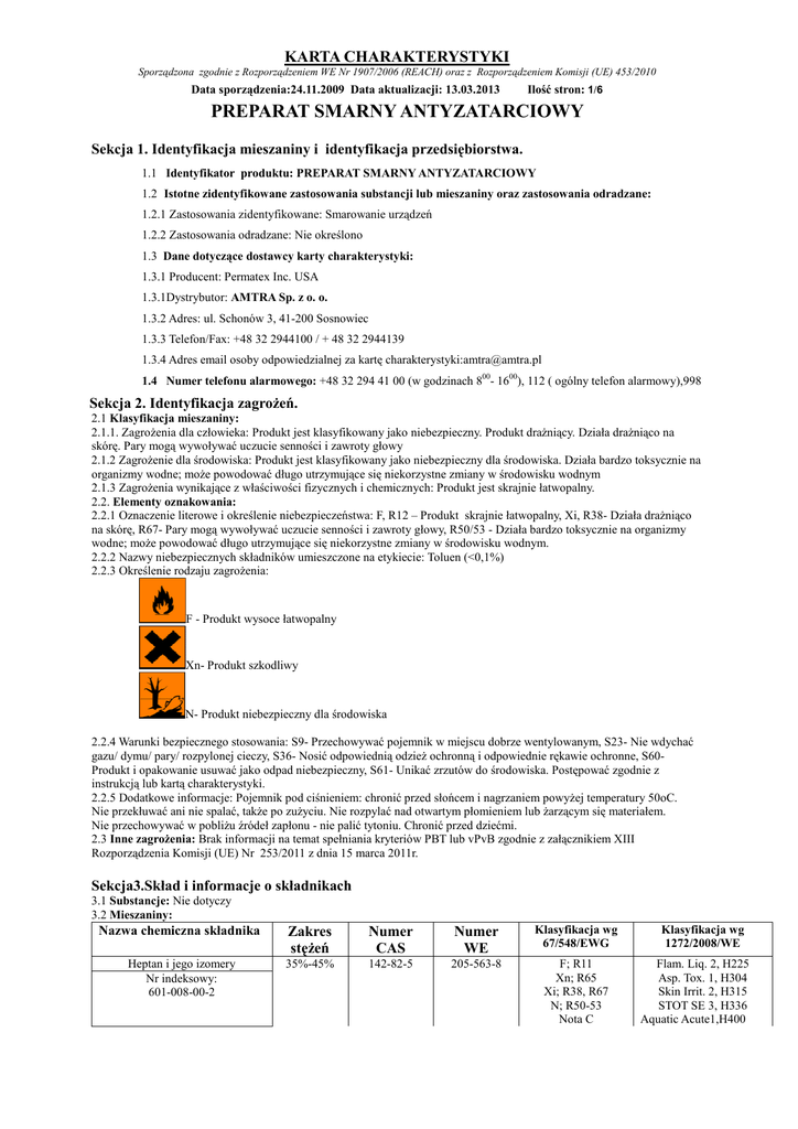 KARTA CHARAKTERYSTYKI Sporządzona zgodnie z Rozporządzeniem WE Nr 1907/2006 (REACH) oraz z Rozporządzeniem Komisji (UE) 453/2010 Data sporządzenia:24.11.2009 Data aktualizacji: 13.03.2013 Ilość stron: 1/6 PREPARAT SMARNY ANTYZATARCIOWY Sekcja 1. Identyfikacja mieszaniny i identyfikacja przedsiębiorstwa. 1.1 Identyfikator produktu: PREPARAT SMARNY ANTYZATARCIOWY 1.2 Istotne zidentyfikowane zastosowania substancji lub mieszaniny oraz zastosowania odradzane: 1.2.1 Zastosowania zidentyfikowane: Smarowanie urządzeń 1.2.2 Zastosowania odradzane: Nie określono 1.3 Dane dotyczące dostawcy karty charakterystyki: 1.3.1 Producent: Permatex Inc. USA 1.3.1Dystrybutor: AMTRA Sp. z o. o. 1.3.2 Adres: ul. Schonów 3, 41-200 Sosnowiec 1.3.3 Telefon/Fax: +48 32 2944100 / + 48 32 2944139 1.3.4 Adres email osoby odpowiedzialnej za kartę charakterystyki:[email protected] 1.4 Numer telefonu alarmowego: +48 32 294 41 00 (w godzinach 800- 1600), 112 ( ogólny telefon alarmowy),998 Sekcja 2. Identyfikacja zagrożeń. 2.1 Klasyfikacja mieszaniny: 2.1.1. Zagrożenia dla człowieka: Produkt jest klasyfikowany jako niebezpieczny. Produkt drażniący. Działa drażniąco na skórę. Pary mogą wywoływać uczucie senności i zawroty głowy 2.1.2 Zagrożenie dla środowiska: Produkt jest klasyfikowany jako niebezpieczny dla środowiska. Działa bardzo toksycznie na organizmy wodne; może powodować długo utrzymujące się niekorzystne zmiany w środowisku wodnym 2.1.3 Zagrożenia wynikające z właściwości fizycznych i chemicznych: Produkt jest skrajnie łatwopalny. 2.2. Elementy oznakowania: 2.2.1 Oznaczenie literowe i określenie niebezpieczeństwa: F, R12 – Produkt skrajnie łatwopalny, Xi, R38- Działa drażniąco na skórę, R67- Pary mogą wywoływać uczucie senności i zawroty głowy, R50/53 - Działa bardzo toksycznie na organizmy wodne; może powodować długo utrzymujące się niekorzystne zmiany w środowisku wodnym. 2.2.2 Nazwy niebezpiecznych składników umieszczone na etykiecie: Toluen (<0,1%) 2.2.3 Określenie rodzaju zagrożenia: F - Produkt wysoce łatwopalny Xn- Produkt szkodliwy N- Produkt niebezpieczny dla środowiska 2.2.4 Warunki bezpiecznego stosowania: S9- Przechowywać pojemnik w miejscu dobrze wentylowanym, S23- Nie wdychać gazu/ dymu/ pary/ rozpylonej cieczy, S36- Nosić odpowiednią odzież ochronną i odpowiednie rękawie ochronne, S60Produkt i opakowanie usuwać jako odpad niebezpieczny, S61- Unikać zrzutów do środowiska. Postępować zgodnie z instrukcją lub kartą charakterystyki. 2.2.5 Dodatkowe informacje: Pojemnik pod ciśnieniem: chronić przed słońcem i nagrzaniem powyżej temperatury 50oC. Nie przekłuwać ani nie spalać, także po zużyciu. Nie rozpylać nad otwartym płomieniem lub żarzącym się materiałem. Nie przechowywać w pobliżu źródeł zapłonu - nie palić tytoniu. Chronić przed dziećmi. 2.3 Inne zagrożenia: Brak informacji na temat spełniania kryteriów PBT lub vPvB zgodnie z załącznikiem XIII Rozporządzenia Komisji (UE) Nr 253/2011 z dnia 15 marca 2011r. Sekcja3.Skład i informacje o składnikach 3.1 Substancje: Nie dotyczy 3.2 Mieszaniny: Nazwa chemiczna składnika Zakres stężeń Numer CAS Numer WE Klasyfikacja wg 67/548/EWG Heptan i jego izomery Nr indeksowy: 601-008-00-2 35%-45% 142-82-5 205-563-8 F; R11 Xn; R65 Xi; R38, R67 N; R50-53 Nota C Klasyfikacja wg 1272/2008/WE Flam. Liq. 2, H225 Asp. Tox. 1, H304 Skin Irrit. 2, H315 STOT SE 3, H336 Aquatic Acute1,H400 KARTA CHARAKTERYSTYKI Sporządzona zgodnie z Rozporządzeniem WE Nr 1907/2006 (REACH) oraz z Rozporządzeniem Komisji (UE) 453/2010 Data sporządzenia:24.11.2009 Data aktualizacji: 13.03.2013 Ilość stron: 2/6 PREPARAT SMARNY ANTYZATARCIOWY Destylaty ciężkie parafinowe obrabiane wodorem (ropa naftowa); Olej bazowy niespecyfikowany * Nr indeksowy: 649-467-00-8 Propan Nr indeksowy: 601-003-00-5 Butan Nr indeksowy: 601-004-00-0 Toluen Nr indeksowy: 601-021-00-3 5%-15% 64742-54-7 265-157-1 Carc. Cat. 2; R45 Nota H, L 5%-15% 74-98-6 200-827-9 F+, R12 5%-15% 106-97-8 203-448-7 F+, R12 Nota C <0,1% 108-88-3 203-625-9 F; R11 Repr. Cat. 3;R63 Xn; R48/20, R65 Xi; R38 R67 Aquatic Chronic 1,H410 Nota C Carc. 1B, H350 Nota H,L Flam. Gas 1, H220 Press. Gas Nota U Flam. Gas 1, H220 Press. Gas Nota U, C Flam. Liq. 2,H225 Repr. 2, H361d Asp. Tox. 1,H304 STOT RE 2, H373 Skin Irrit. 2,H315 STOT SE 3,H336 *- Zawiera <3% ekstraktu DMSO zgodnie z pomiarem metodą określoną w IP 346 SEKCJA 4. ŚRODKI PIERWSZEJ POMOCY 4.1 Opis środków pierwszej pomocy: 4.1.1 Połknięcie: W razie połknięcia przepłukać jamę ustną oraz przetransportować do najbliższej placówki medycznej celem podjęcia leczenia. Pokazać opakowanie lub etykietę. Nie wywoływać wymiotów, niebezpieczeństwo aspiracji. Jeśli wystąpią spontanicznie wymioty, trzymać głowę poniżej bioder. 4.1.2. Zatrucie inhalacyjne: Wynieść poszkodowanego z miejsca narażenia i zapewnić dostęp świeżego powietrza oraz spokój i odpoczynek. W przypadku dolegliwości (kaszel, wymioty, zawroty głowy, świszczący oddech) zapewnić pomoc lekarską. Nieprzytomnego ułożyć w pozycji bocznej. 4.1.3. Skażenie skóry: Zdjąć skażoną odzież. Skórę zmyć ciepłą wodą z mydłem. W razie wystąpienia podrażnienia skóry skontaktować się z lekarzem. 4.1.4.Skażenie oczu: Jeżeli poszkodowany nosi szkła kontaktowe niezwłocznie je wyjąć. Dokładnie przemyć oczy dużą ilością wody, wywijając powieki. Zapewnić pomoc okulisty. Uwaga: osoby narażone na skażenie oczu powinny być pouczone o konieczności i sposobie natychmiastowego płukania oczu 4.2 Najważniejsze ostre i opóźnione objawy oraz skutki narażenia: 4.2.1 Skażenie oczu: Może wystąpić podrażnienie, zaczerwienienie oraz łzawienie 4.2.2 Połknięcie: Mogą pojawić się mdłości, wymioty oraz ból brzucha, biegunka. Niebezpieczeństwo aspiracji 4.2.3 Wdychanie: Bóle głowy, nudności, zawroty głowy, podrażnienie dróg oddechowych, uszkodze