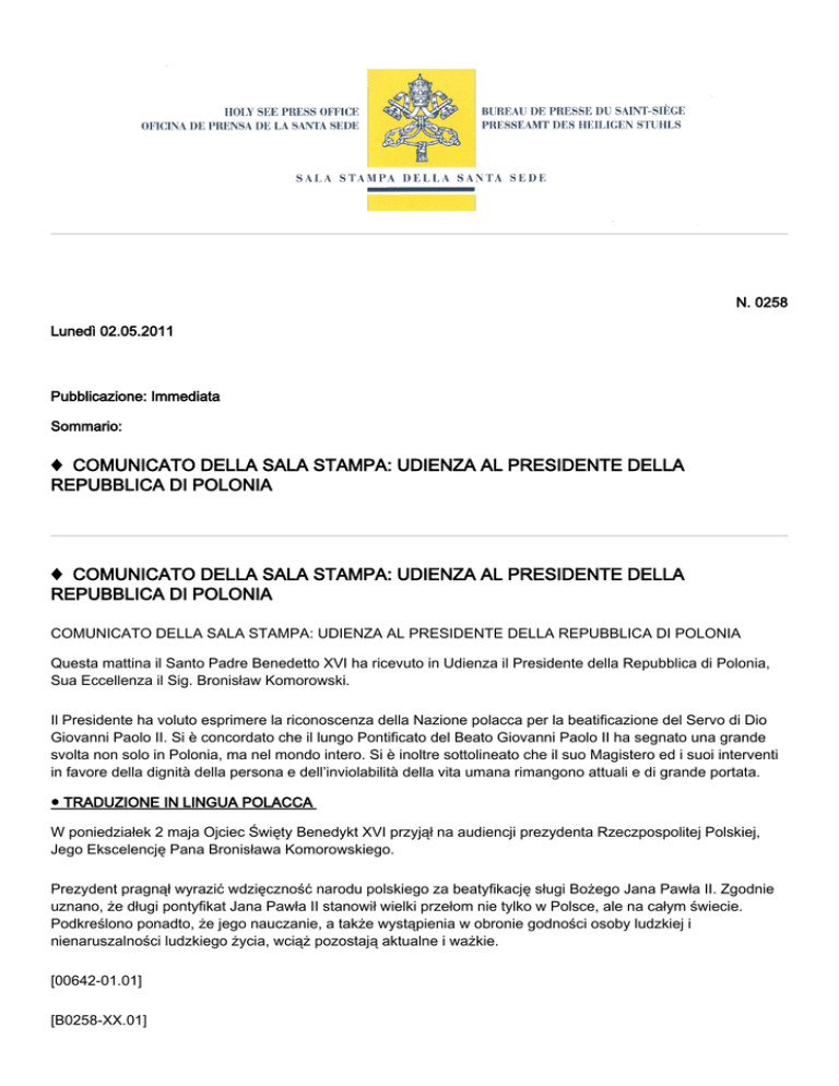 N. 0258 Lunedì 02.05.2011 Pubblicazione: Immediata Sommario: ♦ COMUNICATO DELLA SALA STAMPA: UDIENZA AL PRESIDENTE DELLA REPUBBLICA DI POLONIA ♦ COMUNICATO DELLA SALA STAMPA: UDIENZA AL PRESIDENTE DELLA REPUBBLICA DI POLONIA COMUNICATO DELLA SALA STAMPA: UDIENZA AL PRESIDENTE DELLA REPUBBLICA DI POLONIA Questa mattina il Santo Padre Benedetto XVI ha ricevuto in Udienza il Presidente della Repubblica di Polonia, Sua Eccellenza il Sig. Bronisław Komorowski. Il Presidente ha voluto esprimere la riconoscenza della Nazione polacca per la beatificazione del Servo di Dio Giovanni Paolo II. Si è concordato che il lungo Pontificato del Beato Giovanni Paolo II ha segnato una grande svolta non solo in Polonia, ma nel mondo intero. Si è inoltre sottolineato che il suo Magistero ed i suoi interventi in favore della dignità della persona e dell’inviolabilità della vita umana rimangono attuali e di grande portata. ● TRADUZIONE IN LINGUA POLACCA W poniedziałek 2 maja Ojciec Święty Benedykt XVI przyjął na audiencji prezydenta Rzeczpospolitej Polskiej, Jego Ekscelencję Pana Bronisława Komorowskiego. Prezydent pragnął wyrazić wdzięczność narodu polskiego za beatyfikację sługi Bożego Jana Pawła II. Zgodnie uznano, że długi pontyfikat Jana Pawła II stanowił wielki przełom nie tylko w Polsce, ale na całym świecie. Podkreślono ponadto, że jego nauczanie, a także wystąpienia w obronie godności osoby ludzkiej i nienaruszalności ludzkiego życia, wciąż pozostają aktualne i ważkie. [00642-01.01] [B0258-XX.01] Bollettino N. 0258 - 02.05.2011 2