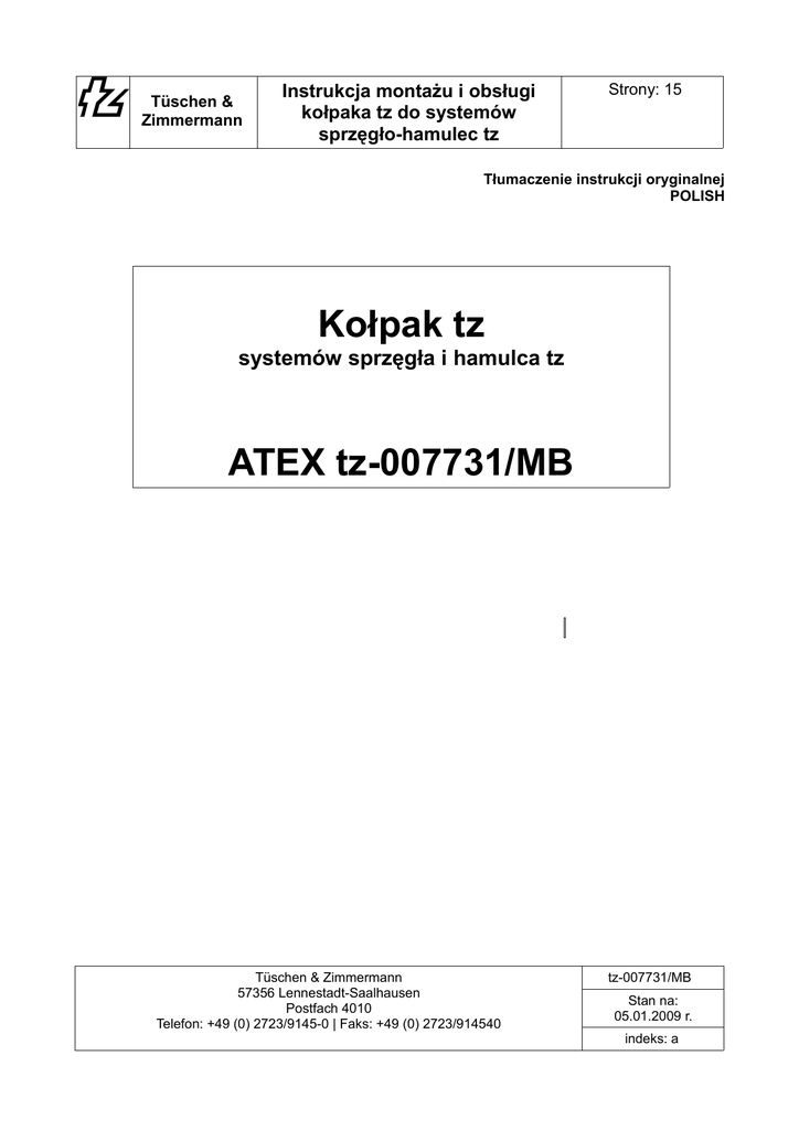 Tüschen & Zimmermann Instrukcja montażu i obsługi kołpaka tz do systemów sprzęgło-hamulec tz Strony: 15 Tłumaczenie instrukcji oryginalnej POLISH Kołpak tz systemów sprzęgła i hamulca tz ATEX tz-007731/MB Tüschen & Zimmermann 57356 Lennestadt-Saalhausen Postfach 4010 Telefon: +49 (0) 2723/9145-0 | Faks: +49 (0) 2723/914540 tz-007731/MB Stan na: 05.01.2009 r. indeks: a Informacje ogólne • • Kołpaki tz do systemów sprzęgła i hamulca zostały skonstruowane i wyprodukowane jako kołpaki łączące pomiędzy maszyną napędową i roboczą. Chronią one: osoby przed elementami wirującymi we wnętrzu kołpaka, sprzęgła i tarcze hamulcowe przed uszkodzeniami mechanicznymi od zewnątrz oraz służą do montażu elementów hamulców lub elementów mocujących. Typy urządzeń Krótkie oznaczenie typoszeregu: Typ standardowy tz-SSV-S30 tz-230 / SSV / DU / S30 Wielkość sprzęgła 230, 260, 300 lub 360 Typ sprzęgła SSV lub SV-3 Przyporządkowanie sprzęgieł SP lub DU Typ tarczy hamulcowej S15 lub S30 Producent Dane techniczne: Położenie montażowe: Tüschen & Zimmermann (adres patrz strona tytułowa) Masa (włącznie z pojemnikiem transportowym) Patrz tabela w artykule 1.4.1 Wymiary Patrz tabela w artykule 1.4.1 Dowolne Teksty wyróżnione słowami „Zagrożenie!”, „Ostrzeżenie!”, „Ostrożnie!”, „Uwaga!” informują o możliwych niebezpieczeństwach wypadku lub obrażeń albo uszkodzenia urządzenia czy zanieczyszczenia środowiska. Starannie przechowywać niniejszą instrukcję obsługi! W chwili przekazywania urządzenia użytkownikowi należy bezwzględnie wręczyć mu tę instrukcję obsługi. W przypadku nieprawidłowej obsługi urządzenia wyklucza się odpowiedzialność za ewentualne szkody. Zastrzega się możliwość zmian, służących postępowi technicznemu. Copyright T&Z 2008 Nota ochronna wg DIN 34 Kołpak Spis Spis treści 1. Informacje ogólne.............................................................................................................................................................. 7 1.1 Wprowadzenie, informacje ogólne............................................................................................................................ 7 1.1.2 Wskazówki i przepisy dotyczące zastosowania w przestrzeniach zagrożonych wybuchem............................7 1.2 Ogólne wskazówki bezpieczeństwa.......................................................................................................................... 8 1.2.1 Prace przy produkcie........................................................................................................................................ 8 1.2.3 Ochrona przed promieniowaniem cieplnym......................................................................................................8 1.2.4 Transport, montaż, demontaż........................................................................................................................... 8 1.2.5 Personel............................................................................................................................................................ 8 1.2.5 Eksploatacja, konserwacja i utrzymywanie w stanie sprawności.....................................................................8 1.2.6 Ochrona środowiska......................................................................................................................................... 9 1.2.7. Pozostałe zagrożenia...................................................................................................................................... 9 1.3 Opis urządzenia....................................................................................................................................................... 10 1.3.1 Informacje ogólne........................................................................................................................................... 10 1.3.2 Konstrukcja mechaniczna............................................................................................................................... 11 1.4 Kołpaki tz................................................................................................................................................................. 12 1.4.1 SSV/S15......................................................................................................................................................... 12 1.4.2 SSV/S30......................................................................................................................................................... 13 1.4.3 SV3/S15.......................................................................................................................................................... 14 1.4.4 SV3/S30.......................................................................................................................................................... 15 1.4.5 SSV/ –............................................................................................................................................................. 16 2 Serwis.............................................................................................................................................................................. 17 2.1 Naprawy i przeglądy................................................................................................................................................ 17 2.2 Wskazówki bezpieczeństwa.................................................................................................................................... 17 2.2.1 Informacje ogólne........................................................................................................................................... 17 2.3 Utylizacja...........................................................................................................