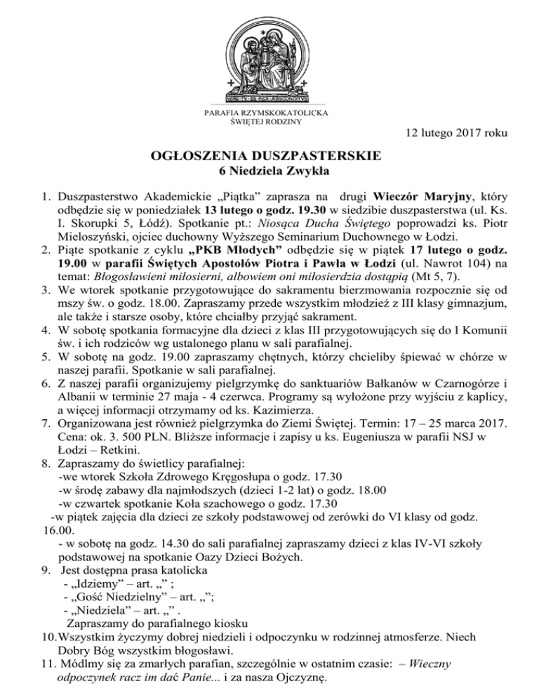 PARAFIA RZYMSKOKATOLICKA ŚWIĘTEJ RODZINY 12 lutego 2017 roku OGŁOSZENIA DUSZPASTERSKIE 6 Niedziela Zwykła 1. Duszpasterstwo Akademickie „Piątka” zaprasza na drugi Wieczór Maryjny, który odbędzie się w poniedziałek 13 lutego o godz. 19.30 w siedzibie duszpasterstwa (ul. Ks. I. Skorupki 5, Łódź). Spotkanie pt.: Niosąca Ducha Świętego poprowadzi ks. Piotr Mieloszyński, ojciec duchowny Wyższego Seminarium Duchownego w Łodzi. 2. Piąte spotkanie z cyklu „PKB Młodych” odbędzie się w piątek 17 lutego o godz. 19.00 w parafii Świętych Apostołów Piotra i Pawła w Łodzi (ul. Nawrot 104) na temat: Błogosławieni miłosierni, albowiem oni miłosierdzia dostąpią (Mt 5, 7). 3. We wtorek spotkanie przygotowujące do sakramentu bierzmowania rozpocznie się od mszy św. o godz. 18.00. Zapraszamy przede wszystkim młodzież z III klasy gimnazjum, ale także i starsze osoby, które chciałby przyjąć sakrament. 4. W sobotę spotkania formacyjne dla dzieci z klas III przygotowujących się do I Komunii św. i ich rodziców wg ustalonego planu w sali parafialnej. 5. W sobotę na godz. 19.00 zapraszamy chętnych, którzy chcieliby śpiewać w chórze w naszej parafii. Spotkanie w sali parafialnej. 6. Z naszej parafii organizujemy pielgrzymkę do sanktuariów Bałkanów w Czarnogórze i Albanii w terminie 27 maja - 4 czerwca. Programy są wyłożone przy wyjściu z kaplicy, a więcej informacji otrzymamy od ks. Kazimierza. 7. Organizowana jest również pielgrzymka do Ziemi Świętej. Termin: 17 – 25 marca 2017. Cena: ok. 3. 500 PLN. Bliższe informacje i zapisy u ks. Eugeniusza w parafii NSJ w Łodzi – Retkini. 8. Zapraszamy do świetlicy parafialnej: -we wtorek Szkoła Zdrowego Kręgosłupa o godz. 17.30 -w środę zabawy dla najmłodszych (dzieci 1-2 lat) o godz. 18.00 -w czwartek spotkanie Koła szachowego o godz. 17.30 -w piątek zajęcia dla dzieci ze szkoły podstawowej od zerówki do VI klasy od godz. 16.00. - w sobotę na godz. 14.30 do sali parafialnej zapraszamy dzieci z klas IV-VI szkoły podstawowej na spotkanie Oazy Dzieci Bożych. 9. Jest dostępna prasa katolicka - „Idziemy” – art. „” ; - „Gość Niedzielny” – art. „”; - „Niedziela” – art. „” . Zapraszamy do parafialnego kiosku 10.Wszystkim życzymy dobrej niedzieli i odpoczynku w rodzinnej atmosferze. Niech Dobry Bóg wszystkim błogosławi. 11. Módlmy się za zmarłych parafian, szczególnie w ostatnim czasie: – Wieczny odpoczynek racz im dać Panie... i za nasza Ojczyznę.