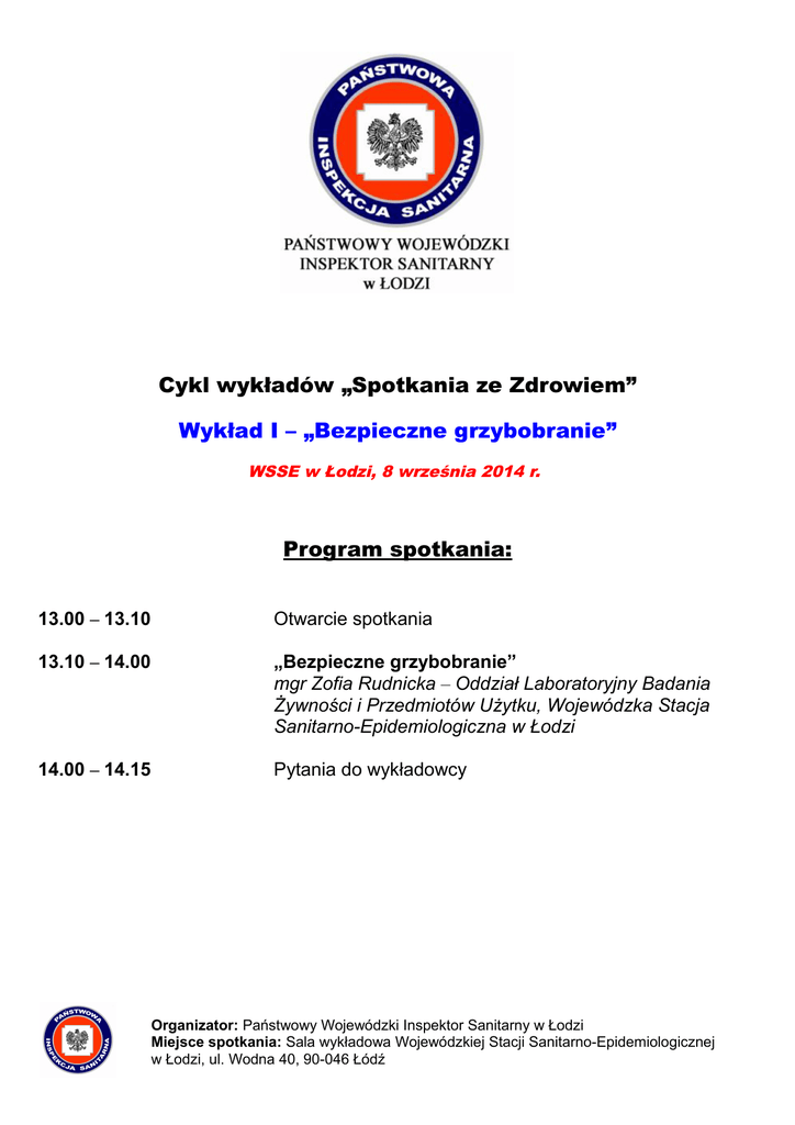 Cykl wykładów „Spotkania ze Zdrowiem” Wykład I – „Bezpieczne grzybobranie” WSSE w Łodzi, 8 września 2014 r. Program spotkania: 13.00 – 13.10 Otwarcie spotkania 13.10 – 14.00 „Bezpieczne grzybobranie” mgr Zofia Rudnicka – Oddział Laboratoryjny Badania Żywności i Przedmiotów Użytku, Wojewódzka Stacja Sanitarno-Epidemiologiczna w Łodzi 14.00 – 14.15 Pytania do wykładowcy Organizator: Państwowy Wojewódzki Inspektor Sanitarny w Łodzi Miejsce spotkania: Sala wykładowa Wojewódzkiej Stacji Sanitarno-Epidemiologicznej w Łodzi, ul. Wodna 40, 90-046 Łódź