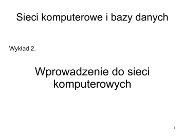 Sieci komputerowe i bazy danych Wykład 2. Wprowadzenie do sieci komputerowych 1 Idea sieci komputerowej Sieć, czyli zbiór autonomicznych komputerów połączonych wzajemnie podsiecią komunikacyjną; umożliwia zwiększenie zasobów i korzystanie z nich przez wielu użytkowników jednocześnie. Definicja sieci lokalnej LAN (Local Area Network): a) (wg. IEEE) Sieć lokalna jest to system umożliwiający bezpośrednią komunikację wielu niezależnych urządzeń, rozmieszczonych na stosunkowo niewielkim obszarze za pośrednictwem fizycznych kanałów komunikacyjnych o umiarkowanej prędkości. b) (wg. leksykonu teleinformatyka) Sieć łącząca grupę użytkowników, pracujących na stosunkowo niewielkim obszarze (grupa robocza, oddział firmy, budynek, przedsiębiorstwo, kampus). Sieci lokalne transmitują dane w trybie bezpołączeniowym z szybkością od 10 Mb/s do 10 Gb/s. Najstarszy, stale rozwijany standard LAN, czyli Ethernet, ma typową przepływność 10 Mb/s , jego szybsza wersja, Fast Ethernet, osiąga 100 Mb/s (100Base-T, 100VGAnyLAN), nowa wersja Gigabit Ethernet pracuje z przepływnością 1 Gb/s. 2 Jaki jest cel tworzenia sieci komputerowych? • Efektywne wykorzystanie zasobów sprzętowych i programowych będących w dyspozycji rozproszonych użytkowników. • Dzielenie zasobów logicznych (baz danych, specjalizowanych programów). • Dzielenie zasobów fizycznych (drukarek, ploterów, pamięci masowych, urządzeń łączności). • Przesyłanie informacji w postaci elektronicznej tekstowej lub binarnej (poczta elektroniczna, irc, VoIP, wideo) 3 Inne ważne cele tworzenia sieci komputerowych to: • Wyższa niezawodność usług (udostępnienie alternatywnych źródeł informacji, możliwości obliczeniowych, dróg połączeniowych). • Oszczędności finansowe (koszty transmisji małe w porównaniu z jednostkowymi kosztami obliczeń). 4 Elementy składowe sieci Elementy sprzętowe • Urządzenia transmisji sygnałów – kable, nośniki niematerialne • Urządzenia dostępu – karty sieciowe – formatowanie danych – umieszczanie danych w sieci • Urządzenia wzmacniające przesyłane sygnały – regeneracja sygnału – wzmocnienie sygnału 5 Elementy składowe sieci Elementy programowe • Protokoły – określają i regulują sposoby komunikowania się urządzeń • Sterowniki urządzeń - umożliwiają działanie urządzeniom (takim np. jak karty sieciowe) • Oprogramowanie komunikacyjne 6 Co to jest protokół komunikacyjny? protokół “ludzki” oraz protokół komputerowy rządanie połączenia (TCP) Cześć Witaj odpowiedź na rządanie (TCP) Która jest godzina? Get http://www.agh.edu.pl/index.html 2:00 <plik> czas 21/10/08 CS4119 #1 7 Protokoły komunikacyjne Definicja • Protokół to zbiór reguł określający zasady nawiązywania komunikacji, szybkość transmisji, format przesyłania danych oraz sposób potwierdzenia przyjęcia informacji pomiędzy urządzeniami w sieci komputerowej. 8 Protokoły sieciowe • NetBEUI (NetBIOS Extended User Interface) – opracowany w 1985 przez IBM, używany w środowisku Windows • TCP/IP (Transmission Control Protocol/Internet Protocol) – opracowany w latach ’70 przez agencję DARPA na zlecenie Departamentu Obrony USA. • IPX/SPX (Internet Packet Exchange/Sequential Packet Exchange) – używany do transmisji w sieciach opartych na systemie Novell Netware 9 Rodzaje komputerów w sieci • Serwery • Dedykowane - umożliwiające użytkownikom dostęp do swoich usług, nie można na nich uruchamiac programów, • Niededykowane, umożliwiające dostęp do aplikacji, plików, drukarek, • Specjalizowane, przeznaczone do realizacji specjalnych usług, takich jak obsługa poczty elektronicznej. • Stacje robocze. 10 Rodzaje serwerów, czyli komputerów służących do zarządzania siecią • • • • Serwer Serwer Serwer Serwer plików • Serwer • Serwer sieciowy – wspólne korzystanie z zasobów sieci baz danych – wspólne korzystanie z danych WWW – wspólne korzystnie ze stron WWW FTP – wspólne korzystnie z usług pobierania druku – wspólne korzystanie z drukarek aplikacji – wspólne korzystanie z programów. Stosuje się także sieci bez wydzielonego serwera – równorzędne lub równoprawne. 11 Czym się różnią od siebie podsieci komunikacyjne? • Szybkością transmisji (ilością danych możliwych do przesłania w jednostce czasu). • Opóźnieniami propagacyjnymi. • Efektywnością wykorzystania łączy. • Maksymalnym zasięgiem. 12 Sieci PAN USB IrDA Bluetooth Firewire PAN jest siecią komputerową pozwalającą na komunikację pomiędzy urządzeniami znajdującymi się blisko siebie. Sieci LAN Local Area Network Umożliwiają wymianę zbiorów informacji, wspólne użytkowanie zasobów oraz komunikatów między użytkownikami znajdującymi się na niewielkim obszarze geograficznym (zwykle laboratorium, biuro). Szybkość transmisji: 1 Mb/s - kilka Gb/s 14 Sieci MAN Metropolitan Area Network Umożliwiają wymianę zbiorów informacji (Files), wspólne użytkowanie zasobów oraz komunikatów między użytkownikami znajdującymi się na obszarze geograficznym o średnicy do około 50 km. Szybkość transmisji: kilka Mb/s - setki Mb/s 15 Sieci WAN Widea Area Network Sieci rozległe łączą ze sobą oddzielne sieci LAN, MAN używając do tego celu zwykłych sieci telefonicznych, łącz satelitarnych lub innych rodzajów mediów. Szybkość transmisji: kilka kb/s - kilkadziesiąt Mb/s 16 Usługi dostępne w sieci • Transfer zbiorów i obsługę poczty elektronicznej. • Zdalne uaktualnianie programów i zdalne wykonywanie obliczeń. • Zdalny dostęp do: – baz danych, – serwisów informacyjnych, – usług finansowych, – informacji bibliotecznych, – automatycznych gazet. 17 Aplikacje są udostępniane przez nowoczesne sieci komputerowe? • Telekonferencje i wideokonferencje. • Przekaz mowy, obrazów stałych i ruchomych. • Wybór programów TV, b