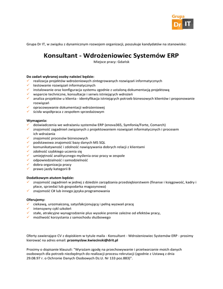 Grupa Dr IT, w związku z dynamicznym rozwojem organizacji, poszukuje kandydatów na stanowisko: Konsultant - Wdrożeniowiec Systemów ERP Miejsce pracy: Gdańsk Do zadań wybranej osoby należeć będzie: realizacja projektów wdrożeniowych zintegrowanych rozwiązań informatycznych testowanie rozwiązań informatycznych instalowanie oraz konfiguracja systemu zgodnie z ustaloną dokumentacją projektową wsparcie techniczne, konsultacje i serwis istniejących wdrożeń analiza projektów u klienta - identyfikacja istniejących potrzeb biznesowych klientów i proponowanie rozwiązań opracowywanie dokumentacji wdrożeniowej ścisła współpraca z zespołem sprzedażowym Wymagania: doświadczenia we wdrażaniu systemów ERP (enova365, Symfonia/Forte, Comarch) znajomość zagadnień związanych z projektowaniem rozwiązań informatycznych i procesem ich wdrażania znajomość procesów biznesowych podstawowa znajomość bazy danych MS SQL komunikatywność i zdolność nawiązywania dobrych relacji z klientami zdolność szybkiego uczenia się umiejętność analitycznego myślenia oraz pracy w zespole odpowiedzialność i samodzielność dobra organizacja pracy prawo jazdy kategorii B Dodatkowym atutem będzie: znajomość zagadnień w jednej z dziedzin zarządzania przedsiębiorstwem (finanse i księgowość, kadry i płace, sprzedaż lub gospodarka magazynowa) znajomość C# lub innego języka programowania Oferujemy: ciekawą, urozmaiconą, satysfakcjonującą i pełną wyzwań pracę intensywny cykl szkoleń stałe, atrakcyjne wynagrodzenie plus wysokie premie zależne od efektów pracy, możliwość korzystania z samochodu służbowego Oferty zawierające CV z dopiskiem w tytule maila - Konsultant - Wdrożeniowiec Systemów ERP - prosimy kierować na adres email: [email protected] Prosimy o dopisanie klauzuli: "Wyrażam zgodę na przechowywanie i przetwarzanie moich danych osobowych dla potrzeb niezbędnych do realizacji procesu rekrutacji (zgodnie z Ustawą z dnia 29.08.97 r. o Ochronie Danych Osobowych Dz.U. Nr 133 poz.883)".