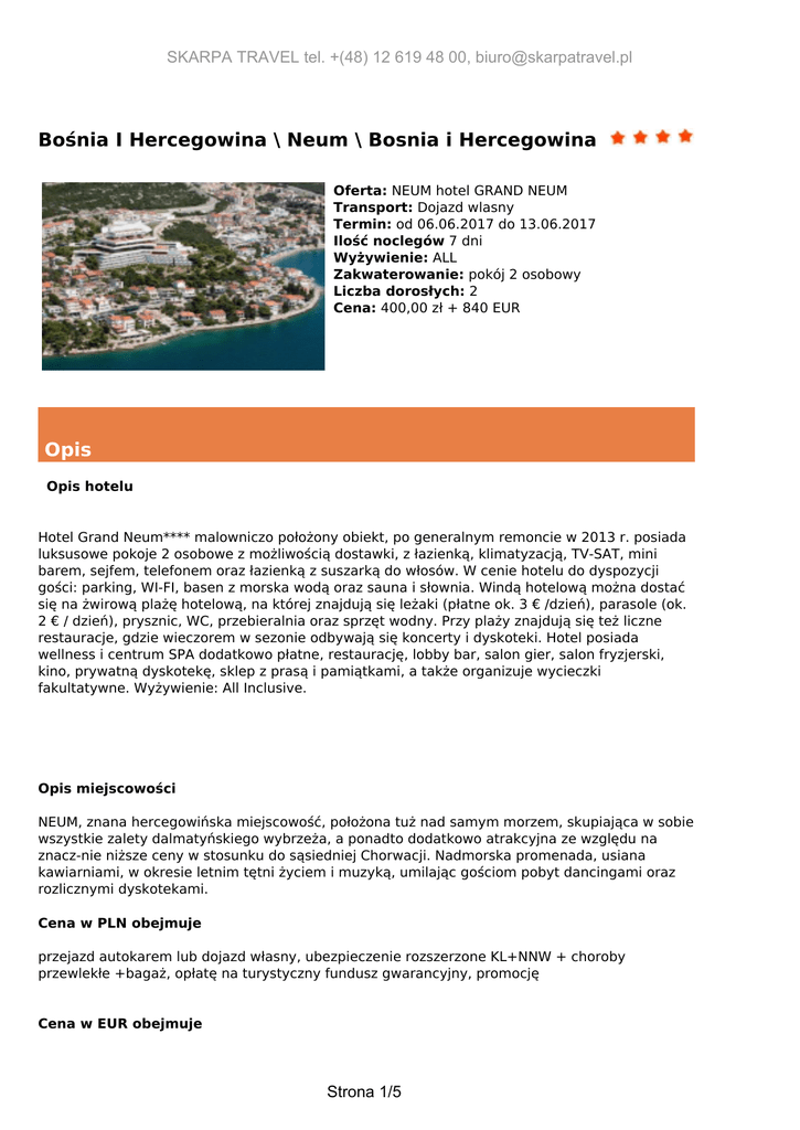 SKARPA TRAVEL tel. +(48) 12 619 48 00, [email protected] Bośnia I Hercegowina \ Neum \ Bosnia i Hercegowina Oferta: NEUM hotel GRAND NEUM Transport: Dojazd wlasny Termin: od 06.06.2017 do 13.06.2017 Ilość noclegów 7 dni Wyżywienie: ALL Zakwaterowanie: pokój 2 osobowy Liczba dorosłych: 2 Cena: 400,00 zł + 840 EUR Opis Opis hotelu Hotel Grand Neum**** malowniczo położony obiekt, po generalnym remoncie w 2013 r. posiada luksusowe pokoje 2 osobowe z możliwością dostawki, z łazienką, klimatyzacją, TV-SAT, mini barem, sejfem, telefonem oraz łazienką z suszarką do włosów. W cenie hotelu do dyspozycji gości: parking, WI-FI, basen z morska wodą oraz sauna i słownia. Windą hotelową można dostać się na żwirową plażę hotelową, na której znajdują się leżaki (płatne ok. 3 € /dzień), parasole (ok. 2 € / dzień), prysznic, WC, przebieralnia oraz sprzęt wodny. Przy plaży znajdują się też liczne restauracje, gdzie wieczorem w sezonie odbywają się koncerty i dyskoteki. Hotel posiada wellness i centrum SPA dodatkowo płatne, restaurację, lobby bar, salon gier, salon fryzjerski, kino, prywatną dyskotekę, sklep z prasą i pamiątkami, a także organizuje wycieczki fakultatywne. Wyżywienie: All Inclusive. Opis miejscowości NEUM, znana hercegowińska miejscowość, położona tuż nad samym morzem, skupiająca w sobie wszystkie zalety dalmatyńskiego wybrzeża, a ponadto dodatkowo atrakcyjna ze względu na znacz-nie niższe ceny w stosunku do sąsiedniej Chorwacji. Nadmorska promenada, usiana kawiarniami, w okresie letnim tętni życiem i muzyką, umilając gościom pobyt dancingami oraz rozlicznymi dyskotekami. Cena w PLN obejmuje przejazd autokarem lub dojazd własny, ubezpieczenie rozszerzone KL+NNW + choroby przewlekłe +bagaż, opłatę na turystyczny fundusz gwarancyjny, promocję Cena w EUR obejmuje Strona 1/5 SKARPA TRAVEL tel. +(48) 12 619 48 00, [email protected] 7, 9 lub 14 noclegów, wyżywienie All Inclusive Dopłaty 1. Obowiązkowa taksa klimatyczna płatna na miejscu: 1 EUR dziennie/osoba powyżej 12 lat. 2. Do pokoju 1 osobowego 40 % kwoty EUR 3. Do pokoju z widokiem na morze 8 EUR / dzień / osoba (konieczna wcześniejsza rezerwacja) 4. Do łóżeczka dziecięcego 5 EUR/ dzień 5. Wynajęcie garażu 5 EUR / dzień (konieczna wcześniejsza rezerwacja). Zniżki W cenie uwzględniona PROMOCJĘ FIRST MINUTE: przy dojeździe autokarem – 100 zł / osoba przy dojeździe własnym – 50 zł / osoba 1. Dziecko do 7 lat jako 3 osoba w pokoju bez łóżka płaci tylko 360 zł 2. Dziecko do 7 lat jako 3 osoba w pokoju z łóżkiem płaci kwote w zł + 50% kwoty EUR 3. Dziecko 7-12 lat jako 3 osoba w pokoju z łóżkiem płaci kwote w zł + 70% kwoty EUR 4. Pokój 3 osobowy dla osób dorosłych na zamówienie (wyższa cena o ok. 60 EUR/ osoba/7 dni). 5. STAŁY KLIENT: obejmuje osoby korzystające trzeci kolejny rok z naszej oferty ! Uwagi organizatora 1.Kwota w złotych płatna jest w Polsce, kwota w EUR płatna w Neumie. 2.Przy dojeździe własnym, gdy potrzebna jest faktura na całość i przy zakupie ubezpieczenia od kosztów rezygnacji wtedy obowiązkowo równowartość kwoty w EUR płatna jest w Polsce. Kwota w EUR przeliczana jest na zł wg kursu NBP pieniądz sprzedaż z dnia ostatniej wpłaty. 3.W dniu wykupienia imprezy/ wpłaty zaliczki klient ma możliwość wykupienia dodatkowego ubezpieczenia od kosztów rezygnacji z imprezy zgodnie z Ogólnymi Warunkmi Ubezpieczenia KOSZTÓW IMPREZY TURYSTYCZNEJ w wysokości 3,3% jednak nie później niż 5 dni od dnia podpisania umowy. 4. Wycieczki fakultatywne organizowane są przez lokalne biura podróży. Strona 2/5 SKARPA TRAVEL tel. +(48) 12 619 48 00, [email protected] 5.Doba hotelowa rozpoczyna się o godz 14 i kończy o godz 9. 6. Miejsca i godziny odjazdów autokarów podano w rozkładzie jazdy 7. Potrzebny DOWÓD OSOBISTY lub PASZPORT ! Prosze pamiętać również o dokumencie dla dzieci. 8. Dla osób dojeżdżających do Krakowa możemy zarezerwować przednocleg w cenie od 100 zł. Uwagi przewoźnika 1.Transport na trasach antenowych w Polsce możliwy jest mikrobusem, autokarem klasy turystycznej, samochodem osobowym lub innym przewoźnikiem np. Polskim Busem, Luxbusem, PKP, PKS itp. Ewentualną zmianę godzin odjazdów podamy najpóźniej na 24 godziny przed odjazdem. Trasa połączeń na terenie kraju zależy od zgłoszeń z poszczególnych miast, co może spowodować, ze przejazd nie będzie realizowany najkrótszą z możliwych tras. 2. Na trasach poza granicami Polski transport odbywa się autokarami wyposażonymi w siedzenia uchylne, klimatyzację, toalety, video i nagłośnienie. Przy małej ilości osób, możliwość przewozu uczestników małym autobusem bez WC i mini baru, wtedy toalety na postojach płatne przez przewoźnika. 3. Podane godziny wyjazdów i przyjazdów mogą ulec zmianie z różnych przyczyn np. złe warunki drogowe, atmosferyczne, zwiększanie ruchu na drogach szczególnie w szczycie sezonu letniego i inne. 4. Prosimy o przybycie na miejsce zbiórki najpóźniej 15 minut przed planowaną godziną odjazdu. Miejsca w autokarze są przydzielane w kolejności podpisania umowy, a klienci o miejscach informowani są przez obsługę na miejscu zbiórki. W autokarze obowiązuje całkowity zakaz palenia papierosów oraz spożywania alkoholu. Osoby korzystające z samego przejazdu, powinny obowiązkowo ubezpieczyć się na czas pobytu. Przewoźnik gwarantuje tylko ubezpieczenie na czas przejazdu. Ramowy program imprezy (klasyczny 7 noclegowy) 1 dzień Wyjazd z Polski zgodnie z rozkładem jazdy, przejazd przez Słowację (dla chętnych posiłek w cenie ok. 5 EUR), Węgry i Chorwację. 2 dzień Przejazd przez Chorwację do Bośnii i Hercegowiny, przyjazd na miejsce wypoczynku w godzinach porannych. Zakwaterowanie od godz.14, obiadokolacja, nocleg. 3 – 8 dzień WYPOCZYNEK. Możliwość wykupienia wycieczek fakultatywnych. 9 dzień śniadanie, wykwaterowanie z hotelu do godz.