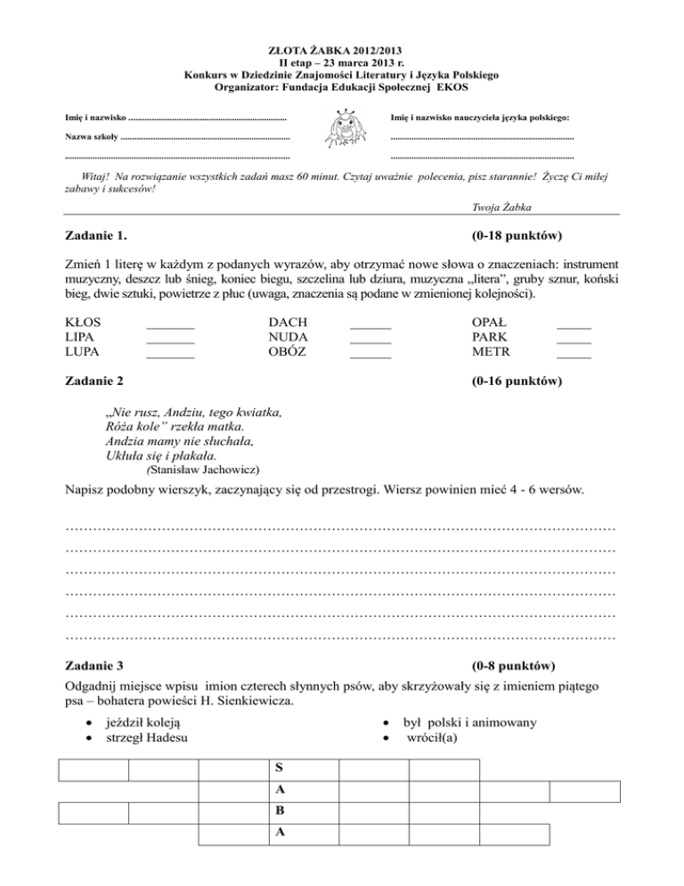 ZŁOTA ŻABKA 2012/2013 II etap – 23 marca 2013 r. Konkurs w Dziedzinie Znajomości Literatury i Języka Polskiego Organizator: Fundacja Edukacji Społecznej EKOS Imię i nazwisko ..................................................................... Imię i nazwisko nauczyciela języka polskiego: Nazwa szkoły .......................................................................... ................................................................................ .................................................................................................. ................................................................................ Witaj! Na rozwiązanie wszystkich zadań masz 60 minut. Czytaj uważnie polecenia, pisz starannie! Życzę Ci miłej zabawy i sukcesów! Twoja Żabka (0-18 punktów) Zadanie 1. Zmień 1 literę w każdym z podanych wyrazów, aby otrzymać nowe słowa o znaczeniach: instrument muzyczny, deszcz lub śnieg, koniec biegu, szczelina lub dziura, muzyczna „litera”, gruby sznur, koński bieg, dwie sztuki, powietrze z płuc (uwaga, znaczenia są podane w zmienionej kolejności). KŁOS LIPA LUPA _______ _______ _______ DACH NUDA OBÓZ ______ ______ ______ OPAŁ PARK METR _____ _____ _____ (0-16 punktów) Zadanie 2 „Nie rusz, Andziu, tego kwiatka, Róża kole” rzekła matka. Andzia mamy nie słuchała, Ukłuła się i płakała. (Stanisław Jachowicz) Napisz podobny wierszyk, zaczynający się od przestrogi. Wiersz powinien mieć 4 - 6 wersów. ………………………………………………………………………………………………………… ………………………………………………………………………………………………………… ………………………………………………………………………………………………………… ………………………………………………………………………………………………………… ………………………………………………………………………………………………………… ………………………………………………………………………………………………………… (0-8 punktów) Zadanie 3 Odgadnij miejsce wpisu imion czterech słynnych psów, aby skrzyżowały się z imieniem piątego psa – bohatera powieści H. Sienkiewicza. jeździł koleją strzegł Hadesu S A B A był polski i animowany wrócił(a) (0-14 punktów) Zadanie 4 Na podstawie dialogu stwórz alfabetyczną listę kupionych przez Jana produktów: Anna: Nareszcie wróciłeś. Wszystko kupiłeś? No, zobaczymy, co my tu mamy... Śmietana. Jan: Nie napisałaś, jaką mam kupić, to kupiłem 18% i 30%, każda po 250 mililitrów. Pomyślałem, że tę, która zostanie, wykorzystamy do deseru truskawkowego. Owoce kupiłem, ale tylko trochę, bo wydawały mi się drogie. Kilogram za 7 zł, więc ograniczyłem się do połowy tej sumy. Anna: No, w porządku. Patrzmy dalej. Co to? Jan: Herbatka owocowa, powąchaj, jak pachnie, same maliny! Anna: Przecież miałeś kupić kawę? Jan: Zapomniałem, przepraszam, ale za to zobacz, jaki kurczak, waży prawie dwa kilo! Anna: No nie, miały być ryby! Jan: Ale nie było, więc kupiłem kurczaka. Pomyślałem, że jak jeszcze dokupię pieczarki, zobacz, jakie dorodne, cały kilogram, to zrobimy potrawkę! Anna: Do kurczaka potrzebuję ryż, a nie mamy w domu ani grama! Jan: Spokojnie, kupiłem dwie stugramowe paczki, będzie na dwa razy. Anna: A pomidory? Kupiłeś pomidory na sałatkę? Jan: Za kogo mnie masz? Nie było pomidorów, ale kupiłem dwa ogórki, są tam gdzieś na spodzie torby. Odpowiedź: ………………………………………………………...……………………………… ………………………………………………………….…………...……………………………… (0-24 punktów) Zadanie 5 Zadanie z poprzedniej edycji Na podstawie lektury fragmenty tekstu zadecyduj, które z podanych twierdzeń jest prawdziwe (P), fałszywe (F), a o którego prawdziwości nie można zadecydować (?). Wstaw odpowiednie znaki w pustą rubrykę. (...) Pewnej wiosny, kiedy kwitły właśnie obficie sady rumiankowe (w Lailonii rumianek jest ogromnym drzewem dochodzącym do sześciu poninów wysokości; ponin to miara długości, która wynosi mniej więcej tyle, co wielkość rogów czteroletniego daniela), a strumienie mirżowe płynęły na wszystkie strony (strumienie mirżowe w Lailonii płyną tylko na wiosnę, żłobiąc sobie koryta poprzez miasta, burząc ulice i domy; ludzie nie przejmują się tym zbytnio, bo latem zaś strumienie mirżowe znikają, a domy i ulice odrastają szybko z powrotem), kupiec Pigu wracał właśnie z podróży po korzystnych transakcjach, bardzo zadowolony. Zanim wrócił do własnego mieszkania, chciał zajrzeć do willi swojej Memi. Nie zastał jej jednak w domu, więc usiadł w salonie i wyjął swój przyrząd do dziurawienia globusów. (Kupiec Pigu bardzo lubił to zajęcie; lailońska fabryka przyrządów do dziurawienia globusów sprzedawała mu swoje wyroby po zniżonej cenie, ponieważ Pigu robił jej reklamę w Babilonie, dziurawiąc tamtejsze globusy). Bawił się przez chwilę, czekając na córkę, która podjechała po chwili na małym różowym słoniu bez ucha i już z daleka witała go, machając rękami. Leszek Kołakowski, Opowiadanie o zabawkach dla dzieci, w tegoż: Bajki różne, Warszawa 1990. 1. Mieszkańcy Lailonii wiosną nie wychodzą na ulicę. 2. Kupiec Pigu handluje przyrządami do dziurawienia globusów. 3. Córka kupca – Memi - jest właścicielką dużego salonu i różowego słonia bez ucha. 4. Miarą długości w Lailonii jest wielkość poroża daniela. 7. Wiosną Lailonia jest niszczona przez strumienie mirżowe. 8. Wtrącenia w tekście pełnią funkcję objaśnień. 5. W Lailonii rosną drzewa rumiankowe. 11. Bohater wiosną powrócił do Lailonii. 6. 