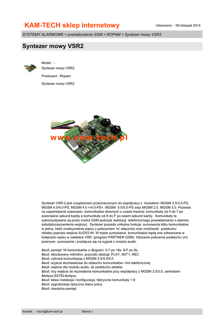 KAM-TECH sklep internetowy Utworzono : 06 listopad 2014 SYSTEMY ALARMOWE > powiadomienie GSM > ROPAM > Syntezer mowy VSR2 Syntezer mowy VSR2 Model : Syntezer mowy VSR2 Producent : Ropam Syntezer mowy VSR2 Syntezer VSR-2 jest urządzeniem przeznaczonym do współpracy z modułami: MGSM 3.5/3.5-PS, MGSM 4.0/4.0-PS, MGSM 4.0 +/4.0-PS+, MGSM 5.0/5.0-PS oraz MGSM 2.0, MGSM 3.0. Pozwala na zapamiętanie szesnastu komunikatów słownych o czasie trwania: komunikaty od 0 do 7 po szesnaście sekund każdy a komunikaty od 8 do F po osiem sekund każdy. Komunikaty te wykorzystywane są przez moduł GSM podczas realizacji telefonicznego powiadamiania o alarmie, sabotażu(wyzwolenia wejścia). Syntezer posiada unikalne funkcje: sumowania kilku komunikatów w jedną treść (maksymalnie pięciu z poleceniem 'm' włącznie) oraz możliwość podsłuchu obiektu poprzez wejście AUDIO-IN. W trybie sumowania komunikatów będą one odtwarzane w kolejności wpisu w zakładce VSR (program PARTNER GSM). Wpisanie polecenia podsłuchu (m) przerywa sumowanie i przełącza się na sygnał z modułu audio. • pamięć 16 komunikatów o długości: 0-7 po 16s. 8-F po 8s. • wbudowany mikrofon, przyciski obsługi: PLAY, NO*1, REC • cyfrowa komunikacja z MGSM 3.5/4.0/5.0 • wyjścia słuchawkowe do odsłuchu komunikatów i linii telefonicznej • wejście dla modułu audio, do podsłuchu obiektu • trzy wejścia do wyzwalania komunikatów przy współpracy z MGSM 2.0/3.0, centralami „SATEL” • łatwa instalacja i konfiguracja, fabryczne komunikaty 1-6 • sygnalizacja optyczna stanu pracy • nieulotna pamięć kontakt : - [email protected] Strona 1 KAM-TECH sklep internetowy Utworzono : 06 listopad 2014 SYSTEMY ALARMOWE > powiadomienie GSM > ROPAM > Syntezer mowy VSR2 Syntezer mowy VSR2 Cena : 120,54 zł Brutto ( 98,00 zł Netto) Dostępność: Produkt dostępny w naszym sklepie od 02 październik 2013 kontakt : - [email protected] Strona 2