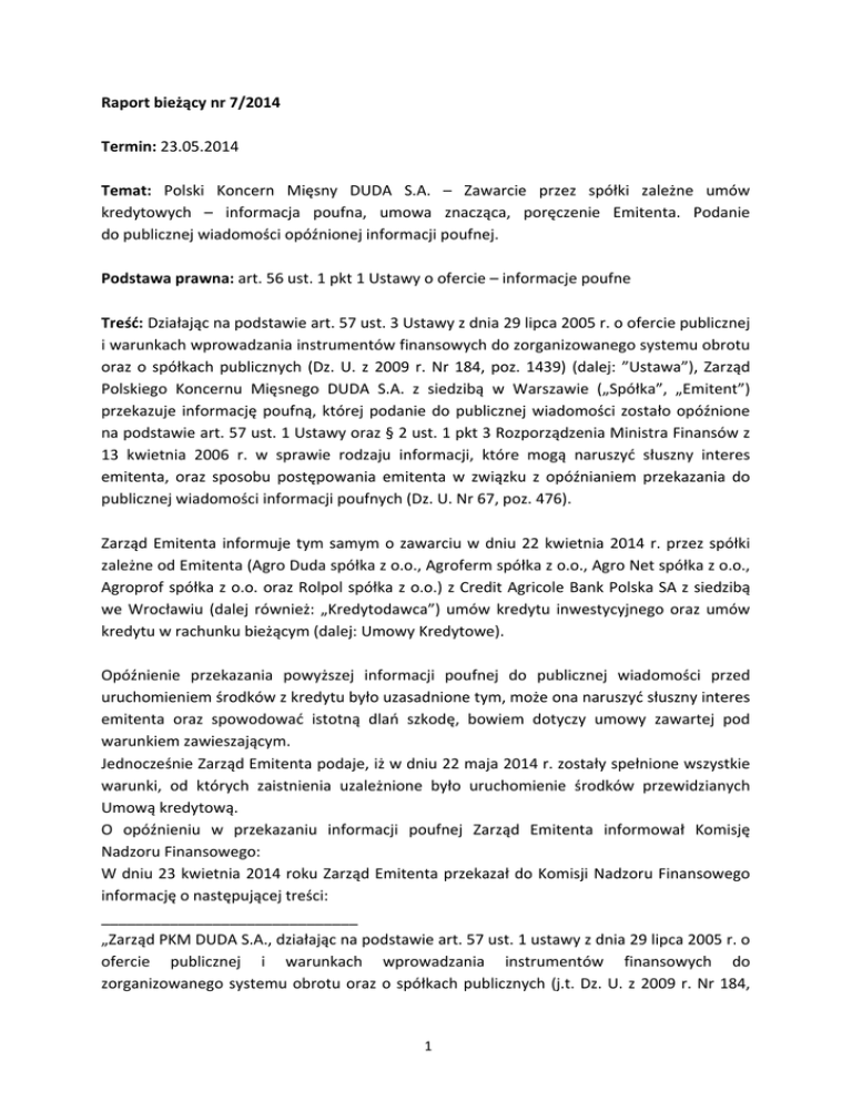 Raport bieżący nr 7/2014 Termin: 23.05.2014 Temat: Polski Koncern Mięsny DUDA S.A. – Zawarcie przez spółki zależne umów kredytowych – informacja poufna, umowa znacząca, poręczenie Emitenta. Podanie do publicznej wiadomości opóźnionej informacji poufnej. Podstawa prawna: art. 56 ust. 1 pkt 1 Ustawy o ofercie – informacje poufne Treść: Działając na podstawie art. 57 ust. 3 Ustawy z dnia 29 lipca 2005 r. o ofercie publicznej i warunkach wprowadzania instrumentów finansowych do zorganizowanego systemu obrotu oraz o spółkach publicznych (Dz. U. z 2009 r. Nr 184, poz. 1439) (dalej: ”Ustawa”), Zarząd Polskiego Koncernu Mięsnego DUDA S.A. z siedzibą w Warszawie („Spółka”, „Emitent”) przekazuje informację poufną, której podanie do publicznej wiadomości zostało opóźnione na podstawie art. 57 ust. 1 Ustawy oraz § 2 ust. 1 pkt 3 Rozporządzenia Ministra Finansów z 13 kwietnia 2006 r. w sprawie rodzaju informacji, które mogą naruszyć słuszny interes emitenta, oraz sposobu postępowania emitenta w związku z opóźnianiem przekazania do publicznej wiadomości informacji poufnych (Dz. U. Nr 67, poz. 476). Zarząd Emitenta informuje tym samym o zawarciu w dniu 22 kwietnia 2014 r. przez spółki zależne od Emitenta (Agro Duda spółka z o.o., Agroferm spółka z o.o., Agro Net spółka z o.o., Agroprof spółka z o.o. oraz Rolpol spółka z o.o.) z Credit Agricole Bank Polska SA z siedzibą we Wrocławiu (dalej również: „Kredytodawca”) umów kredytu inwestycyjnego oraz umów kredytu w rachunku bieżącym (dalej: Umowy Kredytowe). Opóźnienie przekazania powyższej informacji poufnej do publicznej wiadomości przed uruchomieniem środków z kredytu było uzasadnione tym, może ona naruszyć słuszny interes emitenta oraz spowodować istotną dlań szkodę, bowiem dotyczy umowy zawartej pod warunkiem zawieszającym. Jednocześnie Zarząd Emitenta podaje, iż w dniu 22 maja 2014 r. zostały spełnione wszystkie warunki, od których zaistnienia uzależnione było uruchomienie środków przewidzianych Umową kredytową. O opóźnieniu w przekazaniu informacji poufnej Zarząd Emitenta informował Komisję Nadzoru Finansowego: W dniu 23 kwietnia 2014 roku Zarząd Emitenta przekazał do Komisji Nadzoru Finansowego informację o następującej treści: ______________________________ „Zarząd PKM DUDA S.A., działając na podstawie art. 57 ust. 1 ustawy z dnia 29 lipca 2005 r. o ofercie publicznej i warunkach wprowadzania instrumentów finansowych do zorganizowanego systemu obrotu oraz o spółkach publicznych (j.t. Dz. U. z 2009 r. Nr 184, 1 poz. 1539), zwanej dalej “Ustawą” oraz § 2 ust. 1 pkt 3 rozporządzenia Ministra Finansów z 13 kwietnia 2006 r. w sprawie rodzaju informacji, które mogą naruszyć słuszny interes emitenta, oraz sposobu postępowania emitenta w związku z opóźnianiem przekazania do publicznej wiadomości informacji poufnych (Dz. U. Nr 67, poz. 476) przekazuje Komisji Nadzoru Finansowego informację o opóźnieniu wykonania obowiązku, o którym mowa w art. 56 ust. 1 pkt 1 Ustawy, w odniesieniu do informacji poufnej dotyczącej zawarcia przez spółki zależne umów kredytowych (informacja poufna, umowa znacząca, poręczenie Emitenta). Zarząd Polskiego Koncernu Mięsnego DUDA S.A. z siedzibą w Warszawie (dalej: „Spółka” lub „Emitent”) informuje, iż w dniu 23 kwietnia 2014 r. otrzymał informację o podpisaniu 22 kwietnia 2014 r. przez spółki zależne od Emitenta z Credit Agricole Bank Polska SA z siedzibą we Wrocławiu (dalej również: „Kredytodawca”) umów kredytu inwestycyjnego oraz umów kredytu w rachunku bieżącym (dalej: Umowy Kredytowe). Umowy Kredytowe podpisane zostały z Kredytodawcą przez spółki zależne Emitenta: Agro Duda spółka z o.o. (umowa kredytu inwestycyjnego, umowa kredytu w rachunku bieżącym), Agroferm spółka z o.o. (umowa kredytu inwestycyjnego, umowa kredytu w rachunku bieżącym), Agro Net spółka z o.o. (umowa kredytu inwestycyjnego, umowa kredytu w rachunku bieżącym), Agroprof spółka z o.o. (umowa kredytu w rachunku bieżącym) oraz Rolpol spółka z o.o. (umowa kredytu w rachunku bieżącym) a ich celem jest refinansowanie kredytów zaciągniętych w Banku Gospodarki Żywnościowej SA (o zawarciu refinansowanych umów kredytowych Emitent informował raportem bieżącym nr 23/2011 w dniu 12.07.2011 r.). Warunki Umów Kredytowych nie odbiegają od powszechnie stosowanych w umowach tego typu; w Umowach nie zostały zawarte postanowienia dotyczące kar umownych. Warunkiem postawienia poszczególnych Kredytów do dyspozycji Spółek jest m.in. ustanowienie stosownych zabezpieczeń. Stosownie do postanowień § 9 pkt. 8 Rozporządzenia Ministra Finansów z dnia 19.02.2009 r. w sprawie informacji bieżących i okresowych przekazywanych przez emitentów papierów wartościowych oraz warunków uznawania za równoważne informacji wymaganych przepisami prawa państwa niebędącego państwem członkowskim (Dz.U.2014.133 j.t.) Emitent przedstawia informacje w odniesieniu do umowy o największej wartości, tj. Umowy kredytu w rachunku bieżącym dla Klientów korporacyjnych pomiędzy Agro Duda spółka z o.o. a Kredytodawcą: 1) data zawarcia umowy: 22.04.2014 r.; 2) oznaczenie stron umowy: Agro Duda spółka z o.o. jako kredytobiorca i Credit Agricole Bank Polska SA jako kredytodawca; 3) oznaczenie przedmiotu umowy: Umowa kredytu w rachunku bieżącym; 4) istotne warunki Umowy: Kwota i waluta Kredytu: 18.300.000,00 zł Ostateczny termin spłaty: 21.04.2015 r. Stopa bazowa: 1M WIBOR + marża Banku 2 Warunkiem postawienia kredytu do dyspozycji Agro Duda spółki z o.o. jest: 1) zapłata należnej Bankowi prowizji za przyznanie Kredytu. 2) dostarczenie do Banku aktualnej, nie starszej niż 1 rok, wyceny nieruchomości stanowiącej zabezpieczenie Kredytu. 3) ustanowienie przez kredytobiorcę umownych zabezpieczeń spłaty kredytu. Umowa przewiduje ustanowienie przez kredy