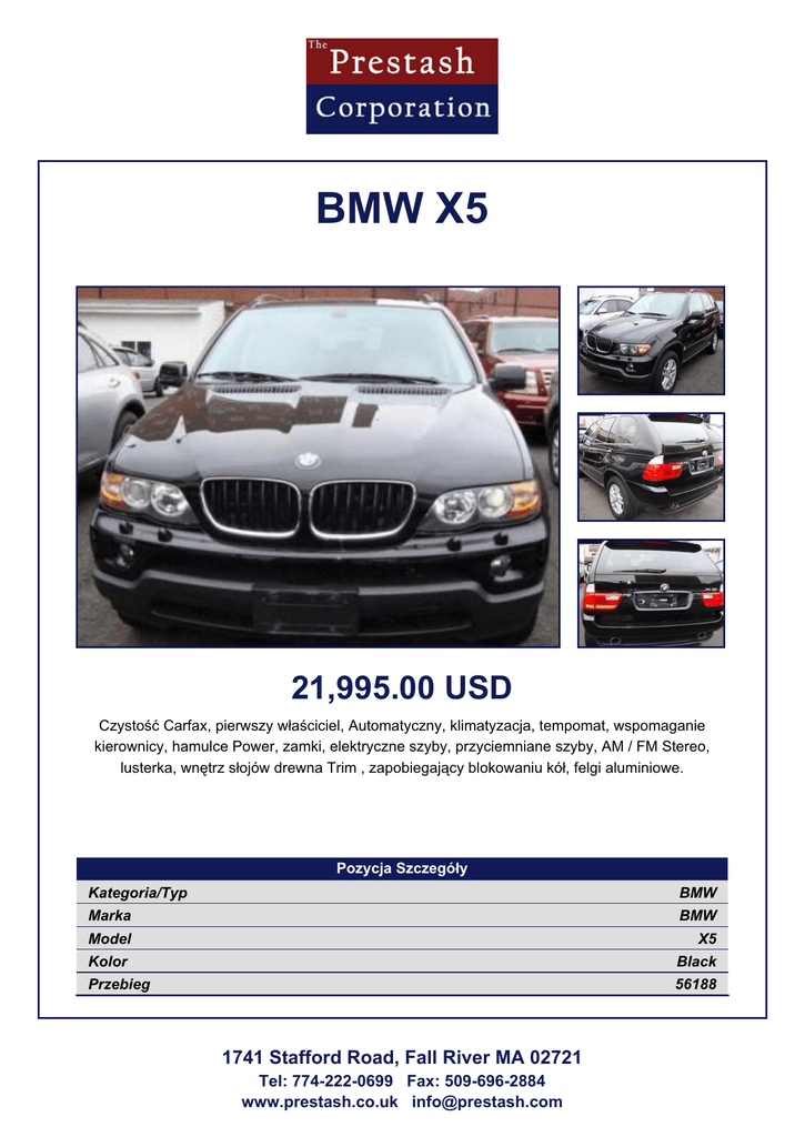 BMW X5 21,995.00 USD Czystość Carfax, pierwszy właściciel, Automatyczny, klimatyzacja, tempomat, wspomaganie kierownicy, hamulce Power, zamki, elektryczne szyby, przyciemniane szyby, AM / FM Stereo, lusterka, wnętrz słojów drewna Trim , zapobiegający blokowaniu kół, felgi aluminiowe. Pozycja Szczegóły Kategoria/Typ BMW Marka BMW Model X5 Kolor Black Przebieg 56188 1741 Stafford Road, Fall River MA 02721 Tel: 774-222-0699 Fax: 509-696-2884 www.prestash.co.uk [email protected]