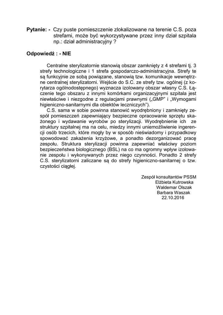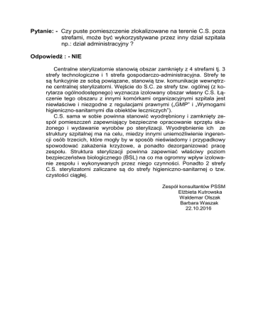 Pytanie: - Czy puste pomieszczenie zlokalizowane na terenie C.S. poza strefami, może być wykorzystywane przez inny dział szpitala np.: dział administracyjny ? Odpowiedź : - NIE Centralne sterylizatornie stanowią obszar zamknięty z 4 strefami tj. 3 strefy technologiczne i 1 strefa gospodarczo-administracyjna. Strefy te są funkcyjnie ze sobą powiązane, stanowią tzw. komunikacje wewnętrzne centralnej sterylizatorni. Wejście do S.C. ze strefy tzw. ogólnej (z korytarza ogólnodostępnego) wyznacza izolowany obszar własny C.S. Łączenie tego obszaru z innymi komórkami organizacyjnymi szpitala jest niewłaściwe i niezgodne z regulacjami prawnymi („GMP” i „Wymogami higieniczno-sanitarnymi dla obiektów leczniczych”). C.S. sama w sobie powinna stanowić wyodrębniony i zamknięty zespół pomieszczeń zapewniający bezpieczne opracowanie sprzętu skażonego i wydawanie wyrobów po sterylizacji. Wyodrębnienie ich ze struktury szpitalnej ma na celu, miedzy innymi uniemożliwienie ingerencji osób trzecich, które mogły by w sposób nieświadomy i przypadkowy spowodować zakażenia krzyżowe, a ponadto dezorganizować pracę zespołu. Struktura sterylizacji powinna zapewniać właściwy poziom bezpieczeństwa biologicznego (BSL) na co ma ogromny wpływ izolowanie zespołu i wykonywanych przez niego czynności. Ponadto 2 strefy C.S. sterylizatorni zaliczane są do strefy higieniczno-sanitarnej o tzw. czystości ciągłej. Zespół konsultantów PSSM Elżbieta Kutrowska Waldemar Olszak Barbara Waszak 22.10.2016