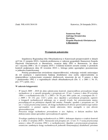 Znak: WK-6101/30/4/10 Katowice, 26 listopada 2010 r. Szanowna Pani Jadwiga Stroniewska Dyrektor Zespołu Placówek Oświatowych w Boronowie Wystąpienie pokontrolne Inspektorzy Regionalnej Izby Obrachunkowej w Katowicach przeprowadzili w dniach od 9 do 13 sierpnia 2010 r. kontrolę problemową w zakresie gospodarki finansowej Zespołu Placówek Oświatowych w Boronowie, zwanym dalej ZPO w Boronowie, za okres od 1 stycznia 2006 r. do 13 sierpnia 2010 r. Ustalenia kontroli zawarte zostały w protokole kontroli podpisanym dnia 28 września 2010 r., którego jeden egzemplarz pozostawiono w jednostce kontrolowanej. PoniŜej przedstawiam stwierdzone nieprawidłowości, wskazując wnioski zmierzające do ich usunięcia i usprawnienia badanej działalności oraz osoby odpowiedzialne za nieprawidłowe wykonywanie czynności słuŜbowych, stosownie do art. 9 ustawy z dnia 7 października 1992 r. o regionalnych izbach obrachunkowych (Dz. U. z 2001 r. Nr 55, poz. 577 z późn. zm.). W zakresie księgowości: - W latach 2009 – 2010 do dnia zakończenia kontroli, nieprawidłowo prowadzono księgi rachunkowe, tj. w sposób niezgodny z przepisem art. 23 ust. 1 ustawy z dnia 29 września 1994 r. o rachunkowości (Dz. U. z 2002 r. Nr 76, poz. 694 z późn. zm., a następnie Dz. U. z 2009 r. Nr 152, poz. 1223 z późn. zm.). Zgodnie z powołanym przepisem, zapisów w księgach rachunkowych dokonuje się w sposób trwały, bez pozostawiania miejsc pozwalających na późniejsze dopiski lub zmiany. Ponadto, zgodnie z przepisem art. 20 ust. 1 wyŜej przytoczonej ustawy, do ksiąg rachunkowych okresu sprawozdawczego naleŜy wprowadzić, w postaci zapisu, kaŜde zdarzenie, które nastąpiło w tym okresie sprawozdawczym. PowyŜsze księgi rachunkowe prowadzono w tzw. buforze, w którym moŜliwe było dokonywanie zmian uprzednio wprowadzonych zapisów. Trwałego zamknięcia ksiąg rachunkowych za 2009 r. dokonano dopiero w trakcie kontroli tj. w dniu 12 sierpnia 2010 r. Naruszono tym przepisy art. 12 ust. 4 i 5 wyŜej przytoczonej ustawy z dnia 29 września 1994 r. o rachunkowości. Zgodnie z przytoczonym przepisem, ostateczne zamknięcie ksiąg rachunkowych jednostki kontynuującej działalność powinno 1 nastąpić najpóźniej w ciągu 15 dni od dnia zatwierdzenia sprawozdania finansowego za rok obrotowy, a zamknięcie ksiąg rachunkowych polega na nieodwracalnym wyłączeniu moŜliwości dokonywania zapisów księgowych w zbiorach tworzących zamknięte księgi rachunkowe. - W latach 2009 - 2010 do dnia zakończenia kontroli zaniechano wydrukowania całości ksiąg rachunkowych na koniec 2009 r. lub przeniesienia na informatyczny nośnik danych. Stosownie do przepisu art. 13 ust. 1 ustawy z dnia 29 września 1994 r. o rachunkowości (Dz. U. z 2009 r. Nr 152, poz. 1223 z późn. zm.) księgi rachunkowe obejmują zbiory zapisów księgowych, obrotów (sum zapisów) i sald, które tworzą: dziennik, księgę główną, księgi pomocnicze, zestawienia: obrotów i sald kont księgi głównej oraz sald kont ksiąg pomocniczych. Zgodnie z przepisem art. 13 ust. 6 wyŜej przytoczonej ustawy o rachunkowości, księgi rachunkowe naleŜy wydrukować nie później niŜ na koniec roku obrotowego. Za równowaŜne z wydrukiem uznaje się przeniesienie treści ksiąg rachunkowych na informatyczny nośnik danych, zapewniający trwałość zapisu informacji, przez czas nie krótszy od wymaganego dla przechowywania ksiąg rachunkowych. Do kontroli przedłoŜono elektroniczne nośniki danych (płyty CD) zawierające zarchiwizowane bazy danych z programu księgowego, jednak ich odczytanie nie było moŜliwe bez posiadania programu księgowego Optivum. Księgi rachunkowe za lata 2009 i 2010 zostały wydrukowane w trakcie kontroli, tj. 12 sierpnia 2010 r. - W 2007 r. w ewidencji analitycznej do konta 011 „Środki trwałe” (księdze inwentarzowej) nieprawidłowo ujęto wartość nieodpłatnie nabytych dwóch pracowni komputerowych, tj. wg cen rynkowych o łącznej wartości 126.380,00 zł. W księdze głównej ujęto ww. pracownie komputerowe o łącznej wartości 99.811,68 zł na podstawie dowodu OT z dnia 31 lipca 2007 r. PowyŜszym działaniem naruszono postanowienia Zarządzenia Nr 15/2006 Dyrektora ZPO w Boronowie z dnia 1 sierpnia 2006 r. w sprawie ustalenia dokumentacji opisującej przyjęte do stosowania zasady – polityki rachunkowości, rozporządzenia Ministra Finansów z dnia 28 lipca 2006 r. w sprawie szczególnych zasad rachunkowości oraz planów kont dla budŜetu państwa, budŜetów jednostek samorządu terytorialnego oraz niektórych jednostek sektora finansów publicznych (Dz. U. Nr 142, poz. 1020 z późn. zm.). Z kolei zgodnie z przepisem art. 16 ust. 1 ustawy z dnia 29 września 1994 r. o rachunkowości (Dz. U. z 2002 r. Nr 76, poz. 694 z późn. zm.), konta ksiąg pomocniczych zawierają zapisy będące uszczegółowieniem i uzupełnieniem zapisów kont księgi głównej. Prowadzi się je w ujęciu systematycznym jako wyodrębniony system ksiąg, kartotek (zbiorów kont), komputerowych zbiorów danych, uzgodniony z saldami i zapisami na kontach księgi głównej. PowyŜsze świadczy o uchybieniach w przeprowadzonej wg stanu na dzień 31 grudnia 2008 r. inwentaryzacji środków trwałych w drodze spisu z natury. Przyczyny niezgodności ww. zapisów w księgach rachunkowych zostały wyjaśnione, lecz nie doprowadzono do zgodności ewidencji syntetycznej z ewidencją analityczną. Zgodnie z przepisem art. 27 wyŜej wymienionej ustawy o rachunkowości, przeprowadzenie i wyniki inwentaryzacji naleŜy odpowiednio udokumentować i powiązać z zapisami ksiąg rachunkowych. Ujawnione w toku inwentaryzacji róŜnice między stanem rzeczywistym, a stanem wykazanym w księgach rachunkowych naleŜy wyjaśnić i rozliczyć w księgach rachunkowych tego roku obrotowego, na który przypadał termin inwentaryzacji. 2 Za prowadzenie rachunkowości ZPO w Boronowie, w tym prawidłowe prowadzenie ewidencji do konta 011 