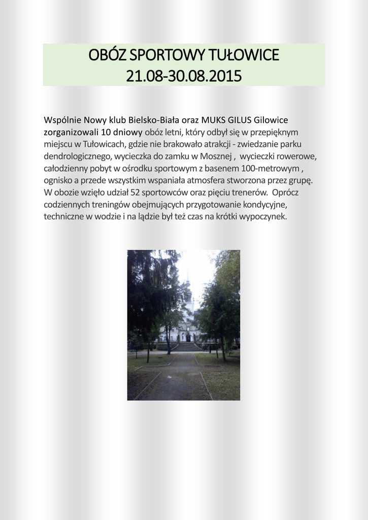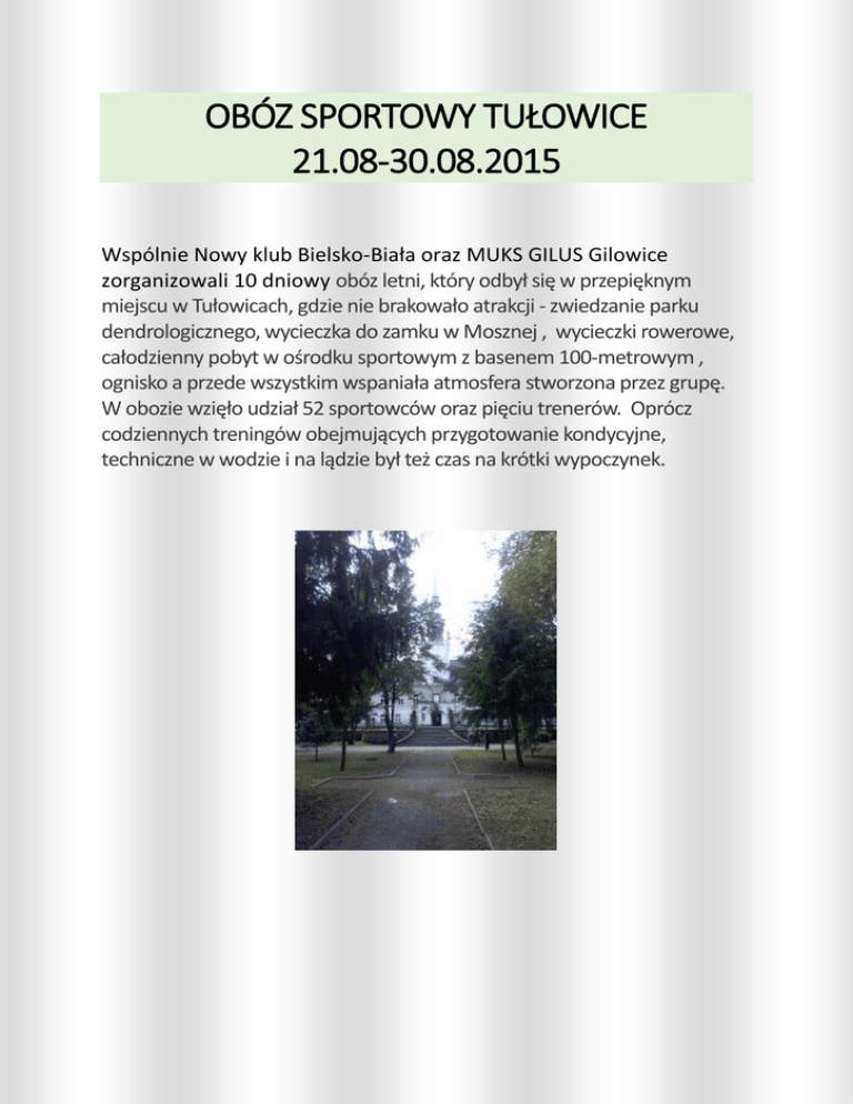 OBÓZ SPORTOWY TUŁOWICE 21.08-30.08.2015 Wspólnie Nowy klub Bielsko-Biała oraz MUKS GILUS Gilowice zorganizowali 10 dniowy obóz letni, który odbył się w przepięknym miejscu w Tułowicach, gdzie nie brakowało atrakcji - zwiedzanie parku dendrologicznego, wycieczka do zamku w Mosznej , wycieczki rowerowe, całodzienny pobyt w ośrodku sportowym z basenem 100-metrowym , ognisko a przede wszystkim wspaniała atmosfera stworzona przez grupę. W obozie wzięło udział 52 sportowców oraz pięciu trenerów. Oprócz codziennych treningów obejmujących przygotowanie kondycyjne, techniczne w wodzie i na lądzie był też czas na krótki wypoczynek.