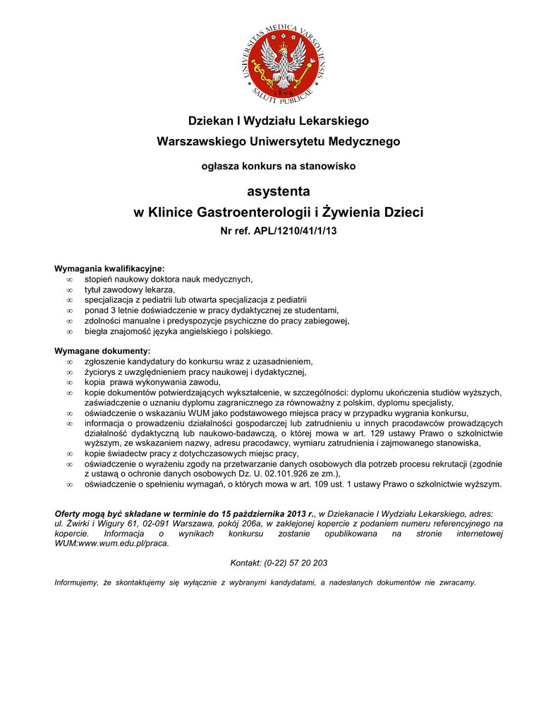Dziekan I Wydziału Lekarskiego Warszawskiego Uniwersytetu Medycznego ogłasza konkurs na stanowisko asystenta w Klinice Gastroenterologii i śywienia Dzieci Nr ref. APL/1210/41/1/13 Wymagania kwalifikacyjne: • stopień naukowy doktora nauk medycznych, • tytuł zawodowy lekarza, • specjalizacja z pediatrii lub otwarta specjalizacja z pediatrii • ponad 3 letnie doświadczenie w pracy dydaktycznej ze studentami, • zdolności manualne i predyspozycje psychiczne do pracy zabiegowej, • biegła znajomość języka angielskiego i polskiego. Wymagane dokumenty: • zgłoszenie kandydatury do konkursu wraz z uzasadnieniem, • Ŝyciorys z uwzględnieniem pracy naukowej i dydaktycznej, • kopia prawa wykonywania zawodu, • kopie dokumentów potwierdzających wykształcenie, w szczególności: dyplomu ukończenia studiów wyŜszych, zaświadczenie o uznaniu dyplomu zagranicznego za równowaŜny z polskim, dyplomu specjalisty, • oświadczenie o wskazaniu WUM jako podstawowego miejsca pracy w przypadku wygrania konkursu, • informacja o prowadzeniu działalności gospodarczej lub zatrudnieniu u innych pracodawców prowadzących działalność dydaktyczną lub naukowo-badawczą, o której mowa w art. 129 ustawy Prawo o szkolnictwie wyŜszym, ze wskazaniem nazwy, adresu pracodawcy, wymiaru zatrudnienia i zajmowanego stanowiska, • kopie świadectw pracy z dotychczasowych miejsc pracy, • oświadczenie o wyraŜeniu zgody na przetwarzanie danych osobowych dla potrzeb procesu rekrutacji (zgodnie z ustawą o ochronie danych osobowych Dz. U. 02.101.926 ze zm.), • oświadczenie o spełnieniu wymagań, o których mowa w art. 109 ust. 1 ustawy Prawo o szkolnictwie wyŜszym. Oferty mogą być składane w terminie do 15 października 2013 r., w Dziekanacie I Wydziału Lekarskiego, adres: ul. świrki i Wigury 61, 02-091 Warszawa, pokój 206a, w zaklejonej kopercie z podaniem numeru referencyjnego na kopercie. Informacja o wynikach konkursu zostanie opublikowana na stronie internetowej WUM:www.wum.edu.pl/praca. Kontakt: (0-22) 57 20 203 Informujemy, Ŝe skontaktujemy się wyłącznie z wybranymi kandydatami, a nadesłanych dokumentów nie zwracamy.