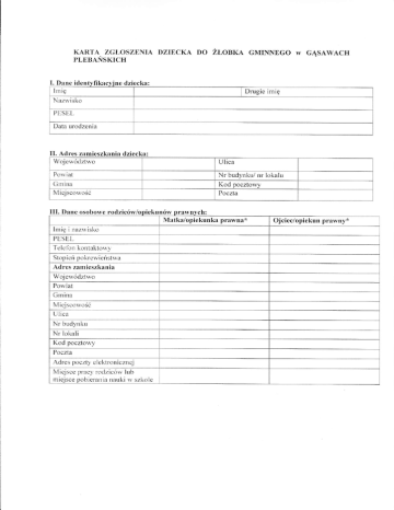 KARTA ZGŁOSZENIA DZIECKA PLEBAŃSKICH I. Dane iden Do ŻŁoBKA GMINNEGO w GĄSAWACH ne dziecka: Imię Drugie imię Nazrł'isko PI]SF,I, Data urodzen ia IL Adres zamieszkania dziecka: Wojewódawo Ulica Powiat Nr budynku/ nr lokalu Kod pocztowy Poczta C rn ina Miejscowośó Ojciec/opiekun pratvny* Imię i nazwisko Telefon kontaktowy Stop ieri pol<rewieristwa Adres zamieszkania Mie.1scowość Kod pocztowy Adres pocztr elektroniczne-i M iejsce pr'acy rodzjcórv lub nrieisce pobierania nauki w szkole IV. Kryteria przyjęcia Lp. 2. Kryterium Zakreślićwłaściwąodpowiedź Oboje lodzice placqją lub uczą się rv systenrie dziennym TAK,'}JIE Rodzic pracuje ijest osobą samotnie wyclrowującą dziecko w rozLlmieniu aft' 3 pkt l7a ustawy z dniaŻ8 listopada 2003 r. TAK/N]E o świadczeniach lodzinllycIl J. rv rozutllięniLt Dziecko z rodziny wie lodzietnej alt.3 pkt l6a ustarvy z clnia 28 listopada 2003 r. o świadczeniach rodzirlnyoh TAK,ĄIIE Dziecko' wobec którego orzeczotlo rriepełnosprawność TAK,N]F, Dziecko pochodzi z rodzily- u którcj rr'obec rodzeńsnva orzeczollo n iepełnosprarvność TAKNIE 1. 5. 6. 1. 8. 9. Dziecko pochodzi z rodziny. rv której rvobec natki lub ojca orzeczono znaczny Jub umiarkowany stopieri niepełnosprawności.bądz całkorl itą niezdolnośćtlo pracy oraz rliczdLl]llość clo sallloclziclnc_j c_rlzystcncii lla podstawic odrębnych plzcp isriu Dziecko unrieszczone w rodzinie Zastępczej Rodzic nie pracuje ijest osobą samotnie wychowującą dziecko rv rozumieniu aft. 3 pkt I 7a ustawy z dnia 28 listopada 2003 r. o świadczeniach rodzinnych Jeden rodzic pracLrje TAKNIE TAKnllE TAK/NIF, TAK,NIE 10. Dzieoko pochodzi z rodzin1'' rv któlci lodzelistlvo LlcZęsŻcza do Złobka lub przedszkola TAK'NIE w PRZYPADKU zAKREŚLENIA oDPowIEDZI ,,TAK. Do KARTY ZCŁoszENlowEJ NALEżY DoŁĄcZYĆ KsERoKoPtĘ DoKUMENTU PoTwlERDZAJĄcEGo sPEŁNIENlE KRYTERIUM. Y. Dodatkorve rvłżnc informacje psychofizl cznvnr): o dziecku (stanie zdrowia, stosorł,anej diecie, rozwoju VI. Zobowiązuje się clo: ]. Podania do rviadomości Złobka wsze]kich Zlrlian w Zawartych lvyże1 lnformacjach; RegLllarnegil tliszczania oplat Za pob\'t dziecka rv ZłobkLr w lvyznaczonym terminie; .3' Przr prorr,adzanIa iodbierania dziecka ze Złobka osobiście lub przez upoważnioną 2' przeze tlnie osobę dol'osłą. 4' Prz1,plorvadzan ia do złobka tylko zdrorvego dziecka; 5. Uczestniczenia w zebrarriach rodziców. VII. oświadczenie dotyczące danych osobowych: U. z Ż016 rokl, poz.922z póżn' zm.) wyrażam zgodę na przelwarzanie moich i uczęszczającego do żłobka dziecka oraz osób upoważnionych, danych osobowych Zawartych w w/w formularzu wyłącznie do Zgodnie z ustawą Z dnia 29 sierpnia 1997 roku o ochronie danyclr osobowych ( Dz. potrzeb wewnętrznych (cele statutowe) Zlobka Gminnego w Cąsawach Plebańskich. data i podpis mrtki/opiekunki pra!\ne.j* data i podpis ojca,/opiekuna prawnegox VIII. oświadczenie dotyczące treści zgłoszenia: oświadczam, że podane w w/w formularzu dane są zgodne Ze stanem faktycznym. data i podpis matki/opiekunki prawnej* data i podpis ojca,/opiekuna prawnego* VIII. Adnotacje dyrektora Złobka dotyczące postępowania kwalifikacyjnego dziecka do żłobka: mieiscowość i data *niepotrzebne skreślić podpis dyrektora żlobka i przyjęcia