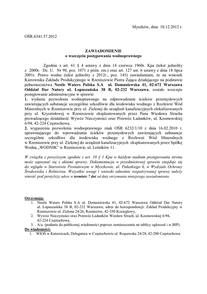 Myszków, dnia 10.12.2012 r. OŚR.6341.57.2012 ZAWIADOMIENIE o wszczęciu postępowania wodnoprawnego Zgodnie z art. 61 § 4 ustawy z dnia 14 czerwca 1960r. Kpa (tekst jednolity z 2000r. Dz. U. Nr 98, poz. 1071 z późn. zm.) oraz art. 127 ust. 6 ustawy z dnia 18 lipca 2001r. Prawo wodne (tekst jednolity z 2012r., poz. 145) zawiadamiam, że na wniosek Kierownika Zakładu Produkcyjnego w Rzeniszowie Piotra Zająca działającego na podstawie pełnomocnictwa Nestle Waters Polska S.A ul. Domaniewska 41, 02-672 Warszawa Oddział Dar Natury ul. Łopuszańska 38 B, 02-232 Warszawa, zostało wszczęte postępowanie administracyjne w sprawie: 1. wydania pozwolenia wodnoprawnego na odprowadzanie ścieków przemysłowych zawierających substancje szczególnie szkodliwie dla środowiska wodnego z Rozlewni Wód Mineralnych w Rzeniszowie przy ul. Zielonej do urządzeń kanalizacyjnych zlokalizowanych przy ul. Kryształowej w Rzeniszowie eksploatowanych przez Pana Wiesława Stracha prowadzącego działalność Wywóz Nieczystości oraz Przewóz Ładunków, ul. Kosmowskiej 6/94, 42-224 Częstochowa. 2. wygaszenia pozwolenia wodnoprawnego znak OŚR 6232/1/10 z dnia 16.02.2010 r. uprawniającego do wprowadzania ścieków przemysłowych zawierających substancje szczególnie szkodliwe dla środowiska wodnego z Rozlewni Wód Mineralnych w Rzeniszowie przy ul. Zielonej do urządzeń kanalizacyjnych eksploatowanych przez Spółkę Wodną „WODNIK” w Rzeniszowie, ul. Leśników 11. W związku z powyższym zgodnie z art. 10 § 1 Kpa w każdym stadium postępowania strona może zapoznać się z aktami sprawy. Dokumentacja w przedmiotowej sprawie znajduje się do wglądu w Starostwie Powiatowym w Myszkowie, ul. Pułaskiego 6, w Wydziale Ochrony Środowiska i Rolnictwa. Wszystkie uwagi i wnioski odnośnie rozpatrywanej sprawy należy wnosić pod powyższy adres w terminie 7 dni od daty otrzymania niniejszego zawiadomienia. Otrzymują: 1. Nestle Waters Polska S.A ul. Domaniewska 41, 02-672 Warszawa Oddział Dar Natury ul. Łopuszańska 38 B, 02-232 Warszawa; adres do korespondencji: Zakład Produkcyjny w Rzeniszowie ul. Zielona 24/26, Rzeniszów, 42-350 Koziegłowy, 2. Wywóz Nieczystości oraz Przewóz Ładunków Wiesław Strach, ul. Kosmowskiej 6/94, 42-224 Częstochowa, 3. A/a. (podanie do publicznej wiadomości poprzez zamieszczenie na tablicy ogłoszeń i w BIP). Do wiadomości: 1. WIOŚ w Katowicach, Delegatura w Częstochowie ul. Rząsawska 24/28, 42-200 Częstochowa.