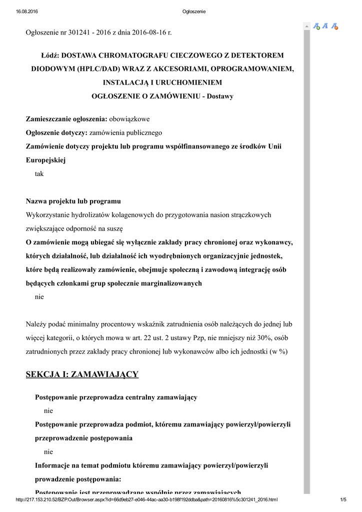 16.08.2016 Ogłoszenie Ogłoszenie nr 301241 2016 z dnia 20160816 r. Łódź: DOSTAWA CHROMATOGRAFU CIECZOWEGO Z DETEKTOREM DIODOWYM (HPLC/DAD) WRAZ Z AKCESORIAMI, OPROGRAMOWANIEM, INSTALACJĄ I URUCHOMIENIEM OGŁOSZENIE O ZAMÓWIENIU Dostawy Zamieszczanie ogłoszenia: obowiązkowe Ogłoszenie dotyczy: zamówienia publicznego Zamówienie dotyczy projektu lub programu współfinansowanego ze środków Unii Europejskiej tak Nazwa projektu lub programu Wykorzystanie hydrolizatów kolagenowych do przygotowania nasion strączkowych zwiększające odporność na suszę O zamówienie mogą ubiegać się wyłącznie zakłady pracy chronionej oraz wykonawcy, których działalność, lub działalność ich wyodrębnionych organizacyjnie jednostek, które będą realizowały zamówienie, obejmuje społeczną i zawodową integrację osób będących członkami grup społecznie marginalizowanych nie Należy podać minimalny procentowy wskaźnik zatrudnienia osób należących do jednej lub więcej kategorii, o których mowa w art. 22 ust. 2 ustawy Pzp, nie mniejszy niż 30%, osób zatrudnionych przez zakłady pracy chronionej lub wykonawców albo ich jednostki (w %) SEKCJA I: ZAMAWIAJĄCY Postępowanie przeprowadza centralny zamawiający nie Postępowanie przeprowadza podmiot, któremu zamawiający powierzył/powierzyli przeprowadzenie postępowania nie Informacje na temat podmiotu któremu zamawiający powierzył/powierzyli prowadzenie postępowania: Postępowanie jest przeprowadzane wspólnie przez zamawiających http://217.153.210.52/BZP.Out/Browser.aspx?id=66d9eb27e04644acaa30b198f192ddba&path=20160816%5c301241_2016.html 1/5 16.08.2016 Ogłoszenie Postępowanie jest przeprowadzane wspólnie przez zamawiających nie Jeżeli tak, należy wymienić zamawiających, którzy wspólnie przeprowadzają postępowanie oraz podać adresy ich siedzib, krajowe numery identyfikacyjne oraz osoby do kontaktów wraz z danymi do kontaktów: Postępowanie jest przeprowadzane wspólnie z zamawiającymi z innych państw członkowskich Unii Europejskiej nie W przypadku przeprowadzania postępowania wspólnie z zamawiającymi z innych państw członkowskich Unii Europejskiej – mające zastosowanie krajowe prawo zamówień publicznych: Informacje dodatkowe: I. 1) NAZWA I ADRES: Instytut Przemysłu Skórzanego, krajowy numer identyfikacyjny 4879700000, ul. ul. Zgierska 73, 91462 Łódź, woj. łódzkie, państwo , tel. 422 536 108, email , faks 42 657 62 75. Adres strony internetowej (URL): www.ips.lodz.pl I. 2) RODZAJ ZAMAWIAJĄCEGO: Inny: Instytut badawczy I.3) WSPÓLNE UDZIELANIE ZAMÓWIENIA (jeżeli dotyczy): Podział obowiązków między zamawiającymi w przypadku wspólnego przeprowadzania postępowania, w tym w przypadku wspólnego przeprowadzania postępowania z zamawiającymi z innych państw członkowskich Unii Europejskiej (który z zamawiających jest odpowiedzialny za przeprowadzenie postępowania, czy i w jakim zakresie za przeprowadzenie postępowania odpowiadają pozostali zamawiający, czy zamówienie będzie udzielane przez każdego z zamawiających indywidualnie, czy zamówienie zostanie udzielone w imieniu i na rzecz pozostałych zamawiających): I.4) KOMUNIKACJA: Nieograniczony, pełny i bezpośredni dostęp do dokumentów z postępowania można uzyskać pod adresem (URL) tak www.ips.lodz.pl Adres strony internetowej, na której zamieszczona będzie specyfikacja istotnych http://217.153.210.52/BZP.Out/Browser.aspx?id=66d9eb27e04644acaa30b198f192ddba&path=20160816%5c301241_2016.html 2/5 16.08.2016 Ogłoszenie Adres strony internetowej, na której zamieszczona będzie specyfikacja istotnych warunków zamówienia nie www.ips.lodz.pl Dostęp do dokumentów z postępowania jest ograniczony więcej informacji można uzyskać pod adresem nie Oferty lub wnioski o dopuszczenie do udziału w postępowaniu należy przesyłać: Elektronicznie nie adres Dopuszczone jest przesłanie ofert lub wniosków o dopuszczenie do udziału w postępowaniu w inny sposób: nie Wymagane jest przesłanie ofert lub wniosków o dopuszczenie do udziału w postępowaniu w inny sposób: tak Inny sposób: pisemnie Pod adres: 91462 Łódź, ul. Zgierska 73 Komunikacja elektroniczna wymaga korzystania z narzędzi i urządzeń lub formatów plików, które nie są ogólnie dostępne nie Nieograniczony, pełny, bezpośredni i bezpłatny dostęp do tych narzędzi można uzyskać pod adresem: (URL) SEKCJA II: PRZEDMIOT ZAMÓWIENIA II.1) Nazwa nadana zamówieniu przez zamawiającego: DOSTAWA CHROMATOGRAFU CIECZOWEGO Z DETEKTOREM DIODOWYM (HPLC/DAD) http://217.153.210.52/BZP.Out/Browser.aspx?id=66d9eb27e04644acaa30b198f192ddba&path=20160816%5c301241_2016.html 3/5 16.08.2016 Ogłoszenie WRAZ Z AKCESORIAMI, OPROGRAMOWANIEM, INSTALACJĄ I URUCHOMIENIEM Numer referencyjny: IPS/1/2016 Przed wszczęciem postępowania o udzielenie zamówienia przeprowadzono dialog techniczny nie II.2) Rodzaj zamówienia: dostawy II.3) Informacja o możliwości składania ofert częściowych Zamówienie podzielone jest na części: Nie II.4) Krótki opis przedmiotu zamówienia (wielkość, zakres, rodzaj i ilość dostaw, usług lub robót budowlanych lub określenie zapotrzebowania i wymagań ) a w przypadku partnerstwa innowacyjnego określenie zapotrzebowania na innowacyjny produkt, usługę lub roboty budowlane: Przedmiotem zamówienia jest dostawa kompletnego, fabrycznie nowego chromatografu cieczowego z detektorem diodowym (HPLC/DAD), jego wniesienie, instalacja i uruchomienie oraz szkolenie osób wskazanych przez Zamawiającego w ramach projektu „Wykorzystanie hydrolizatów kolagenowych do przygotowania nasion strączkowych zwiększające odporność na suszę”, o akronimie COLL_LEG_SEED. II.5) Główny kod CPV: 384322004 II.6) Całkowita wartość zamówienia (jeżeli zamawiający podaje informacje o wartości zamówienia): Wartość bez VAT: 127192.00 Waluta: pln (w przypadku umów ramowych lub dynamicznego systemu zakupów – szacunkowa całkowita ma