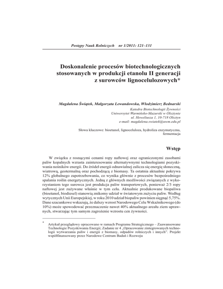 Postêpy Nauk Rolniczych nr 1/2011: 121–131 Doskonalenie procesów biotechnologicznych stosowanych w produkcji etanolu II generacji z surowców lignocelulozowych* Magdalena Œwi¹tek, Ma³gorzata Lewandowska, W³odzimierz Bednarski Katedra Biotechnologii ¯ywnoœci Uniwersytet Warmiñsko-Mazurski w Olsztynie ul. Heweliusza 1, 10-718 Olsztyn e-mail: [email protected] S³owa kluczowe: bioetanol, lignoceluloza, hydroliza enzymatyczna, fermentacja Wstêp W zwi¹zku z rosn¹cymi cenami ropy naftowej oraz ograniczonymi zasobami paliw kopalnych wzrasta zainteresowanie alternatywnymi technologiami pozyskiwania noœników energii. Do Ÿróde³ energii odnawialnej zalicza siê energiê s³oneczn¹, wiatrow¹, geotermaln¹ oraz pochodz¹c¹ z biomasy. Ta ostatnia aktualnie pokrywa 12% globalnego zapotrzebowania, co wynika g³ównie z procesów bezpoœredniego spalania roœlin energetycznych. Jedn¹ z g³ównych mo¿liwoœci zwi¹zanych z wykorzystaniem tego surowca jest produkcja paliw transportowych, poniewa¿ 2/3 ropy naftowej jest zu¿ywane w³aœnie w tym celu. Aktualnie produkowane biopaliwa (bioetanol, biodiesel) stanowi¹ znikomy udzia³ w œwiatowym zu¿yciu paliw. Wed³ug wytycznych Unii Europejskiej, w roku 2010 udzia³ biopaliw powinien siêgn¹æ 5,75%. Dane szacunkowe wskazuj¹, ¿e dalszy wzrost Narodowego Celu WskaŸnikowego (do 10%) mo¿e spowodowaæ przeznaczenie nawet 40% aktualnego area³u ziem uprawnych, stwarzaj¹c tym samym zagro¿enie wzrostu cen ¿ywnoœci. * Artyku³ przegl¹dowy opracowano w ramach Programu Strategicznego – Zaawansowane Technologie Pozyskiwania Energii; Zadanie nr 4 „Opracowanie zintegrowanych technologii wytwarzania paliw i energii z biomasy, odpadów rolniczych i innych”. Projekt wspó³finansowany przez Narodowe Centrum Badañ i Rozwoju 122 M. Œwi¹tek, M. Lewandowska, W. Bednarski Zastosowanie odpadów rolniczych, drzewnych, komunalnych odpadów sta³ych czy dedykowanych roœlin energetycznych do wytwarzania bioetanolu, pozwoli³oby zminimalizowaæ tê zale¿noœæ. Ponadto ³atwa dostêpnoœæ i obfitoœæ wystêpowania biomasy lignocelulozowej sprawiaj¹, ¿e stanowi ona atrakcyjne Ÿród³o energii z powodu niskich kosztów pozyskiwania. Uzyskanie wysokiej wydajnoœci hydrolizy i fermentacji surowców lignocelulozowych wymaga doboru efektywnej metody ich obróbki wstêpnej. Wa¿nym zagadnieniem w biokonwersji surowców lignocelulozowych jest dobór kompleksu enzymów i mikroorganizmów fermentacji etanolowej. Wiadomo, ¿e surowce lignocelulozowe, zw³aszcza pochodzenia rolniczego, oprócz celulozy i ligniny zawieraj¹ znaczne iloœci trudno biodegradowalnych hemiceluloz. Zastosowanie do hydrolizy substratu obok celulaz równie¿ enzymów hemicelulolitycznych sprzyja uwalnianiu cukrów prostych i poprawie ekonomiki procesu fermentacji. Z kolei mikroorganizmy stosowane w tym celu powinny byæ zdolne do wydajnej fermentacji alkoholowej zarówno heksoz (glukoza, galaktoza, fruktoza, mannoza), jak i pentoz (ksyloza, arabinoza) powsta³ych z rozk³adu obu grup polisacharydów. Doskonalenie hydrolizy enzymatycznej Zastosowanie hydrolizy enzymatycznej surowców lignocelulozowych jest procesem gwarantuj¹cym konwersjê celulozy i hemiceluloz do cukrów prostych – heksoz i pentoz, które mog¹ byæ przekszta³cane do etanolu przez ró¿ne mikroorganizmy. Enzymy hydrolizuj¹ce celulozê mo¿na podzieliæ na trzy g³ówne grupy: endocelulazy (EC 3.2.1.4) katalizuj¹ce rozpad przypadkowych wi¹zañ glikozydowych ³añcucha celulozowego i egzocelulazy (celobiohydrolazy) (EC 3.2.1.91) odpowiedzialne za oddzielenie cz¹steczek celobiozy od redukuj¹cego (celobiohydrolaza I) lub nieredukuj¹cego (celobiohydrolaza II) koñca ³añcucha celulozy oraz b-glukozydazê (EC 3.2.1.21) rozk³adaj¹c¹ celobiozê do dwóch cz¹steczek glukozy. Brak aktywnej b-glukozydazy w œrodowisku hydrolizy powoduje hamowanie aktywnoœci celulaz wywo³ane obecnoœci¹ celobiozy. Optymalne warunki dla dzia³ania wiêkszoœci stosowanych celulaz to temperatura ok. 50°C i kwasowoœæ œrodowiska w przedziale pH 4,0–5,0 [3]. Hemicelulozy, w zale¿noœci od podjednostek z których s¹ zbudowane, mog¹ byæ rozk³adane przez ró¿ne enzymy: ksylan obecny w znacznych iloœciach w drewnie twardym i roœlinach jednorocznych (do 35%) ulega hydrolizie pod wp³ywem enzymów takich jak endoksylanaza i b-ksylozydaza, które powoduj¹ jego degradacjê do ksylooligosacharydów, natomiast a-glukuronidaza, a-arabinofuranozydaza i esteraza acetyloksylanu odszczepiaj¹ boczne grupy i ³añcuchy heteroksylanu, a za hydrolizê glukomannanu odpowiadaj¹ b-mannanaza i b-mannozydaza [10, 20]. Du¿a wydajnoœæ uwalnianych cukrów podlegaj¹cych fermentacji jest kluczowym aspektem przemys³owej produkcji etanolu, jednak¿e wymagane wysokie dawki enzymów zapewniaj¹ce uzyskanie korzystnych rezultatów znacznie podnosz¹ koszt produkcji. Ponadto, aktualnie produkowane handlowe preparaty celulaz przeznaczo- Doskonalenie procesów biotechnologicznych … 123 ne s¹ g³ównie dla przemys³u papierniczego i spo¿ywczego, w zwi¹zku z czym nie s¹ dostosowane do wydajnej hydrolizy surowców lignocelulozowych, zw³aszcza z powodu ró¿nego sk³adu wynikaj¹cego z procedury ich przygotowania [11]. W wyniku kwasowej obróbki wstêpnej znaczna czêœæ hemiceluloz ulega hydrolizie i przechodzi do frakcji p³ynnej, natomiast frakcja sta³a zawiera g³ównie celulozê i ligninê, st¹d te¿ optymalny sk³ad kompozycji enzymów bêdzie siê ró¿ni³ od tego, przeznaczonego do hydrolizy substratu lignocelulozowego po alkalicznej obróbce wstêpnej, w wyniku której zostaje on pozbawiony g³ównie ligniny [3]. Zastosowanie (obok celulaz) enzymów rozk³adaj¹cych hemicelulozy pozwala na uzyskanie wiêkszej wydajnoœci uwalniania cukrów podlegaj¹cych fermentacji, jak te¿ na zwiêkszenie stopnia hydrolizy celulozy (na skutek eliminacji ochronnej roli hemiceluloz) [1, 17]. Udowodnili to Kumar i Wyman [11], którzy