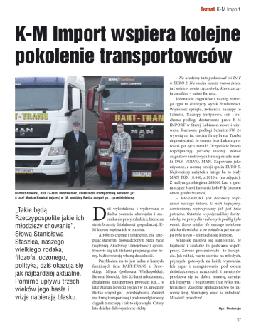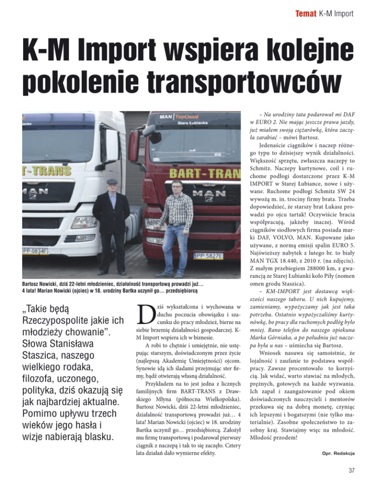 Temat K-M Import K-M Import wspiera kolejne pokolenie transportowców Bartosz Nowicki, dziś 22-letni młodzieniec, działalność transportową prowadzi już… 4 lata! Marian Nowicki (ojciec) w 18. urodziny Bartka uczynił go… przedsiębiorcą „Takie będą Rzeczypospolite jakie ich młodzieży chowanie”. Słowa Stanisława Staszica, naszego wielkiego rodaka, filozofa, uczonego, polityka, dziś okazują się jak najbardziej aktualne. Pomimo upływu trzech wieków jego hasła i wizje nabierają blasku. D ziś wykształcona i wychowana w duchu poczucia obowiązku i szacunku do pracy młodzież, bierze na siebie brzemię działalności gospodarczej. KM Import wspiera ich w biznesie. A robi to chętnie i umiejętnie, nie ustępując starszym, doświadczonym przez życie (najlepszą Akademię Umiejętności) ojcom. Synowie idą ich śladami przejmując ster firmy, bądź otwierają własną działalność. Przykładem na to jest jedna z licznych familijnych firm BART-TRANS z Drawskiego Młyna (północna Wielkopolska). Bartosz Nowicki, dziś 22-letni młodzieniec, działalność transportową prowadzi już… 4 lata! Marian Nowicki (ojciec) w 18. urodziny Bartka uczynił go… przedsiębiorcą. Założył mu firmę transportową i podarował pierwszy ciągnik z naczepą i tak to się zaczęło. Cztery lata działań dało wymierne efekty. – Na urodziny tata podarował mi DAF w EURO 2. Nie mając jeszcze prawa jazdy, już miałem swoją ciężarówkę, która zaczęła zarabiać – mówi Bartosz. Jedenaście ciągników i naczep różnego typu to dzisiejszy wynik działalności. Większość sprzętu, zwłaszcza naczepy to Schmitz. Naczepy kurtynowe, coil i ruchome podłogi dostarczone przez K-M IMPORT w Starej Łubiance, nowe i używane. Ruchome podłogi Schmitz SW 24 wywożą m. in. trociny firmy brata. Trzeba dopowiedzieć, że starszy brat Łukasz prowadzi po ojcu tartak! Oczywiście bracia współpracują, jakżeby inaczej. Wśród ciągników siodłowych firma posiada marki DAF, VOLVO, MAN. Kupowane jako używane, z normą emisji spalin EURO 5. Najświeższy nabytek z lutego br. to biały MAN TGX 18.440, z 2010 r. (na zdjęciu). Z małym przebiegiem 288000 km, z gwarancją ze Starej Łubianki koło Piły (nomen omen grodu Staszica). – KM-IMPORT jest dostawcą większości naszego taboru. U nich kupujemy, zamieniamy, wypożyczamy jak jest taka potrzeba. Ostatnio wypożyczaliśmy kurtynówkę, bo pracy dla ruchomych podłóg było mniej. Rano telefon do naszego opiekuna Marka Górniaka, a po południu już naczepa była u nas – uśmiecha się Bartosz. Wniosek nasuwa się samoistnie, że lojalność i zaufanie to podstawa współpracy. Zawsze procentowało to korzyścią. Jak widać, warto stawiać na młodych, prężnych, gotowych na każde wyzwania. Ich zapał i zaangażowanie pod okiem doświadczonych nauczycieli i mentorów przekuwa się na dobrą monetę, czyniąc ich lepszymi i bogatszymi (nie tylko materialnie). Zasobne społeczeństwo to zasobny kraj. Stawiajmy więc na młodość. Młodość przodem! Opr. Redakcja 37