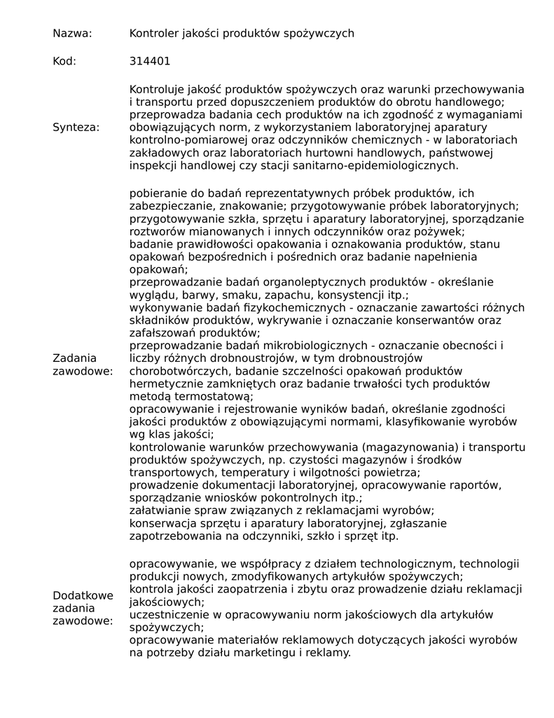 Nazwa: Kontroler jakości produktów spożywczych Kod: 314401