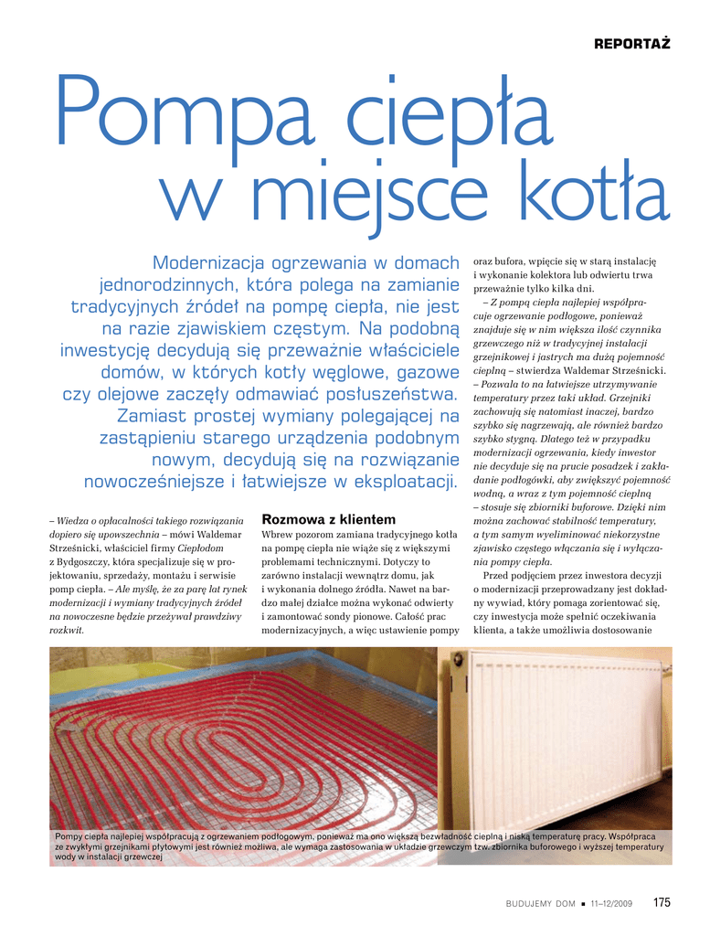 Pompa ciepła reportaż w miejsce kotła Modernizacja ogrzewania w domach jednorodzinnych, która polega na zamianie tradycyjnych źródeł na pompę ciepła, nie jest na razie zjawiskiem częstym. Na podobną inwestycję decydują się przeważnie właściciele domów, w których kotły węglowe, gazowe czy olejowe zaczęły odmawiać posłuszeństwa. Zamiast prostej wymiany polegającej na zastąpieniu starego urządzenia podobnym nowym, decydują się na rozwiązanie nowocześniejsze i łatwiejsze w eksploatacji. – Wiedza o opłacalności takiego rozwiązania dopiero się upowszechnia – mówi Waldemar Strześnicki, właściciel firmy Ciepłodom z Bydgoszczy, która specjalizuje się w projektowaniu, sprzedaży, montażu i serwisie pomp ciepła. – Ale myślę, że za parę lat rynek modernizacji i wymiany tradycyjnych źródeł na nowoczesne będzie przeżywał prawdziwy rozkwit. Rozmowa z klientem Wbrew pozorom zamiana tradycyjnego kotła na pompę ciepła nie wiąże się z większymi problemami technicznymi. Dotyczy to zarówno instalacji wewnątrz domu, jak i wykonania dolnego źródła. Nawet na bardzo małej działce można wykonać odwierty i zamontować sondy pionowe. Całość prac modernizacyjnych, a więc ustawienie pompy oraz bufora, wpięcie się w starą instalację i wykonanie kolektora lub odwiertu trwa przeważnie tylko kilka dni. – Z pompą ciepła najlepiej współpracuje ogrzewanie podłogowe, ponieważ znajduje się w nim większa ilość czynnika grzewczego niż w tradycyjnej instalacji grzejnikowej i jastrych ma dużą pojemność cieplną – stwierdza Waldemar Strześnicki. – Pozwala to na łatwiejsze utrzymywanie temperatury przez taki układ. Grzejniki zachowują się natomiast inaczej, bardzo szybko się nagrzewają, ale również bardzo szybko stygną. Dlatego też w przypadku modernizacji ogrzewania, kiedy inwestor nie decyduje się na prucie posadzek i zakładanie podłogówki, aby zwiększyć pojemność wodną, a wraz z tym pojemność cieplną – stosuje się zbiorniki buforowe. Dzięki nim można zachować stabilność temperatury, a tym samym wyeliminować niekorzystne zjawisko częstego włączania się i wyłączania pompy ciepła. Przed podjęciem przez inwestora decyzji o modernizacji przeprowadzany jest dokładny wywiad, który pomaga zorientować się, czy inwestycja może spełnić oczekiwania klienta, a także umożliwia dostosowanie Pompy ciepła najlepiej współpracują z ogrzewaniem podłogowym, ponieważ ma ono większą bezwładność cieplną i niską temperaturę pracy. Współpraca ze zwykłymi grzejnikami płytowymi jest również możliwa, ale wymaga zastosowania w układzie grzewczym tzw. zbiornika buforowego i wyższej temperatury wody w instalacji grzewczej budujemy dom 11–12/2009 175 Reportaż parametrów instalacji do indywidualnych oczekiwań. – Jeżeli grzejniki w domu są bardzo małe, przystosowane do temperatur 60–70°C, a klient obstaje przy ich zachowaniu, to działanie pompy może nie spełnić jego wymagań – podkreśla właściciel firmy Ciepłodom. – I wcale nie chodzi o to, że pompa ciepła nie podoła takiemu zadaniu. Przeciwnie, osiągnięcie takich parametrów jest możliwe, ale działanie urządzenia staje się wówczas mało opłacalne ze względów ekonomicznych. COP, wskaźnik efektywności pompy ciepła, czyli stosunek mocy grzewczej urządzenia do poboru mocy elektrycznej, staje się bowiem mało korzystny. Staramy się uświadomić to naszym klientom i przekonać ich, że należy dążyć do sytuacji, aby temperatura czynnika grzewczego nie przekraczała 40°C. Oczywiście w przypadku małych grzejników i przy niskiej temperaturze wody krążącej w instalacji, zachowanie komfortu cieplnego w domu jest niemożliwe. Grzejniki muszą zostać wówczas powiększone i stanowczo przy tym obstajemy. Doskonale zdajemy sobie sprawę, że w przeciwnym razie inwestor nie będzie zadowolony z pracy pompy ciepła. Wolę nawet zrezygnować ze zlecenia, niż doprowadzać do takiej sytuacji. Zdarza się jednak, że grzejniki są większe i teoretycznie istnieje możliwość ich współpracy z pompą. Wówczas pierwszy sezon grzewczy ma charakter testowy. Obserwując temperaturę w domu, bardzo szybko można się zorientować, które pomieszczenia w budynku mają grzejniki dobrze dobrane, a w których trzeba dokonać wymiany. argumentem decydującym nie powinna być niska cena. – Dlaczego? Zamiast odpowiedzi wprost, posłużę się przykładem – stwierdza właściciel Ciepłodomu. – Całkiem niedawno jedna z moich ekip wymieniała pompę ciepła na... pompę ciepła. Urządzenie zamontowane przez inną firmę od początku przysparzało inwestorowi kłopotów i bardzo szybko zaczął żałować, że zdecydował się na mało doświadczonego, ale taniego producenta. Wina leżała zresztą nie tylko po stronie wytwórcy urządzenia. Sposób zamontowania pozostawiał również sporo do życzenia. To z takich przypadków biorą się niepochlebne opinie o pompach ciepła, jakie można znaleźć na niektórych forach internetowych. Moim zdaniem, inwestor sporo ryzykuje, zlecając montaż mało doświadczonym instalatorom. Jeżeli firma sprzedaje kotły olejowe, gazowe, węglowe, a pompy ciepła są tylko nowoczes nym dodatkiem do owej działalności, to istnieje duże prawdopodobieństwo, że instalacja będzie działała wadliwie. Wiedza potrzebna do prawidłowego zwymiarowania urządzenia oraz zaplanowania współpracujących z nim elementów jest specyficzna. Trzeba na przykład sporo wiedzieć o chłodnictwie oraz działaniu układów elektronicznych. Lata działalności w tej branży nauczyły mnie, iż pompa ciepła to urządzenie, które nie znosi kompromisów. Tymczasem inwestor, usiłując zbić cenę, właśnie takich kompromisów oczekuje. Zasadą, jaką przyjąłem, jest proponowanie klientom gotowej, optymalnej instalacji. Jeżeli projekt zostanie zaakceptowany, to przystępujemy do prac