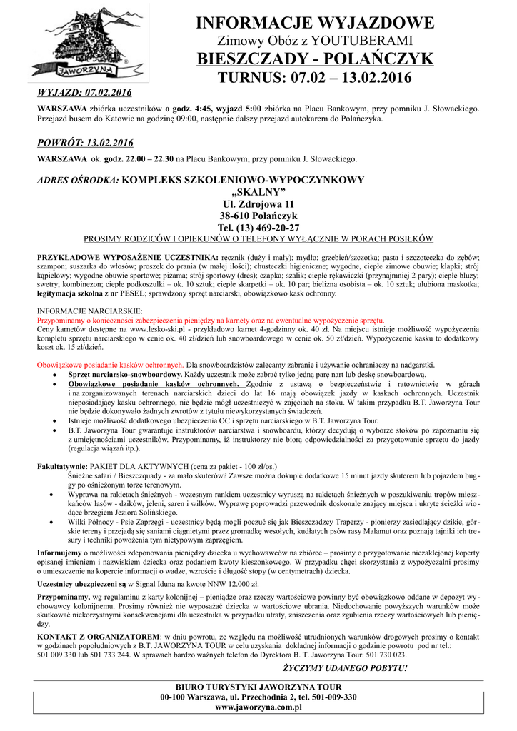 INFORMACJE WYJAZDOWE Zimowy Obóz z YOUTUBERAMI BIESZCZADY - POLAŃCZYK TURNUS: 07.02 – 13.02.2016 WYJAZD: 07.02.2016 WARSZAWA zbiórka uczestników o godz. 4:45, wyjazd 5:00 zbiórka na Placu Bankowym, przy pomniku J. Słowackiego. Przejazd busem do Katowic na godzinę 09:00, następnie dalszy przejazd autokarem do Polańczyka. POWRÓT: 13.02.2016 WARSZAWA ok. godz. 22.00 – 22.30 na Placu Bankowym, przy pomniku J. Słowackiego. ADRES OŚRODKA: KOMPLEKS SZKOLENIOWO-WYPOCZYNKOWY „SKALNY” Ul. Zdrojowa 11 38-610 Polańczyk Tel. (13) 469-20-27 PROSIMY RODZICÓW I OPIEKUNÓW O TELEFONY WYŁĄCZNIE W PORACH POSIŁKÓW PRZYKŁADOWE WYPOSAŻENIE UCZESTNIKA: ręcznik (duży i mały); mydło; grzebień/szczotka; pasta i szczoteczka do zębów; szampon; suszarka do włosów; proszek do prania (w małej ilości); chusteczki higieniczne; wygodne, ciepłe zimowe obuwie; klapki; strój kąpielowy; wygodne obuwie sportowe; piżama; strój sportowy (dres); czapka; szalik; ciepłe rękawiczki (przynajmniej 2 pary); ciepłe bluzy; swetry; kombinezon; ciepłe podkoszulki – ok. 10 sztuk; ciepłe skarpetki – ok. 10 par; bielizna osobista – ok. 10 sztuk; ulubiona maskotka; legitymacja szkolna z nr PESEL; sprawdzony sprzęt narciarski, obowiązkowo kask ochronny. INFORMACJE NARCIARSKIE: Przypominamy o konieczności zabezpieczenia pieniędzy na karnety oraz na ewentualne wypożyczenie sprzętu. Ceny karnetów dostępne na www.lesko-ski.pl - przykładowo karnet 4-godzinny ok. 40 zł. Na miejscu istnieje możliwość wypożyczenia kompletu sprzętu narciarskiego w cenie ok. 40 zł/dzień lub snowboardowego w cenie ok. 50 zł/dzień. Wypożyczenie kasku to dodatkowy koszt ok. 15 zł/dzień. Obowiązkowe posiadanie kasków ochronnych. Dla snowboardzistów zalecamy zabranie i używanie ochraniaczy na nadgarstki. Sprzęt narciarsko-snowboardowy. Każdy uczestnik może zabrać tylko jedną parę nart lub deskę snowboardową. Obowiązkowe posiadanie kasków ochronnych. Zgodnie z ustawą o bezpieczeństwie i ratownictwie w górach i na zorganizowanych terenach narciarskich dzieci do lat 16 mają obowiązek jazdy w kaskach ochronnych. Uczestnik nieposiadający kasku ochronnego, nie będzie mógł uczestniczyć w zajęciach na stoku. W takim przypadku B.T. Jaworzyna Tour nie będzie dokonywało żadnych zwrotów z tytułu niewykorzystanych świadczeń. Istnieje możliwość dodatkowego ubezpieczenia OC i sprzętu narciarskiego w B.T. Jaworzyna Tour. B.T. Jaworzyna Tour gwarantuje instruktorów narciarstwa i snowboardu, którzy decydują o wyborze stoków po zapoznaniu się z umiejętnościami uczestników. Przypominamy, iż instruktorzy nie biorą odpowiedzialności za przygotowanie sprzętu do jazdy (regulacja wiązań itp.). Fakultatywnie: PAKIET DLA AKTYWNYCH (cena za pakiet - 100 zł/os.) Śnieżne safari / Bieszczquady - za mało skuterów? Zawsze można dokupić dodatkowe 15 minut jazdy skuterem lub pojazdem buggy po ośnieżonym torze terenowym. Wyprawa na rakietach śnieżnych - wczesnym rankiem uczestnicy wyruszą na rakietach śnieżnych w poszukiwaniu tropów miesz kańców lasów - dzików, jeleni, saren i wilków. Wyprawę poprowadzi przewodnik doskonale znający miejsca i ukryte ścieżki wio dące brzegiem Jeziora Solińskiego. Wilki Północy - Psie Zaprzęgi - uczestnicy będą mogli poczuć się jak Bieszczadzcy Traperzy - pionierzy zasiedlający dzikie, gór skie tereny i przejadą się saniami ciągniętymi przez gromadkę wesołych, kudłatych psów rasy Malamut oraz poznają tajniki ich tre sury i techniki powożenia tym nietypowym zaprzęgiem. Informujemy o możliwości zdeponowania pieniędzy dziecka u wychowawców na zbiórce – prosimy o przygotowanie niezaklejonej koperty opisanej imieniem i nazwiskiem dziecka oraz podaniem kwoty kieszonkowego. W przypadku chęci skorzystania z wypożyczalni prosimy o umieszczenie na kopercie informacji o wadze, wzroście i długość stopy (w centymetrach) dziecka. Uczestnicy ubezpieczeni są w Signal Iduna na kwotę NNW 12.000 zł. Przypominamy, wg regulaminu z karty kolonijnej – pieniądze oraz rzeczy wartościowe powinny być obowiązkowo oddane w depozyt wy chowawcy kolonijnemu. Prosimy również nie wyposażać dziecka w wartościowe ubrania. Niedochowanie powyższych warunków może skutkować niekorzystnymi konsekwencjami dla uczestnika w przypadku utraty, zniszczenia oraz zgubienia rzeczy wartościowych lub pieniędzy. KONTAKT Z ORGANIZATOREM: w dniu powrotu, ze względu na możliwość utrudnionych warunków drogowych prosimy o kontakt w godzinach popołudniowych z B.T. JAWORZYNA TOUR w celu uzyskania dokładnej informacji o godzinie powrotu pod nr tel.: 501 009 330 lub 501 733 244. W sprawach bardzo ważnych telefon do Dyrektora B. T. Jaworzyna Tour: 501 730 023. ŻYCZYMY UDANEGO POBYTU! BIURO TURYSTYKI JAWORZYNA TOUR 00-100 Warszawa, ul. Przechodnia 2, tel. 501-009-330 www.jaworzyna.com.pl