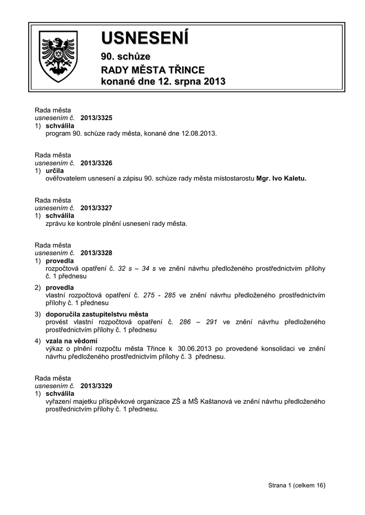 USNESENÍ 90. schůze RADY MĚSTA TŘINCE konané dne 12. srpna 2013 Rada města usnesením č. 2013/3325 1) schválila program 90. schůze rady města, konané dne 12.08.2013. Rada města usnesením č. 2013/3326 1) určila ověřovatelem usnesení a zápisu 90. schůze rady města místostarostu Mgr. Ivo Kaletu. Rada města usnesením č. 2013/3327 1) schválila zprávu ke kontrole plnění usnesení rady města. Rada města usnesením č. 2013/3328 1) provedla rozpočtová opatření č. 32 s – 34 s ve znění návrhu předloženého prostřednictvím přílohy č. 1 přednesu 2) provedla vlastní rozpočtová opatření č. 275 - 285 ve znění návrhu předloženého prostřednictvím přílohy č. 1 přednesu 3) doporučila zastupitelstvu města provést vlastní rozpočtová opatření č. 286 – 291 ve znění návrhu předloženého prostřednictvím přílohy č. 1 přednesu 4) vzala na vědomí výkaz o plnění rozpočtu města Třince k 30.06.2013 po provedené konsolidaci ve znění návrhu předloženého prostřednictvím přílohy č. 3 přednesu. Rada města usnesením č. 2013/3329 1) schválila vyřazení majetku příspěvkové organizace ZŠ a MŠ Kaštanová ve znění návrhu předloženého prostřednictvím přílohy č. 1 přednesu. Strana 1 (celkem 16) Rada města usnesením č. 2013/3330 1) rozhodla o výběru nejvhodnější nabídky dle pořadí nabídek, které stanovila a předložila radě města hodnotící komise, za účelem zadání veřejné zakázky malého rozsahu „Změna vytápění, výměna oken, GO rozvodů vody a kanalizace v obytném domě č. p. 62 na ul. Míru v Třinci“ takto: 1. Hamrozi, s. r. o., Třinec, Polní 411 IČ 258 42 544 2. ORLOTECH s. r. o., Orlová – Poruba, Žofinská 604 IČ 285 67 820 3. INPO spol. s r. o., Karviná – Fryštát, Nádražní 916/11 IČ 476 67 907 2) rozhodla uzavřít smlouvu o dílo č. 2013/05/424/Mu na realizaci rekonstrukce vytápění, rozvodů vody, kanalizace a výměnu oken obytného domu č. p. 62 na ul. Míru v Třinci mezi městem Třinec a firmou Hamrozi, s. r. o., se sídlem ve městě Třinec, Polní 411, PSČ 739 61, IČ 258 42 544, ve znění návrhu předloženého prostřednictvím přílohy č. 1 přednesu. Rada města usnesením č. 2013/3331 1) rozhodla vyhlásit veřejnou zakázku malého rozsahu na zhotovitele stavebních prací „Výměna oken v obytných domech č. p. 406 - 408 na ul. Jablunkovské v Třinci“ 2) schválila seznam uchazečů, kterým bude zaslána výzva k podání nabídky a zadávací dokumentace na veřejnou zakázku malého rozsahu uvedenou v bodě 1) usnesení, ve znění návrhu předloženého prostřednictvím přílohy č. 1 přednesu 3) rozhodla posuzovat nabídky pro zadání veřejné zakázky uvedenou v bodě 1) tohoto usnesení, podle hodnotícího kritéria, kterým je nejnižší nabídková cena. Rada města usnesením č. 2013/3332 1) rozhodla vyhlásit veřejnou zakázku dle § 38 (zjednodušené podlimitní řízení) zákona č. 137/2006 Sb., o veřejných zakázkách, ve znění pozdějších předpisů, na stavební práce s názvem „Generální oprava střech obytného domu na ul. nám. Míru č. p. 633-636, Třinec“ 2) schválila seznam uchazečů, kterým bude zaslána výzva k podání nabídky na veřejnou zakázku zadanou dle § 38 (zjednodušené podlimitní řízení) zákona č. 137/2006 Sb. o veřejných zakázkách na stavební práce s názvem „Generální oprava střech obytného domu na ul. nám. Míru č. p. 633-636, Třinec“ ve znění návrhu předloženého prostřednictvím přílohy č. 1 přednesu 3) rozhodla posuzovat nabídky pro zadání veřejné zakázky podle základního hodnotícího kritéria, kterým je nejnižší nabídková cena 4) rozhodla ustanovit komisi pro posouzení kvalifikace, pro otevírání obálek s nabídkami a současně pro jejich posouzení a hodnocení: Hodnotící komise RNDr. Věra Palkovská Mgr. Ivo Kaleta Mgr. Jana Gawlasová Ing. Jana Kafková Mgr. Rafał Zawadzki Náhradníci Ing. Ivo Kantor PhDr. Milada Hejmejová Ing. Patrik Žondor Margita Starzyková Mgr. Regina Klusová Strana 2 (celkem 16) 5) pověřila RNDr. Věru Palkovskou, starostku města, ke schválení a podepisování případných rozhodnutí o způsobu vyřízení námitek dle § 110 ve spojení s § 111 zákona č. 137/2006 Sb., o veřejných zakázkách, ve znění pozdějších předpisů, v rámci veřejné zakázky 6) schválila Zadávací dokumentaci na akci uvedenou v bodě 1) tohoto usnesení, ve znění návrhu předloženého prostřednictvím přílohy č. 2 přednesu. Rada města usnesením č. 2013/3333 1) rozhodla o výběru nejvhodnější nabídky dle pořadí nabídek, které stanovila a předložila radě města hodnotící komise, za účelem zadání veřejné zakázky „Statické a dopravní řešení ul. Štefánikové v Třinci“ takto: 1. 2. 3. 4. 5. EUROVIA CS, a. s., Národní 10, Praha 1 SWIETELSKY stavební, s. r. o., Suvorovova 538, Šenov u N. Jičína KR OSTRAVA a. s., Slívova 1946/7, Ostrava D5, akciová společnost, Třinec, Průmyslová 1026, Třinec Nehlsen Třinec, s. r. o., Jablunkovská 392, Třinec IČ 452 74 924 IČ 480 35 599 IČ 258 90 981 IČ 476 74 539 IČ 253 55 996 2) rozhodla v souladu s § 82 zákona č. 137/2006 Sb., o veřejných zakázkách, ve znění pozdějších předpisů, uzavřít smlouvu o dílo č. 2013/02/075/Cha na zhotovitele stavebních prací „Statické a dopravní řešení ul. Štefánikové v Třinci“ se společností EUROVIA CS, a. s., se sídlem Praha 1, Národní 10, PSČ 113 19, IČ 452 74 924, ve znění návrhu předloženého prostřednictvím přílohy č. 1 přednesu. Rada města usnesením č. 2013/3334 1) rozhodla vyhlásit veřejnou zakázku malého rozsahu „Parkoviště – parkovací plochy ul. Čapkova, Třinec“ 2) schválila seznam uchazečů, kterým bude zaslána výzva k podání nabídky na veřejnou z