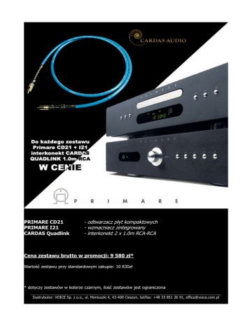 PRIMARE CD21 PRIMARE I21 CARDAS Quadlink - odtwarzacz płyt kompaktowych - wzmacniacz zintegrowany - interkonekt 2 x 1.0m RCA-RCA Cena zestawu brutto w promocji: 9 580 zł* Wartość zestawu przy standardowym zakupie: 10 830zł * dotyczy zestawów w kolorze czarnym, ilość zestawów jest ograniczona ___________________________________________________________________________ Dystrybutor: VOICE Sp. z o.o., ul. Moniuszki 4, 43-400 Cieszyn, tel/fax: +48 33 851 26 91, [email protected]