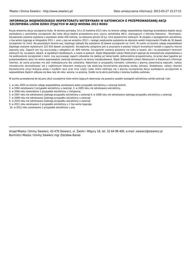 Miasto i Gmina Siewierz - http://www.siewierz.pl/ Data umieszczenia informacji: 2013-03-27 15:27:15 INFORMACJA WOJEWÓDZKIEGO INSPEKTORATU WETERYNARII W KATOWICACH O PRZEPROWADZANEJ AKCJI SZCZEPIENIA LISÓW DZIKO ŻYJĄCYCH W AKCJI WIOSNA 2013 ROKU Rusza wiosenna akcja szczepienia lisów. W okresie pomiędzy 14 a 23 kwietnia 2013 roku na terenie całego województwa śląskiego prowadzona będzie akcja wykładania z samolotów szczepionki dla lisów Akcja będzie prowadzona przy użyciu samolotów AN-2: startujących z lotniska Katowice - Muchowiec. Szczepionka zostanie wyłożona z wysokości około 200 metrów, na obszarze ponad 10 tys. km2 powierzchni zielonych. W związku z wystąpieniem wścieklizny u lisa wolno żyjącego w listopadzie 2011 r. oraz u psa we wrześniu 2012 r. nastąpi zwiększenie wyłożenia na obszarze wokół miejscowości Pradła do 30 dawek szczepionki na I km2. Na pozostałym terenie woj. śląskiego zakłada Się wyłożenie 20 dawek szczepionki na I km2. W sumie na terenie całego województwa śląskiego zostanie wyłożonych 222 810 dawek szczepionki. Szczepionka zatopiona jest w przynęcie w postaci małych brunatnych kostek o zapachu mocno zepsutej ryby. Zapach ten lisy wyczuwają z odległości ok. 800 metrów. Szczepionki zostaną wyłożone nie tylko w lasach, ale i na pozostałych terenach zielonych np. na polach, łąkach, w ogródkach działkowych, a nawet w parkach. Śląski Wojewódzki Lekarz Weterynarii apeluje do mieszkańców województwa o nie podnoszenie szczepionek z ziemi. Lisy wyczuwając zapach człowieka nie zjedzą już takiej kostki. Jednocześnie przypominamy, że przez dwa tygodnie po przeprowadzeniu akcji nie wolno wyprowadzać zwierząt domowych na tereny niezabudowane. Śląski Wojewódzki Lekarz Weterynarii w Katowicach informuje również, że sama przynęta nie jest niebezpieczna dla człowieka. Natomiast w przypadku kontaktu człowieka z płynną zawartością kapsułki, należy niezwłocznie skontaktować się z najbliższym lekarzem medycyny lub właściwą terytorialnie placówką służby zdrowia. Dodatkowo, należy również bezzwłocznie umyć bieżącą wodą z mydłem ręce oraz inne części ciała, które zetknęły się z płynną szczepionką Akcja wykładania szczepionek w województwie śląskim odbywa się dwa razy do roku: wiosną i w jesienią. Środki na tę akcie pochodzą z rezerwy budżetu państwa. W wyniku prowadzonej do tej pory akcji szczepienia lisów wolno żyjących obserwuje się poważny spadek wystąpień wścieklizny wśród zwierząt i tak: 1. w roku 2003 na terenie całego województwa zanotowano jeden przypadek wścieklizny u zwierząt dzikich, 2. w 2004 zanotowano 2 przypadki wścieklizny u zwierząt, 3. w 2005 roku nie odnotowano wścieklizny, 4. w 2006 roku stwierdzono 1 przypadek wścieklizny u nietoperza, 5. w 2007 roku nie odnotowano żadnego przypadku wścieklizny u zwierząt 6. w 2008 roku nie odnotowano żadnego przypadku wścieklizny u zwierząt 7. w 2009 roku nie odnotowano Żadnego przypadku wścieklizny u zwierząt 8. w 2010 roku nie odnotowano Żadnego przypadku wścieklizny u zwierząt 9. w 2011 roku zanotowano 1 przypadek wścieklizny u 1 lisa wolno tyjącego 10. w 2012 roku zanotowano 1 przypadek wścieklizny u psa. Urząd Miasta i Gminy Siewierz, 42-470 Siewierz, ul. Żwirki i WIgury 16, tel. 32 64 99 400, e-mail: [email protected] Burmistrz Miasta i Gminy Siewierz mgr Zdzisław Banaś