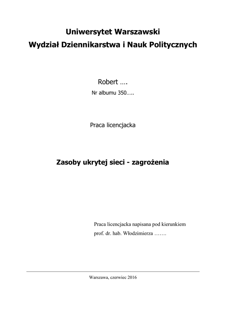 Uniwersytet Warszawski Wydział Dziennikarstwa i Nauk Politycznych Robert …. Nr albumu 350….. Praca licencjacka Zasoby ukrytej sieci - zagrożenia Praca licencjacka napisana pod kierunkiem prof. dr. hab. Włodzimierza ……. Warszawa, czerwiec 2016 Oświadczenie kierującego pracą Oświadczam, że niniejsza praca została przygotowana pod moim kierunkiem i stwierdzam, że spełnia ona warunki do przedstawienia jej w postępowaniu o nadanie tytułu zawodowego. Podpis kierującego pracą Data Oświadczenie autora pracy Świadom odpowiedzialności prawnej oświadczam, że niniejsza praca dyplomowa została napisana przez mnie samodzielnie i nie zawiera treści uzyskanych w sposób niezgodny z obowiązującymi przepisami. Oświadczam również, że przedstawiona praca nie była wcześniej przedmiotem procedur związanych z uzyskaniem tytułu zawodowego w wyższej uczelni. Oświadczam ponadto, że niniejsza wersja pracy jest identyczna z załączoną wersją elektroniczną. Data Podpis autora pracy Streszczenie pracy ………………… Temat pracy: ………………. Dziedzina pracy: ……………………. Słowa kluczowe: Internet, deep web, ukryta sieć, bezpieczeństwo, hidden web, głęboka sieć Tytuł w języku angielskim: The problem of the security with reference to the deep web resources Spis treści Streszczenie pracy ...................................................................................................................... 3 Wstęp .......................................................................................................................................... 4 1. Ogólna charakterystyka zjawiska ukrytej sieci ...................................................................... 4 1.1. Historia powstania ukrytej sieci i jej mechanika ............................................................. 5 1.2. Metody przeglądania oraz dostępu do ukrytej sieci ........................................................ 5 1.3. Wpływ ukrytej sieci na świat otaczający ......................................................................... 5 1.4. Ukryta sieć w polskiej perspektywie ............................................................................... 5 2. Bezpieczeństwo a ukryta sieć ................................................................................................. 5 2.1. Deep web a dark net ........................................................................................................ 5 2.2. Treści zagrażające naszemu bezpieczeństwu, człowieczeństwu ..................................... 5 2.3. Problem cyberterroryzmu w ukrytej sieci ....................................................................... 5 2.4. Dark net jako raj dla cyberprzestępców .......................................................................... 5 3. Własna analiza treści zamieszczonych w Ukrytym Internecie .............................................. 5 3.1. Własne spostrzeżenia dotyczące ukrytej sieci ................................................................. 5 3.2. Ocena użyteczności i legalności ukrytej sieci ................................................................. 5 3.3. Analiza wpływu jaki wywiera ukryta sieć na postrzeganie ............................................. 5 3.4. Wnioski analizy własnej oraz ankiety ............................................................................. 5 Zakończenie ............................................................................................................................... 5 Spis wykresów ............................................................................................................................ 6 Spis tabel .................................................................................................................................... 6 Spis rysunków ............................................................................................................................ 6 Bibliografia................................................................................................................................. 6 Bibliografia internetowa ............................................................................................................. 6 Wstęp 1. Ogólna charakterystyka zjawiska ukrytej sieci 1.1. Historia powstania ukrytej sieci i jej mechanika 1.2. Metody przeglądania oraz dostępu do ukrytej sieci 1.3. Wpływ ukrytej sieci na świat otaczający 1.4. Ukryta sieć w Polsce 2. Bezpieczeństwo a ukryta sieć 2.1. Deep web a dark net 2.2. Treści zagrażające naszemu bezpieczeństwu, człowieczeństwu 2.3. Problem cyberterroryzmu w ukrytej sieci 2.4. Dark net jako raj dla cyberprzestępców 3. Własna analiza treści zamieszczonych w Ukrytym Internecie 3.1. Własne spostrzeżenia dotyczące ukrytej sieci 3.2. Ocena użyteczności i legalności ukrytej sieci 3.3. Analiza wpływu jaki wywiera ukryta sieć na postrzeganie 3.4. Wnioski analizy własnej Zakończenie Spis wykresów Kilka przykładów Spis tabel Kilka przykładów Spis rysunków Kilka przykładów Bibliografia Kilka przykładów Bibliografia internetowa Kilka przykładów
