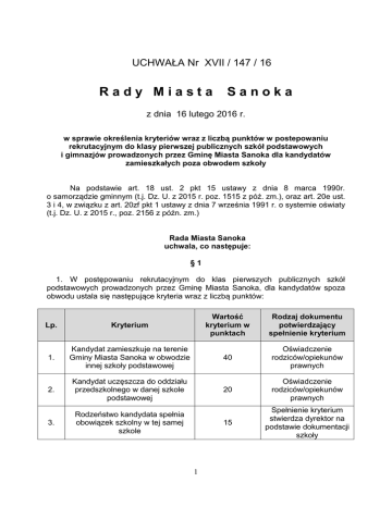 UCHWAŁA Nr XVII / 147 / 16 Rady Miasta Sanoka z dnia 16 lutego 2016 r. w sprawie określenia kryteriów wraz z liczbą punktów w postepowaniu rekrutacyjnym do klasy pierwszej publicznych szkół podstawowych i gimnazjów prowadzonych przez Gminę Miasta Sanoka dla kandydatów zamieszkałych poza obwodem szkoły Na podstawie art. 18 ust. 2 pkt 15 ustawy z dnia 8 marca 1990r. o samorządzie gminnym (t.j. Dz. U. z 2015 r. poz. 1515 z póź. zm.), oraz art. 20e ust. 3 i 4, w związku z art. 20zf pkt 1 ustawy z dnia 7 września 1991 r. o systemie oświaty (t.j. Dz. U. z 2015 r., poz. 2156 z późn. zm.) Rada Miasta Sanoka uchwala, co następuje: §1 1. W postępowaniu rekrutacyjnym do klas pierwszych publicznych szkół podstawowych prowadzonych przez Gminę Miasta Sanoka, dla kandydatów spoza obwodu ustala się następujące kryteria wraz z liczbą punktów: Wartość kryterium w punktach Rodzaj dokumentu potwierdzający spełnienie kryterium 1. Kandydat zamieszkuje na terenie Gminy Miasta Sanoka w obwodzie innej szkoły podstawowej 40 Oświadczenie rodziców/opiekunów prawnych 2. Kandydat uczęszcza do oddziału przedszkolnego w danej szkole podstawowej 20 Oświadczenie rodziców/opiekunów prawnych 3. Rodzeństwo kandydata spełnia obowiązek szkolny w tej samej szkole 15 Spełnienie kryterium stwierdza dyrektor na podstawie dokumentacji szkoły Lp. Kryterium 1 4. Kandydat uczęszcza do przedszkola położonego w obwodzie szkoły podstawowej do której składany jest wniosek 10 Oświadczenie rodziców/opiekunów prawnych 5. Samotne wychowanie kandydata w rodzinie 10 Oświadczenie rodziców/opiekunów prawnych 6. W obwodzie szkoły zamieszkują krewni kandydata wspierający rodziców/opiekunów prawnych w zapewnieniu mu należytej opieki 5 Oświadczenie rodziców/opiekunów prawnych 2. W postępowaniu rekrutacyjnym do klas pierwszych publicznych gimnazjów prowadzonych przez Gminę Miasta Sanoka, dla kandydatów spoza obwodu ustala się następujące kryteria wraz z liczbą punktów: Lp. Kryterium Wartość kryterium w punktach Rodzaj dokumentu potwierdzający spełnienie kryterium 1. Kandydat zamieszkuje na terenie Gminy Miasta Sanoka w obwodzie innego gimnazjum 40 Oświadczenie rodziców/opiekunów prawnych 2. Rodzeństwo kandydata spełnia obowiązek szkolny w tym samym gimnazjum 20 Spełnienie kryterium stwierdza dyrektor na podstawie dokumentacji szkoły 3. Kandydat uczęszcza do szkoły podstawowej prowadzonej przez Gminę Miasta Sanoka 15 Oświadczenie rodziców/opiekunów prawnych 4. Ukończenie szkoły podstawowej z wyróżnieniem 10 Świadectwo ukończenia szkoły 5. Samotne wychowywanie kandydata w rodzinie 10 Oświadczenie rodziców/opiekunów prawnych 6. Rodzeństwo kandydata uczęszcza do innej szkoły, przedszkola na terenie Gminy Miasta Sanoka 5 Oświadczenie rodziców/opiekunów prawnych 3. W przypadku równorzędnych wyników uzyskanych w postępowaniu rekrutacyjnym do klasy pierwszej publicznej szkoły podstawowej lub publicznego gimnazjum dla kandydatów spoza obwodu, o pierwszeństwie przyjęcia decyduje: 2 Wartość kryterium w punktach Kryterium: Rodzaj dokumentu potwierdzający spełnienie kryterium Praca zarobkowa na terenie Gminy Miasta Sanoka: a). obydwojga rodziców/opiekunów prawnych, 10 b). jednego rodzica/opiekuna prawnego 5 Oświadczenie o zatrudnieniu lub prowadzeniu działalności gospodarczej §2 Wykonanie uchwały powierza się Burmistrzowi Miasta Sanoka. §3 Uchwała wchodzi w życie po upływie 14 dni od dnia ogłoszenia w Dzienniku Urzędowym Województwa Podkarpackiego. Przewodniczący Rady Miasta Zbigniew Daszyk 3