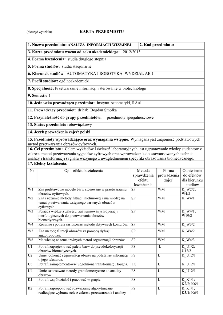 (pieczęć wydziału) KARTA PRZEDMIOTU 1. Nazwa przedmiotu: ANALIZA INFORMACJI WIZYJNEJ 2. Kod przedmiotu: 3. Karta przedmiotu ważna od roku akademickiego: 2012/2013 4. Forma kształcenia: studia drugiego stopnia 5. Forma studiów: studia stacjonarne 6. Kierunek studiów: AUTOMATYKA I ROBOTYKA; WYDZIAŁ AEiI 7. Profil studiów: ogólnoakademicki 8. Specjalność: Przetwarzanie informacji i sterowanie w biotechnologii 9. Semestr: 1 10. Jednostka prowadząca przedmiot: Instytut Automatyki, RAu1 11. Prowadzący przedmiot: dr hab. Bogdan Smołka 12. Przynależność do grupy przedmiotów: przedmioty specjalnościowe 13. Status przedmiotu: obowiązkowy 14. Język prowadzenia zajęć: polski 15. Przedmioty wprowadzające oraz wymagania wstępne: Wymagana jest znajomość podstawowych metod przetwarzania obrazów cyfrowych. 16. Cel przedmiotu: Celem wykładów i ćwiczeń laboratoryjnych jest ugruntowanie wiedzy studentów z zakresu metod przetwarzania sygnałów cyfrowych oraz wprowadzenie do zaawansowanych technik analizy i transformacji sygnału wizyjnego z uwzględnieniem specyfiki obrazowania biomedycznego. 17. Efekty kształcenia: Nr W1 W2 W3 W4 W5 W6 U1 U2 U3 U4 K1 K2 Opis efektu kształcenia Metoda sprawdzenia efektu kształcenia Forma Odniesienie prowadzenia do efektów zajęć dla kierunku studiów Zna podstawowe modele barw stosowane w przetwarzaniu obrazów cyfrowych. Zna i rozumie metody filtracji nieliniowej i ma wiedzę na temat przetwarzania wstępnego barwnych obrazów cyfrowych. Posiada wiedzę z zakresu zaawansowanych operacji morfologicznych do przetwarzania obrazów biomedycznych. Rozumie i potrafi zastosować metodę aktywnych konturów. SP WM SP WM SP WM K_W4/1; W19/2 SP WM K_W3/2 Zna metodę filtracji obrazów za pomocą dyfuzji anizotropowej. Ma wiedzę na temat różnych metod segmentacji obrazów. SP WM K_W4/2 SP WM K_W4/3 L L K_U1/2; U12/2 K_U12/1 L K_U12/1 Potrafi zaprojektować palety barw do pseudokoloryzacji PS obrazów biomedycznych. Umie dokonać segmentacji obrazu na podstawie informacji PS o jego teksturze. Potrafi zaimplementować uogólnioną transformatę Hougha. PS K_W2/2; W4/2 K_W4/1 Umie zastosować metody granulometryczne do analizy obrazów. Potrafi współdziałać i pracować w grupie. PS L K_U12/1 PS L Potrafi zaproponować rozwiązanie algorytmiczne realizujące wybrane cele z zakresu przetwarzania i analizy PS L K_K1/1; K2/2; K6/1 K_K1/1; K5/1; K6/1 cyfrowych obrazów biomedycznych. K7/1 Wykład Wybrane zagadnienia psychofizjologii widzenia. Przestrzenie barw stosowane w grafice komputerowej i przetwarzaniu obrazów. Wybrane metody akwizycji obrazów biomedycznych. Analiza granulometryczna obrazów biomedycznych. Nieliniowe metody redukcji szumów w obrazach monochromatycznych i wielokanałowych. Zastosowanie dyfuzji anizotropowej do poprawy jakości obrazów rentgenowskich i ultrasonograficznych. Pseudokoloryzacja monochromatycznych obrazów mikroskopowych. Detekcja obiektów metodą uogólnionej transformaty Hougha. Metody segmentacji obrazów. Zaawansowane metody morfologii matematycznej. Detekcja krawędzi w barwnych obrazach cyfrowych. Zastosowanie metody aktywnych konturów w segmentacji obrazów. Analiza tekstury w obrazach mikroskopowych. Zajęcia laboratoryjne 1. Zastosowanie statystyk porządkowych w redukcji szumów barwnych obrazów cyfrowych. 2. Zastosowanie dyfuzji anizotropowej do poprawy jakości obrazów. 3. Ekstrakcja cech obiektów w obrazach jednokomórkowej elektroforezy żelowej. 4. Przetwarzanie wstępne, detekcja okręgów i analiza obrazów mikromacierzy cDNA. 5. Zastosowanie metod morfologicznych w detekcji mikrozwapnień w obrazach mammografii cyfrowej. 6. Zastosowanie metody aktywnych konturów w segmentacji obrazów ultrasonograficznych. 7. Zastosowanie metod analizy tekstur do detekcji obiektów w obrazach biomedycznych. 8. Pseudokoloryzacja obrazów cyfrowych. 9. Segmentacja obrazów biomedycznych. 10. Przetwarzanie sekwencji obrazów. 20. Egzamin: tak 21. Literatura podstawowa: 1. Tadeusiewicz R., Korohoda P., Komputerowa analiza i przetwarzanie obrazów, Wydawnictwo Fundacji Postępu Telekomunikacji, Kraków 1997, (książka dostępna on-line). 2. Wróbel Z., Koprowski R., Praktyka przetwarzania obrazów w programie MATLAB,Wydawnictwo EXIT, Warszawa, 2004. 3. Zabrodzki J, (Red.), Grafika komputerowa. Metody i narzędzia, Warszawa, WNT 1994. 4. Zieliński K.W., Strzelecki M., Komputerowa analiza obrazu biomedycznego, Wstęp do morfometrii i patologii ilościowej, Wydawnictwo Naukowe PWN, 2002. 22. Literatura uzupełniająca: 1. Pratt W., Digital Image Processing, John Willey & Sons, 1991 2. Castleman K.R., Digital Image Processing, Prentice-Hall, Englewood Cliffs, 1996 3. Jaehne B., Practical Handbook on Image Processing for Scientific Applications, CRC PRESS, 1997 4. Russ J.C., The image processing handbook, Boca Raton, CRC Press, 2006. 23. Nakład pracy studenta potrzebny do osiągnięcia efektów kształcenia Lp. Forma zajęć 1 Wykład 2 Ćwiczenia 3 Laboratorium 4 Projekt 0/0 5 Seminarium 0/0 6 Inne 5/15 Suma godzin 50/70 Liczba godzin kontaktowych / pracy studenta 15/10 0/0 30/45 24. Suma wszystkich godzin: 120 25. Liczba punktów ECTS: 4 26. Liczba punktów ECTS uzyskanych na zajęciach z bezpośrednim udziałem nauczyciela akademickiego: 3 27. Liczba punktów ECTS uzyskanych na zajęciach o charakterze praktycznym (laboratoria, projekty): 2 26. Uwagi: Zatwierdzono: ……………………………. ………………………………………………… (data i podpis prowadzącego) (data i podpis dyrektora instytutu/kierownika katedry/ Dyrektora Kolegium Języków Obcych/kierownika lub dyrektora jednostki międzywydziałowej)