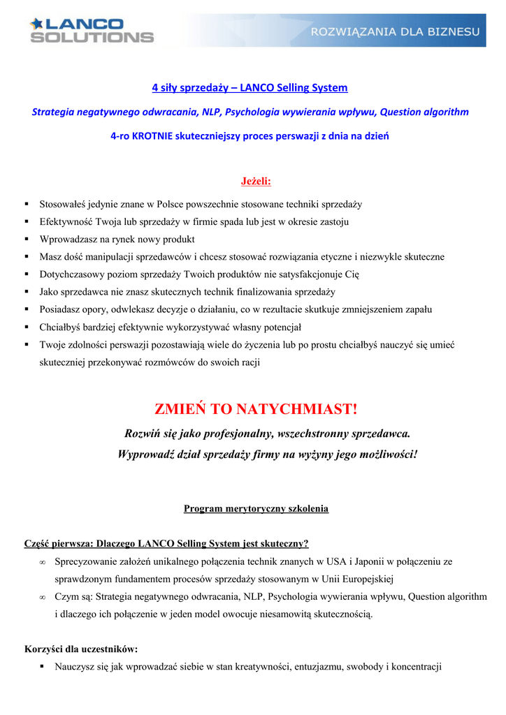 4 siły sprzedaży – LANCO Selling System Strategia negatywnego odwracania, NLP, Psychologia wywierania wpływu, Question algorithm 4-ro KROTNIE skuteczniejszy proces perswazji z dnia na dzień Jeżeli: Stosowałeś jedynie znane w Polsce powszechnie stosowane techniki sprzedaży Efektywność Twoja lub sprzedaży w firmie spada lub jest w okresie zastoju Wprowadzasz na rynek nowy produkt Masz dość manipulacji sprzedawców i chcesz stosować rozwiązania etyczne i niezwykle skuteczne Dotychczasowy poziom sprzedaży Twoich produktów nie satysfakcjonuje Cię Jako sprzedawca nie znasz skutecznych technik finalizowania sprzedaży Posiadasz opory, odwlekasz decyzje o działaniu, co w rezultacie skutkuje zmniejszeniem zapału Chciałbyś bardziej efektywnie wykorzystywać własny potencjał Twoje zdolności perswazji pozostawiają wiele do życzenia lub po prostu chciałbyś nauczyć się umieć skuteczniej przekonywać rozmówców do swoich racji ZMIEŃ TO NATYCHMIAST! Rozwiń się jako profesjonalny, wszechstronny sprzedawca. Wyprowadź dział sprzedaży firmy na wyżyny jego możliwości! Program merytoryczny szkolenia Część pierwsza: Dlaczego LANCO Selling System jest skuteczny? • Sprecyzowanie założeń unikalnego połączenia technik znanych w USA i Japonii w połączeniu ze sprawdzonym fundamentem procesów sprzedaży stosowanym w Unii Europejskiej • Czym są: Strategia negatywnego odwracania, NLP, Psychologia wywierania wpływu, Question algorithm i dlaczego ich połączenie w jeden model owocuje niesamowitą skutecznością. Korzyści dla uczestników: Nauczysz się jak wprowadzać siebie w stan kreatywności, entuzjazmu, swobody i koncentracji Pozbędziesz się w ciągu kilku chwil krytycznych głosów wewnętrznych podcinających skrzydła procesu sprzedaży Odkryjesz nieograniczone zasoby ukryte w Twoim umyśle Nauczysz się kontrolować własne emocje poprzez intensyfikowanie pożądanych stanów, dzięki czemu będziesz w stanie budować spójność przekazu i władzę swoich argumentów w rozmowie z klientem Część druga: Budowanie zaufania Strategia negatywnego odwracania Strategie skutecznego budowania rapportu: pacing, leading Systemy reprezentacji Submodalności Korzyści dla uczestników: Poznasz metody skutecznego budowania zaufania klienta na poziomie werbalnym i niewerbalnym Nauczysz się jak zaprezentować ofertę aby wszystkie obiekcje klienta zniknęły Będziesz umiał utrzymać doskonały kontakt z rozmówcą Nauczysz się stosować narzędzia perswazji na poziomie podświadomym Część trzecia: Klucze do umysłu klienta kluczami do zamknięcia sprzedaży Poziomy neurologiczne sprzedaży Język klienta kluczem do skutecznej sprzedaży Metaprogramy w skutecznej komunikacji Korzyści dla uczestników: Nauczysz się jak zmieniać myśli, przekonania i decyzje drugiej osoby przy zastosowaniu odpowiednich pytań Poznasz słowa klucze do drugiej osoby Nauczysz się metod nadawania swoim słowom potęgi oddziaływania Będziesz umiał zabezpieczyć się przed oporem klienta zanim on jeszcze nastąpi Poznasz techniki zamykania sprzedaży Nauczysz się tworzyć oferty, ulotki, teksty reklamowe przyciągające znacznie więcej klientów niż dotychczas Część czwarta: Psychologiczne metody wywierania wpływu Wykorzystanie reguły niedostępności Efektywność zastosowania reguł wzajemności Dopasowania niewerbalne Budowanie autorytetu Społeczne reguły wywierania wpływu Korzyści dla uczestników: • Nauczysz się jak momentalnie wytworzyć atmosferę zaufania • Dowiesz się jak wywołać stany konsekwentnej sprzedaży u klientów. • Poznają skuteczne wzorce językowe, dzięki czemu staniesz się ekspertem języka perswazji i wywierania wpływu • Nabędziesz umiejętność zamiany klienta okazjonalnego w klienta stałego • Nauczysz się jak wywołał u klienta natychmiastowe pożądanie zakupu Opinie naszych klientów: Wybierz termin spośród podanych poniżej: Warszawa – piątek -18.12.2015, godz. 9-17, Hotel Marriott lub Centrum Szkoleniowe Sopot – 14.12.2015, godz. 9-17, Grand Hotel Sopot Cena: 699zł + VAT. UWAGA! Przy wpłacie do dnia 11 grudnia cena tylko 479zł! 20% zniżki przy zgłoszeniu co najmniej 3 osób z tej samej firmy. W cenie: autorskie materiały szkoleniowe, przerwy kawowe, poczęstunek, konsultacje poszkoleniowe, certyfikat, indywidualny program rozwoju kompetencji sprzedażowych i motywacji. . Płatność: Nr rachunku bankowego: Lanco Solutions, Alior Bank S.A. 02 2490 0005 0000 4500 7157 1986 Z poważaniem Jakub Łańcucki Dyrektor Zarządzający Head Coach tel.kom: 666-318-113 Lanco Solutions www.lanco.pl [email protected]