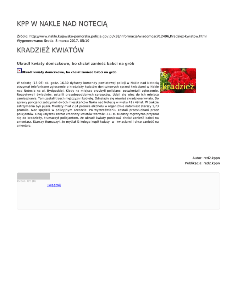 KPP W NAKLE NAD NOTECIĄ Źródło: http://www.naklo.kujawsko-pomorska.policja.gov.pl/k38/informacje/wiadomosci/12496,Kradziez-kwiatow.html Wygenerowano: Środa, 8 marca 2017, 05:10 KRADZIEŻ KWIATÓW Ukradł kwiaty doniczkowe, bo chciał zanieść babci na grób Ukradł kwiaty doniczkowe, bo chciał zanieść babci na grób W sobotę (13.06) ok. godz. 16.30 dyżurny komendy powiatowej policji w Nakle nad Notecią otrzymał telefoniczne zgłoszenie o kradzieży kwiatów doniczkowych sprzed kwiaciarni w Nakle nad Notecią na ul. Bydgoskiej. Kiedy na miejsce przybyli policjanci potwierdzili zgłoszenie. Rozpytywali świadków, ustalili prawdopodobnych sprawców. Udali się więc do ich miejsca zamieszkania. Tam zastali trzech mężczyzn i kobietę. Odnalazły się również skradzione kwiaty. Do sprawy policjanci zatrzymali dwóch mieszkańców Nakła nad Notecią w wieku 41 i 49 lat. W trakcie zatrzymania byli pijani. Młodszy miał 2,84 promila alkoholu w organiźmie natomiast starszy 1,73 promila. Noc spędzili w policyjnym areszcie. Po wytrzeźwieniu zostali przesłuchani przez policjantów. Obaj usłyszeli zarzut kradzieży kwiatów wartości 311 zł. Młodszy mężczyzna przyznał się do kradzieży, tłumaczył policjantom, że ukradł kwiaty ponieważ chciał zanieść babci na cmentarz. Starszy tłumaczył, że myślał iż kolega kupił kwiaty w kwiaciarni i chce zanieść na cmentarz. Autor: red2.kppn Publikacja: red2.kppn Ocena: 0/5 (0) Tweetnij