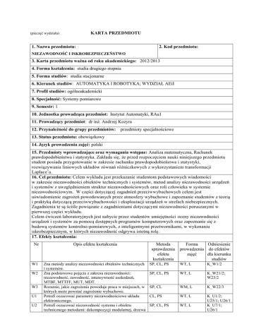 (pieczęć wydziału) KARTA PRZEDMIOTU 1. Nazwa przedmiotu: 2. Kod przedmiotu: NIEZAWODNOŚĆ I ISKROBEZPIECZEŃSTWO 3. Karta przedmiotu ważna od roku akademickiego: 2012/2013 4. Forma kształcenia: studia drugiego stopnia 5. Forma studiów: studia stacjonarne 6. Kierunek studiów: AUTOMATYKA I ROBOTYKA; WYDZIAŁ AEiI 7. Profil studiów: ogólnoakademicki 8. Specjalność: Systemy pomiarowe 9. Semestr: 1 10. Jednostka prowadząca przedmiot: Instytut Automatyki, RAu1 11. Prowadzący przedmiot: dr inż. Andrzej Kozyra 12. Przynależność do grupy przedmiotów: przedmioty specjalnościowe 13. Status przedmiotu: obowiązkowy 14. Język prowadzenia zajęć: polski 15. Przedmioty wprowadzające oraz wymagania wstępne: Analiza matematyczna, Rachunek prawdopodobieństwa i statystyka. Zakłada się, że przed rozpoczęciem nauki niniejszego przedmiotu student posiada przygotowanie w zakresie rachunku prawdopodobieństwa i statystyki, rozwiązywania liniowych układów równań różniczkowych z wykorzystaniem transformacji Laplace’a. 16. Cel przedmiotu: Celem wykładu jest przekazanie studentom podstawowych wiadomości w zakresie niezawodności obiektów technicznych i systemów, metod analizy niezawodności urządzeń i systemów z uwzględnieniem struktur niezawodnościowych oraz roli człowieka w systemie niezawodnościowym. W części dotyczącej zagadnień przeciwwybuchowych celem jest uświadomienie zagrożeń powodowanych przez atmosfery wybuchowe i zapoznanie studentów z teorią i praktyką dotyczącą przeciwwybuchowości i eksploatacji urządzeń w strefach niebezpiecznych. Zagadnienia te są ściśle powiązane z zagadnieniami dotyczącymi niezawodności poruszanymi w pierwszej części wykładu. Celem ćwiczeń laboratoryjnych jest nabycie przez studentów umiejętności oceny niezawodności urządzeń i systemów za pomocą dostępnych programów komputerowych oraz zapoznanie się z budową systemów kontrolno-pomiarowych, z inteligentnymi przetwornikami, w wykonaniu iskrobezpiecznym, w których niezawodność odgrywa istotną rolę. 17. Efekty kształcenia: Nr W1 W2 W3 U1 U2 Opis efektu kształcenia Zna metody analizy niezawodności obiektów technicznych i systemów. Zna podstawowe pojęcia z zakresu niezawodności: niezawodność, zawodność, intensywność uszkodzeń, MTBF, MTTFF, MUT, MDT. Rozumie, jakie zagrożenia powoduje praca w miejscach, w których może powstać zagrożenie wybuchowe. Potrafi oszacować parametry niezawodnościowe układu elektronicznego. Potrafi oszacować niezawodność systemu i obiektu technicznego metodami: dekompozycji modularnej, drzewa Metoda sprawdzenia efektu kształcenia Forma Odniesienie prowadzenia do efektów zajęć dla kierunku studiów SP, CL, PS WT, L K_W1/2 SP, CL, PS WT, L K_W21/2; W23/2 SP, CL WM, L K_W22/3 CL, PS WT, L SP, CL, PS WT, L K_U1/2; U25/1; U26/1 K_U7/1; U26/1 U3 K1 K2 zdarzeń, modelowania za pomocą procesów Markowa. Potrafi oszacować prawdopodobieństwo popełnienia błędu przez człowieka Ma świadomość, jakie konsekwencje mogą powodować zaniedbania w zakresie niezawodności, bezpieczeństwa, niewłaściwej eksploatacji urządzeń w strefach zagrożonych wybuchem. Potrafi zaprezentować i obronić zaproponowane metody szacowania niezawodności. CL WT, L CL, PS WM, L OS L K_U25/1; U26/1 K_K2/3; K6/2; K7/1 K_K1/1; K5/1; K6/1 K7/1 18. Formy zajęć dydaktycznych i ich wymiar (liczba godzin) W. : 15 Ćw. : L.: 30 19. Treści kształcenia: Wykład Niezawodność: 1. Wprowadzenie do przedmiotu; Podstawowe pojęcia: cechy mierzalne i niemierzalne, czynniki wymuszające, element, system, uszkodzenia obiektów, niezawodność R(t), częstotliwość uszkodzeń f(t), intensywność uszkodzeń λ(t). 2. Rozkłady prawdopodobieństwa stosowane w niezawodności. Wzór Wienera. Średni czas pracy do pierwszego uszkodzenia (MTTFF). Wykładnicze prawo niezawodności. Krzywa wannowa. 3. Szacowanie niezawodności obiektów technologicznych. Szacowanie niezawodności układów elektronicznych. Norma MilHdbk 217. 4. Struktury niezawodnościowe: statyczne (szeregowa, równoległa, progowa), dynamiczne (kaskadowa, hybrydowa). Metody dekompozycji modularnej, drzewa uszkodzeń, grafu stanów. Rezerwowanie. 5. Model niezawodnościowy systemu nienaprawialnego: założenia, graf, macierz stanów, równania stanów, obliczanie miar niezawodności: R(t), λ, MTTFF. 6. Model niezawodnościowy systemu naprawialnego: założenia, graf, macierz stanów, równania stanów, miary niezawodności dla systemu naprawialnego: funkcja gotowości A(t) i współczynnik gotowości A, MTBF, prawdopodobieństwo poprawnej pracy do uszkodzenia Rs1(t), MTTFF, MDT, MUT. 7. Obsługa systemu: problem konserwatora. Wpływ błędu krytycznego człowieka na niezawodność; Metoda HEART szacowania prawdopodobieństwa popełnienia błędu przez człowieka. 8. Wpływ kontroli stanu na niezawodność. Iskrobezpieczeństwo: 9. Charakterystyka gazów, par i pyłów pod względem wybuchowości. Klasyfikacje: gazów, pyłów, urządzeń i pomieszczeń. 10. Rodzaje budowy przeciwwybuchowej. Podstawowe pojęcia dla budowy iskrobezpiecznej: prawdopodobieństwo zapalenia, minimalna energia zapłonu, minimalny prąd zapalający, współczynnik bezpieczeństwa, mieszanina probiercza, iskiernik IEC, obwody kontrolne, procedura atestacyjna. Sposób przeprowadzania atestacji. Iskiernik IEC. Procedura atestacyjna. Oznakowanie urządzeń i systemów. 11. Osiąganie iskrobezpieczeństwa dla urządzeń zlokalizowanych w strefie bezpiecznej, linii łączącej i urządzeń zlokalizowanych w strefie niebezpiecznej. Metoda barier (Zenera i galwanicznej) i jej wykorzystanie do budowy systemów iskrobezpiecznych. 12. Współczynnik bezpieczeństwa w ujęciu niezawodnościowym. Model niezawodnościowy systemu iskrobezpiecznego. Średni czas między wybuchami, jako miara bezpieczeństwa systemu. Wyjaśnienie zagadnienia statystycznego definiowania współczynnika bezpieczeństwa. 13. Norma